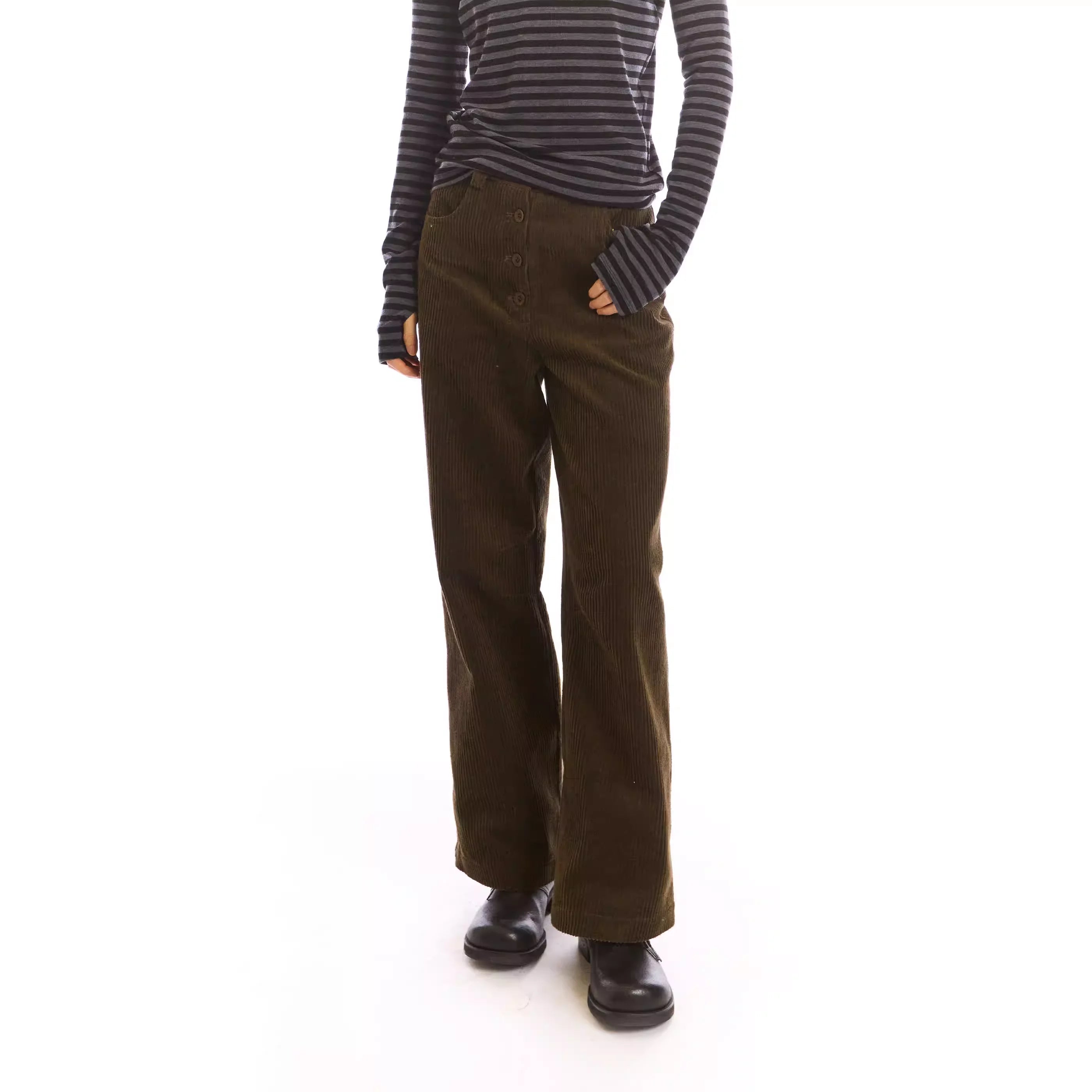 Elevate your casual wardrobe with these stylish women's high-waisted corduroy pants. Designed with a relaxed wide-leg silhouette, they feature a soft, textured corduroy fabric in a rich brown hue. The front button fly showcases four visible buttons, adding a touch of vintage charm. Perfect for everyday wear, these pants combine comfort and fashion effortlessly.