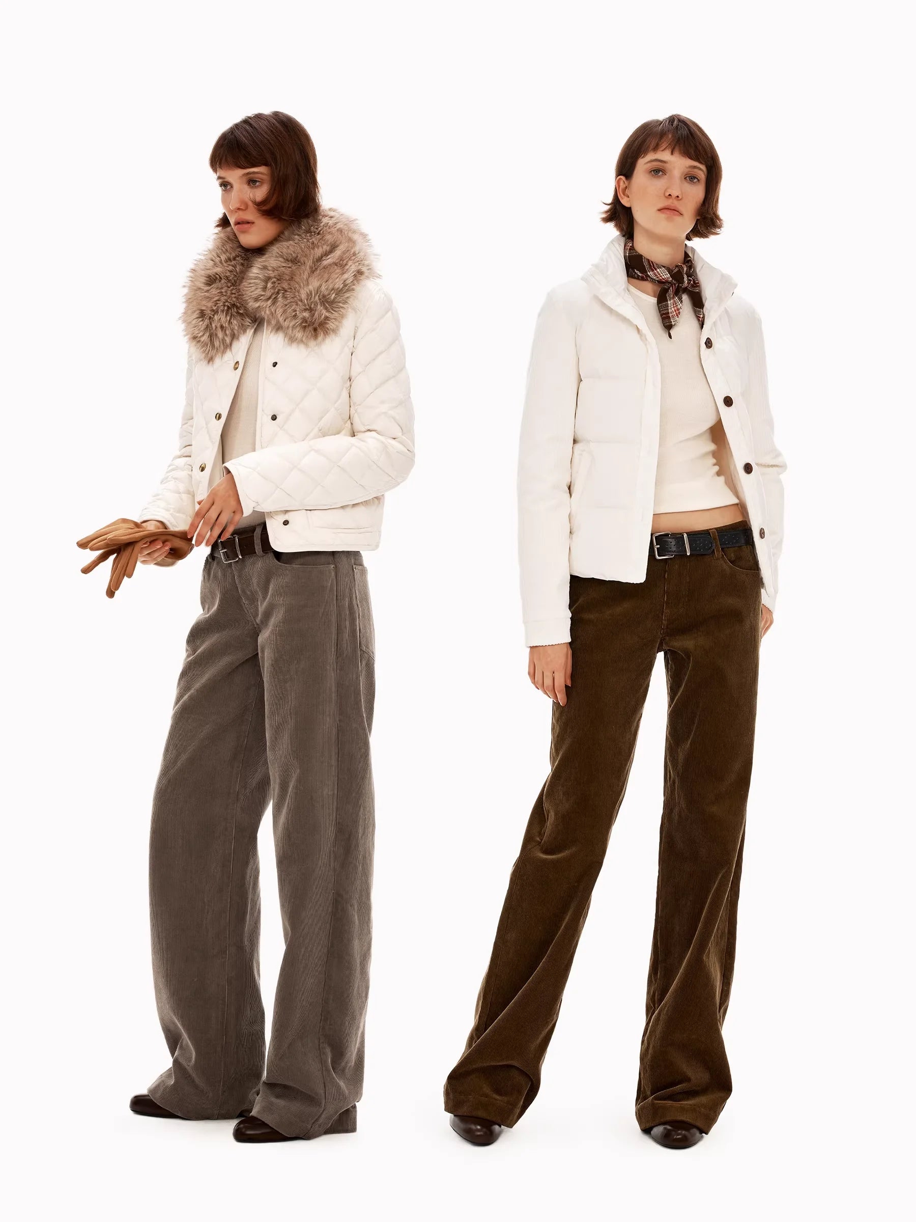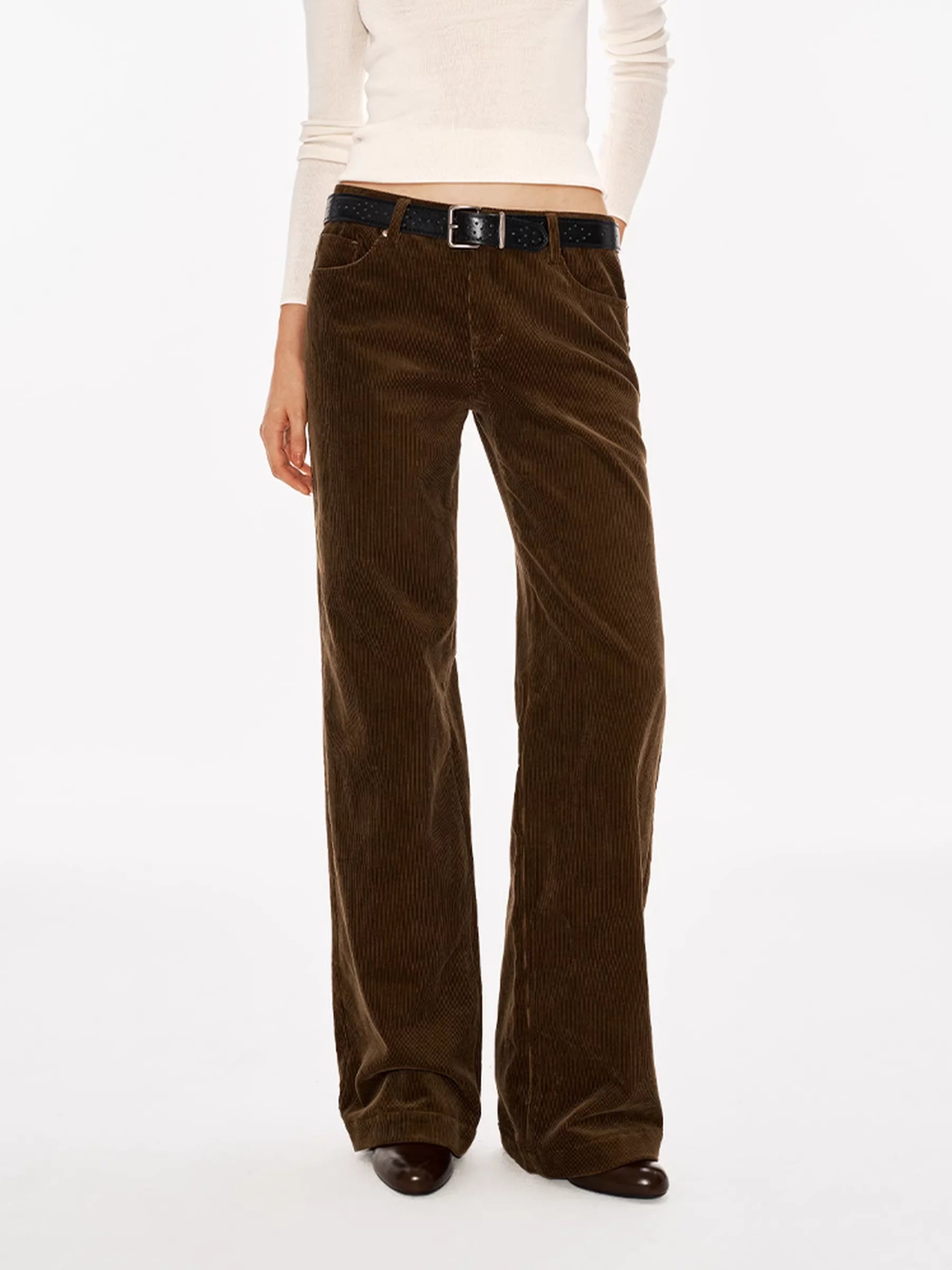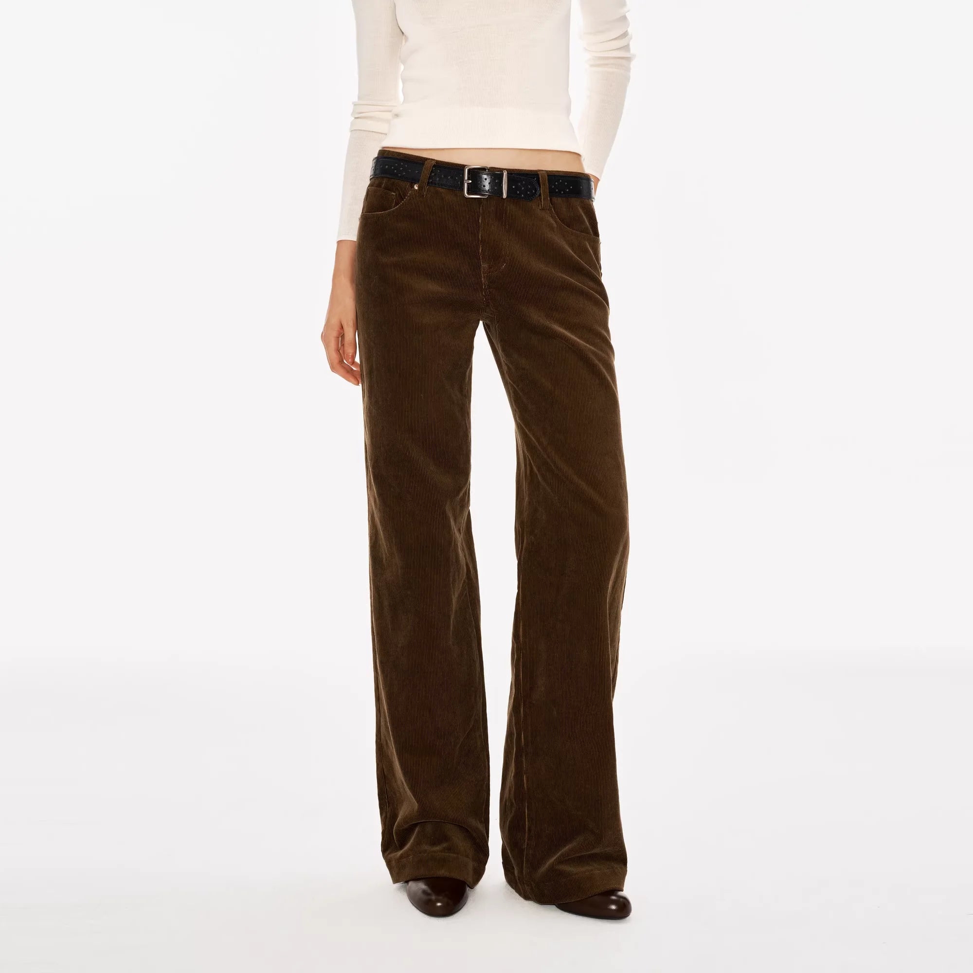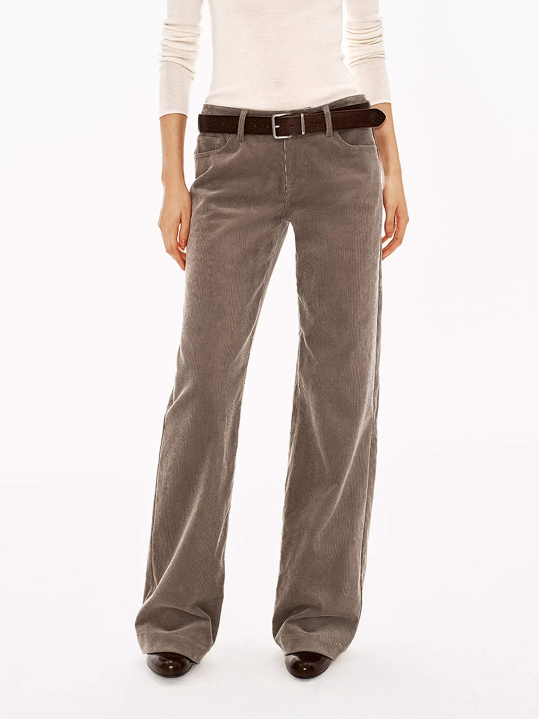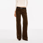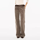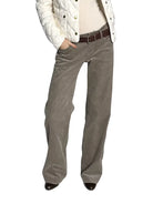 These women's corduroy pants are crafted from heavyweight 380G fabric, offering both comfort and durability. Featuring a high-waisted fit and wide-leg silhouette, they deliver a relaxed and vintage-inspired look. Designed in a muted taupe or grey-brown tone, the pants include front and back pockets, subtle seam details, and a dark brown belt accent. Pair them effortlessly with tucked-in tops for a chic, casual ensemble.