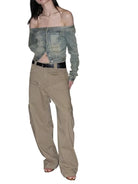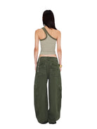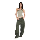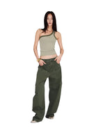 Designed for a bold, streetwear-inspired look, these oversized utility cargo pants feature a relaxed wide-leg silhouette and visible seam detailing. Crafted in a versatile olive green shade, they offer both comfort and edge. Styled here by a female model, these pants pair effortlessly with standout accessories or casual basics for a fashion-forward ensemble.