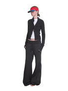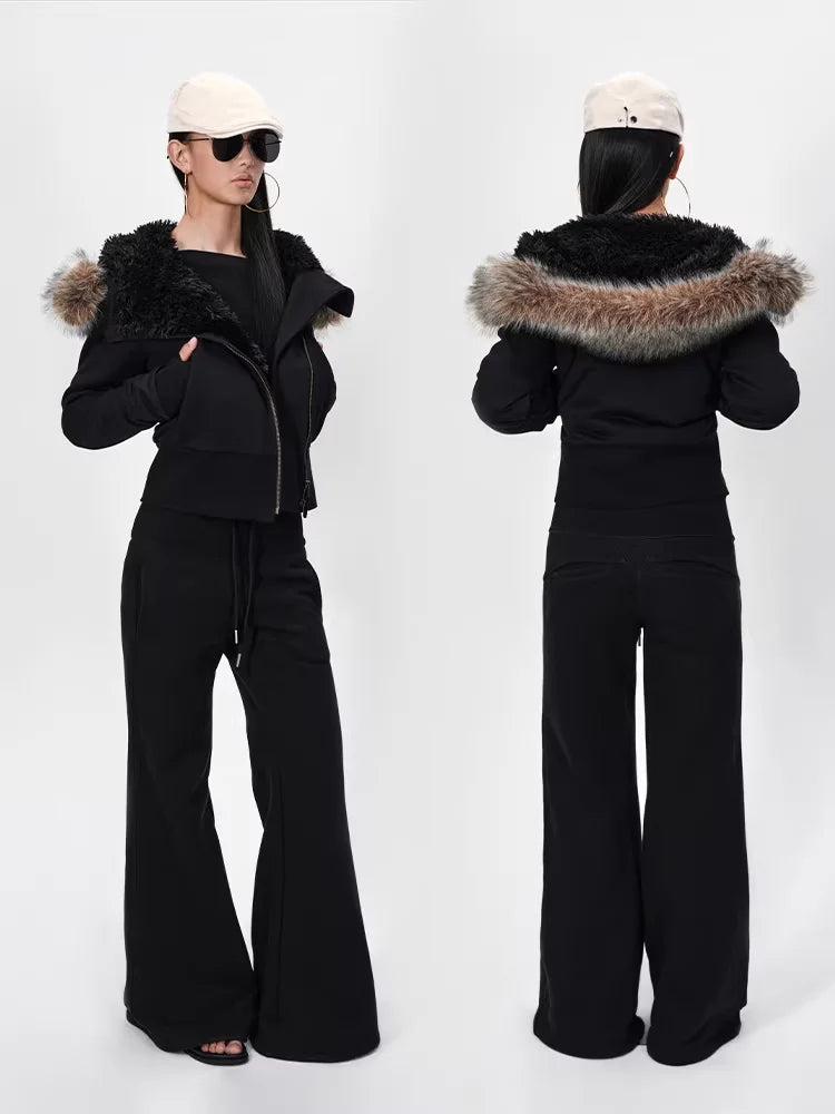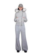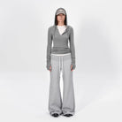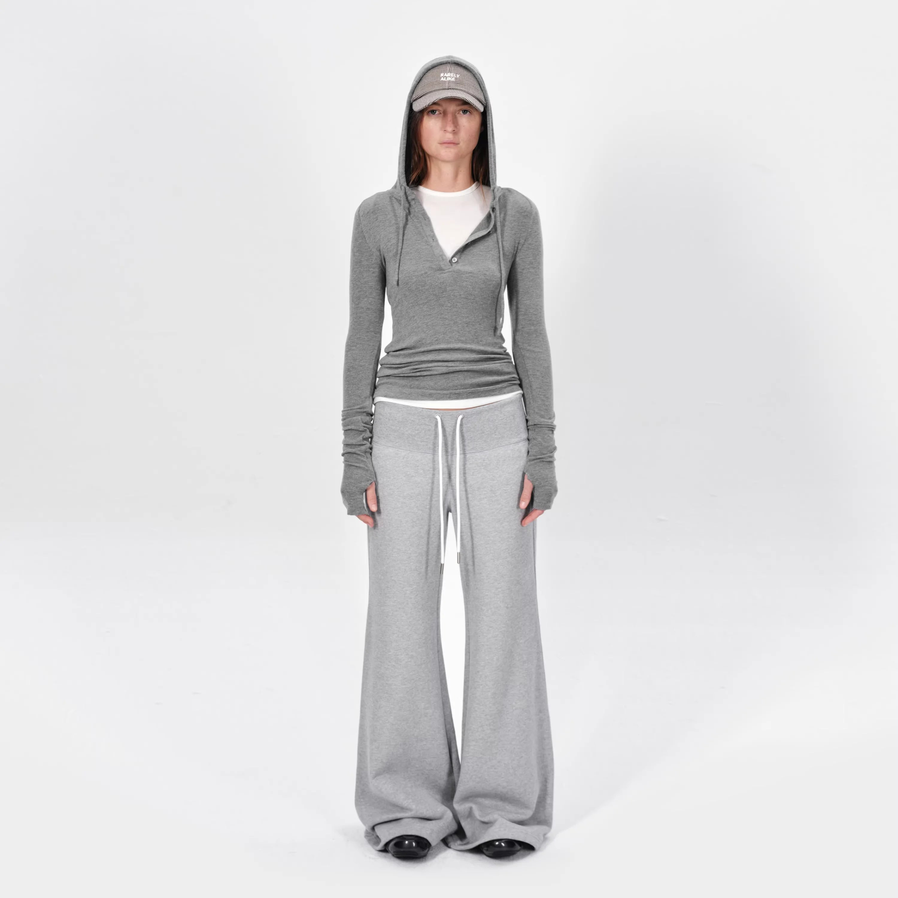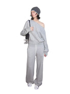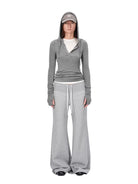 These women's flared sweatpants combine comfort with contemporary streetwear style. Featuring a wide ribbed waistband with an adjustable drawstring, they are designed to drape effortlessly for a flattering silhouette. The soft fabric ensures all-day comfort, while the flared leg offers a fashion-forward look. Available in versatile shades of black, light gray, and charcoal gray, these sweatpants are perfect for lounging or casual outings.