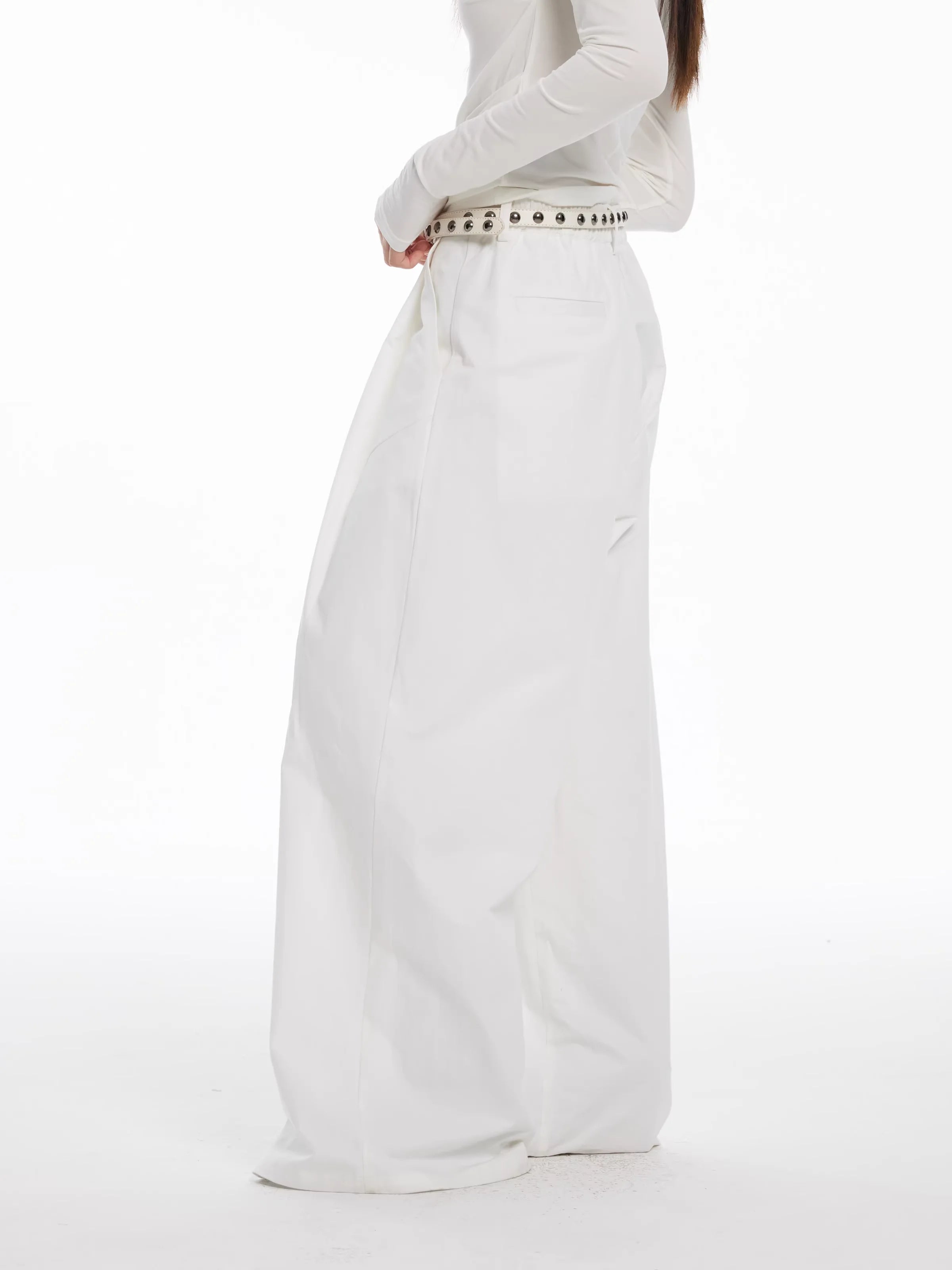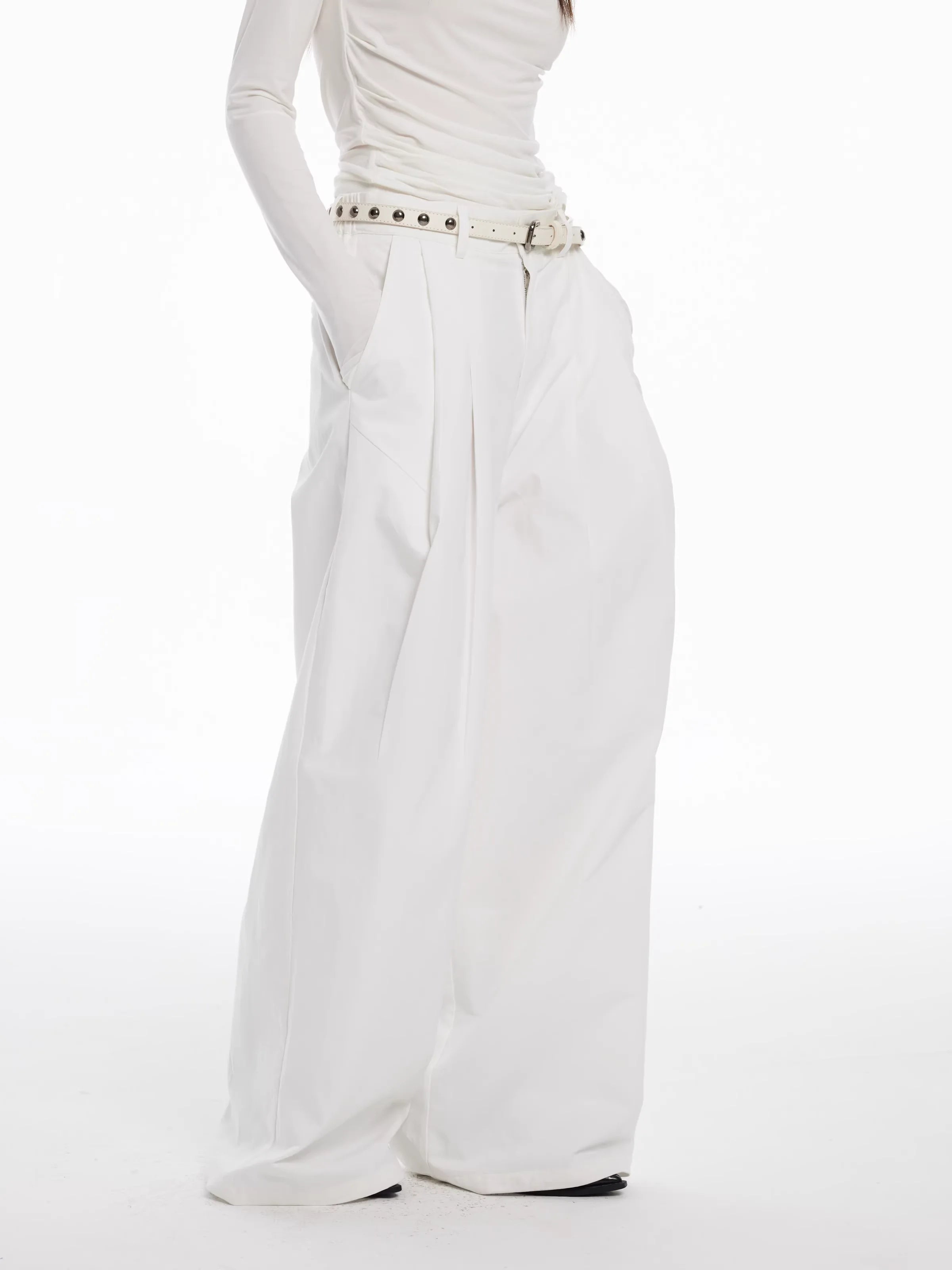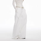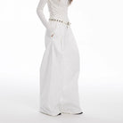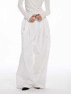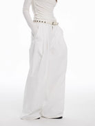 Elevate your wardrobe with these elegant women's floor-length trousers, designed in a high-waisted, wide-leg silhouette for a flattering and comfortable fit. The structured pleats along the front bring dimension and sophisticated drape to the crisp white fabric, perfect for autumn and winter styling.