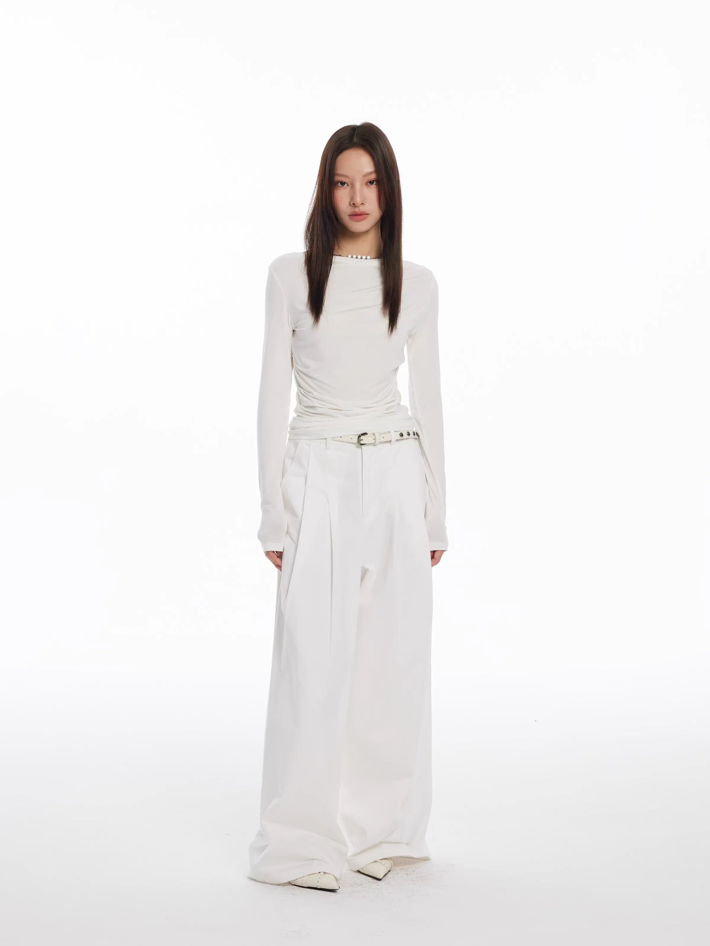 These trousers feature a loose-fit for ease of movement, with a clean, deconstructed look inspired by Japanese minimalist fashion. Paired with a ruched top and statement belt, the full-length hem gracefully skims over your shoes for a refined and modern appearance.