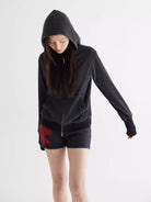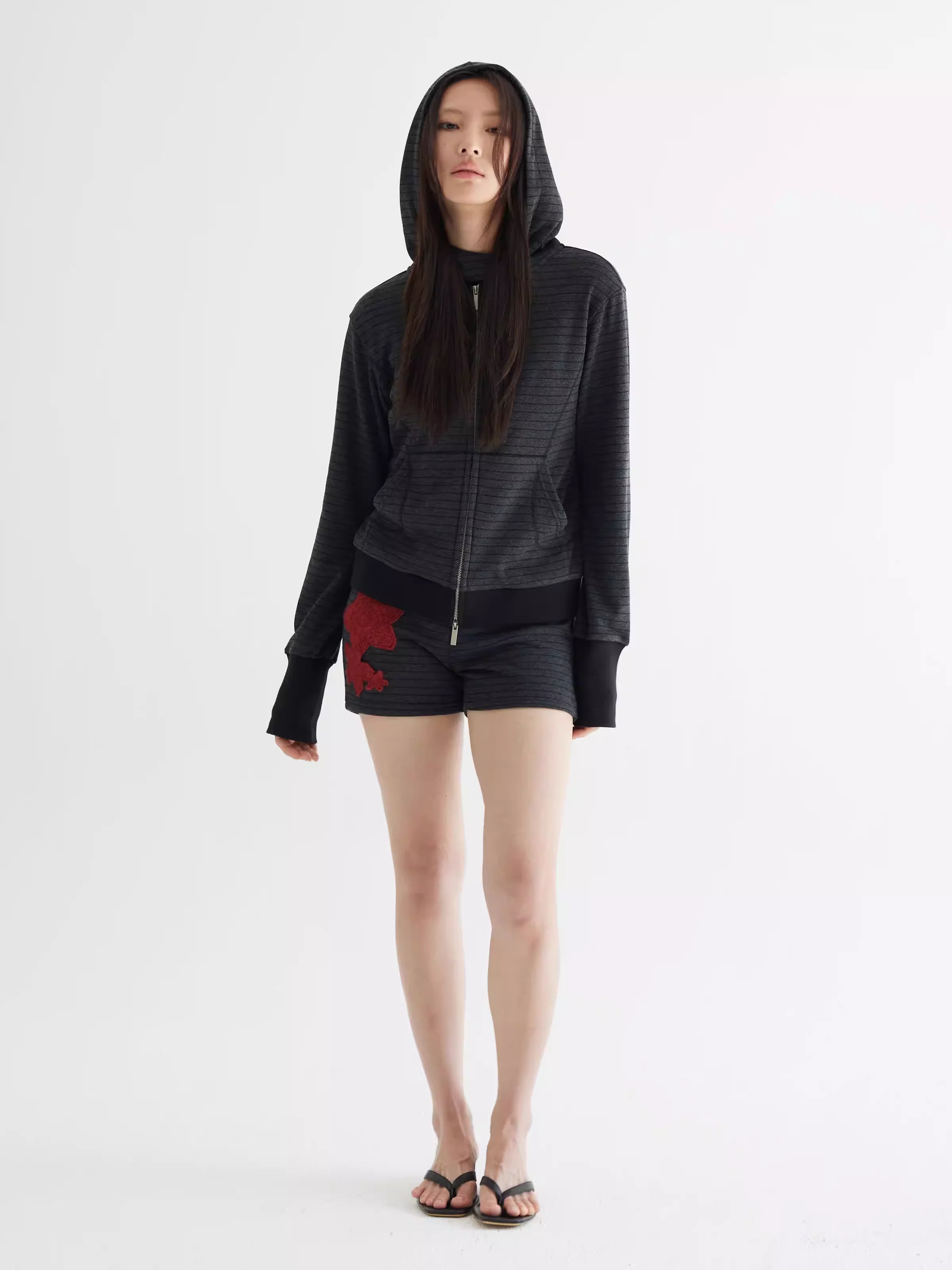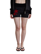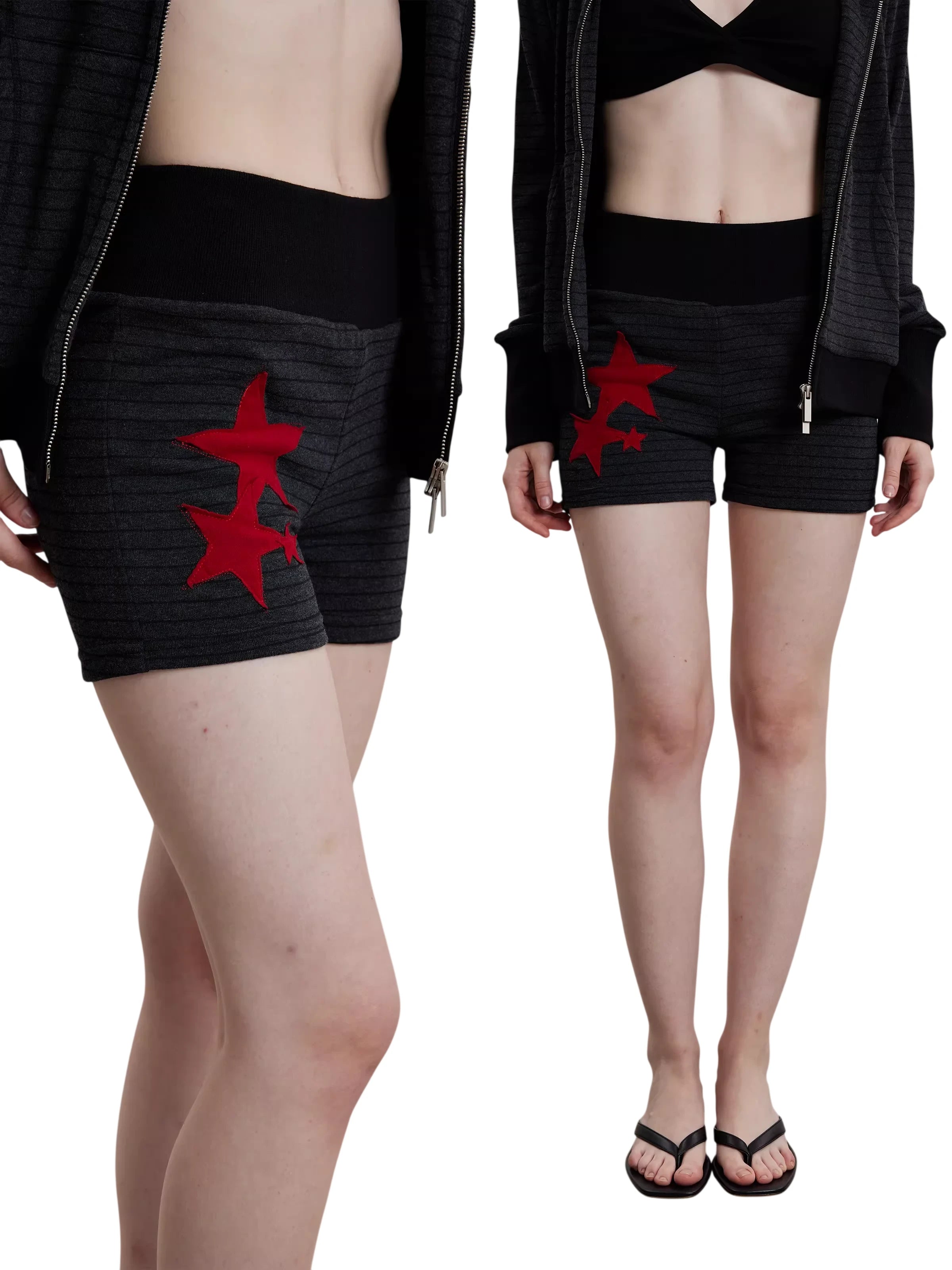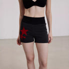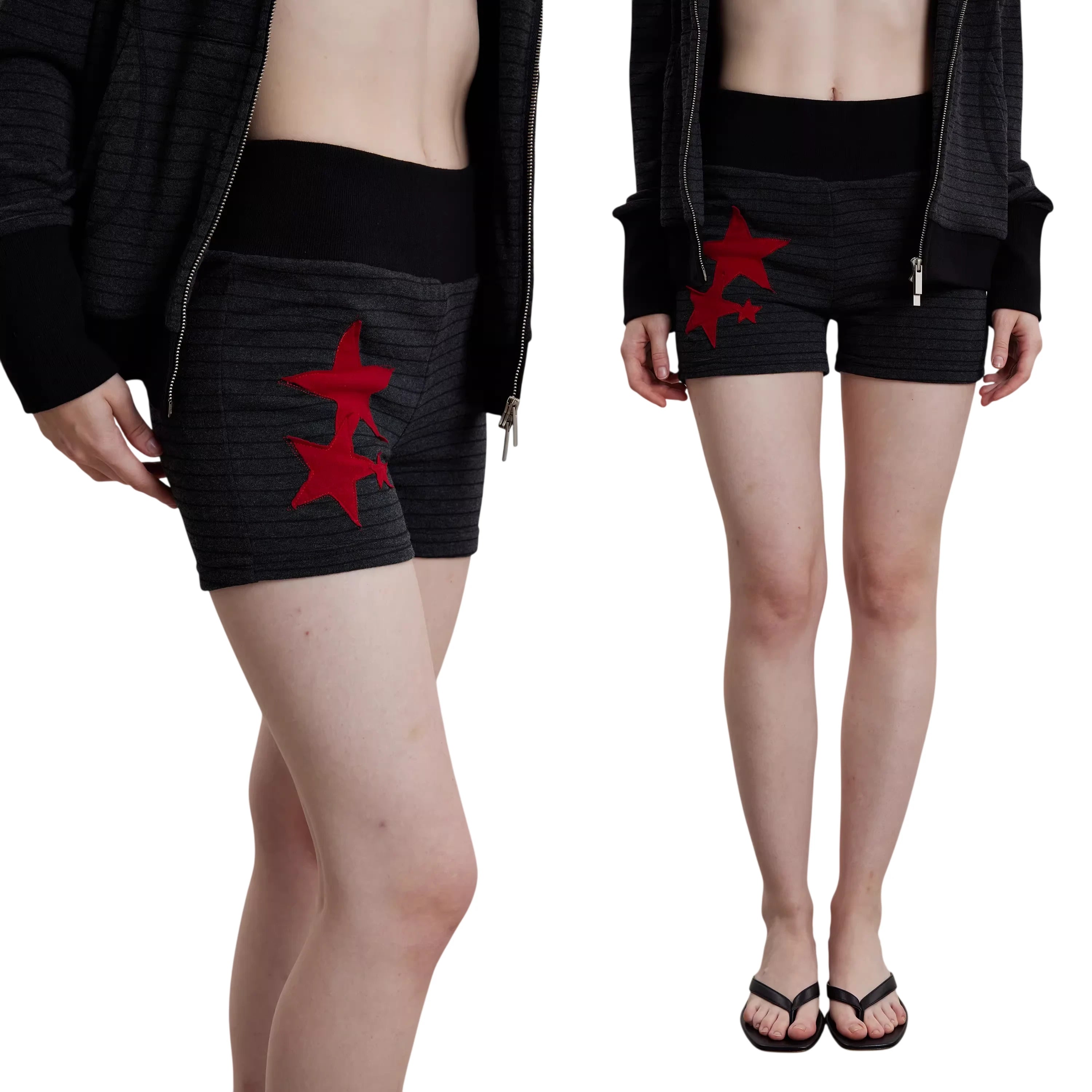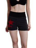 Step into retro-inspired style with these Y2K-themed women's knit shorts. Designed with a flattering high-waist ribbed waistband, these fitted shorts feature a textured horizontal stripe pattern in a dark charcoal tone. Two front pockets add practicality, while a bold patch of red stars on the left leg creates a standout detail. Perfect for casual wear this spring and summer season.