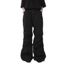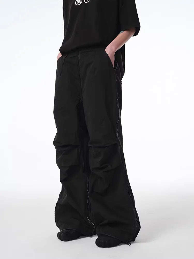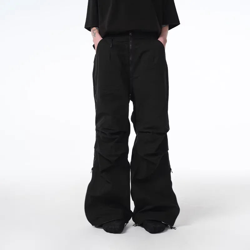 Elevate your streetwear style with these oversized multi-zip cargo pants designed for a bold, urban look. Featuring a high waist and wide-leg silhouette, they offer a loose, comfortable fit with flared hems and functional adjustable drawcords. Multiple zippered sections add edgy detail and versatile storage. Crafted for versatility, these pants feature a detachable design that transforms them effortlessly. Ideal for men seeking a modern and stylish cargo staple.