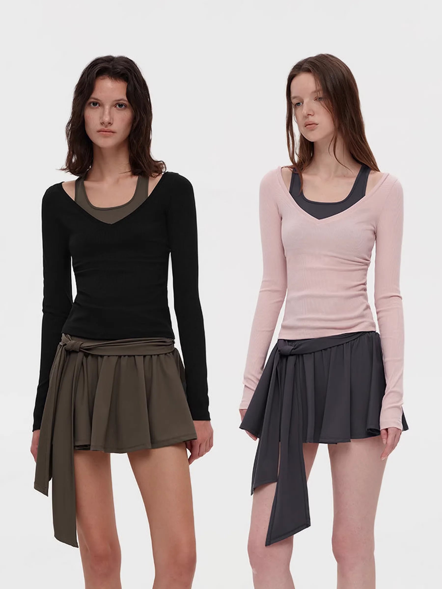 Elevate your casual wardrobe with this ballet-inspired faux two-piece set. Featuring a colorblock halter top with a V-neckline and layered look, this outfit combines sporty elegance with feminine charm. The ribbed knit fabric offers a snug, comfortable fit, perfect for everyday or athleisure wear. The matching bow tie skirt completes the look, adding a graceful silhouette. Designed for women who love movement and style.