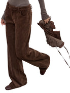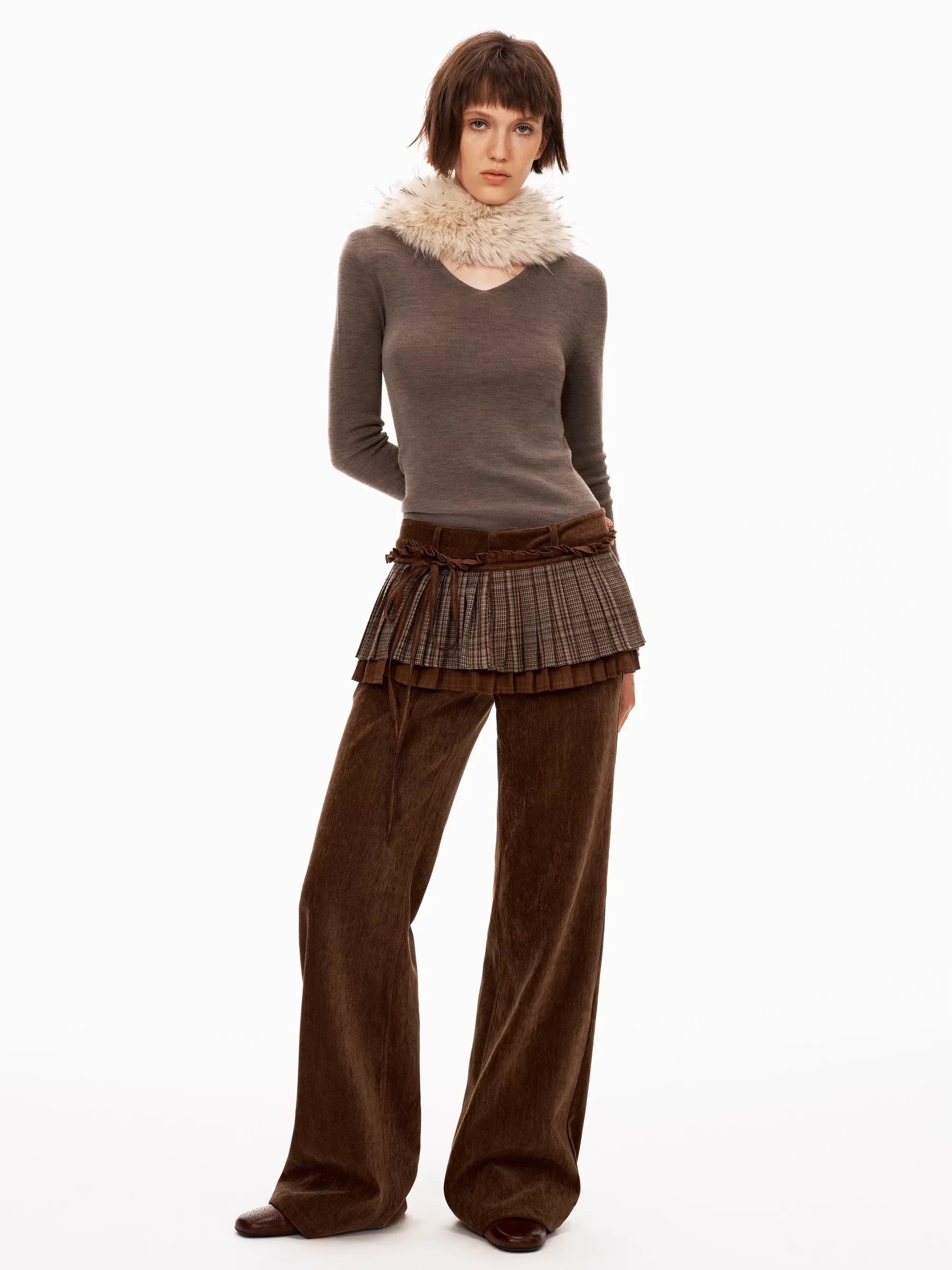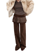 Elevate your wardrobe with these unique detachable two-way skirt-pants designed for women. Featuring a slim fit, mid-to-low waist corduroy trousers in a rich brown tone, these pants are enhanced with a pleated plaid overlay that mimics the look of a skirt. The chenille-textured panel ties at the waist with a braided belt, creating a layered, rustic charm. Perfect for both casual and styled-up winter looks, this statement piece blends structure and softness with a touch of vintage inspiration.
