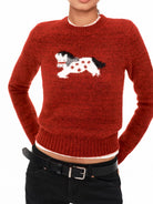 This women's wool sweater features a charming embroidered dog motif on the front, blending playful design with classic knitwear style. Available in three versatile colors — rusty red, medium grey, and chocolate brown — it offers a fitted silhouette complemented by long sleeves and a crew neckline. The ribbed hem and cuffs add structure and a comfortable fit, making it an ideal choice for casual, stylish layering.