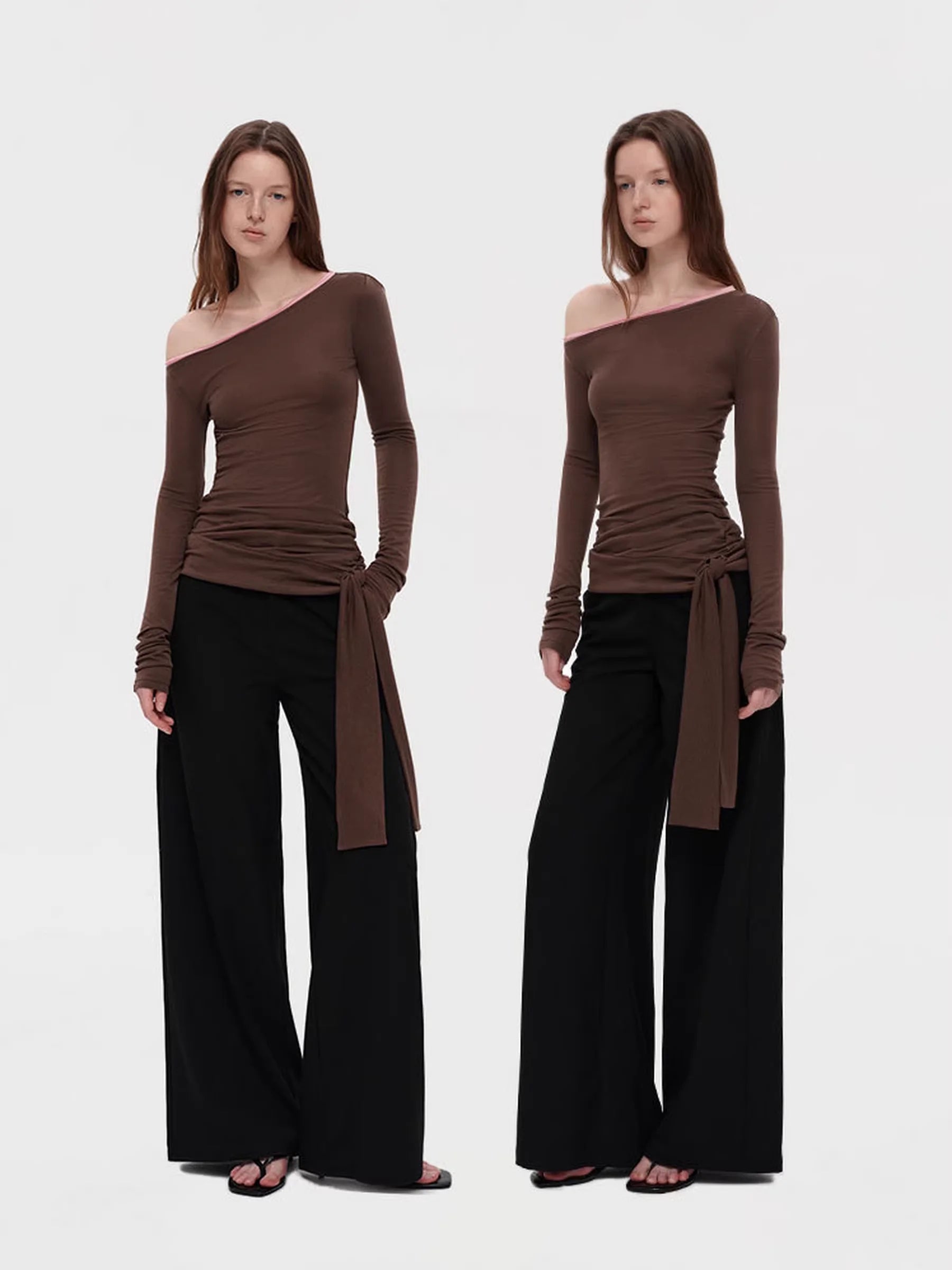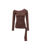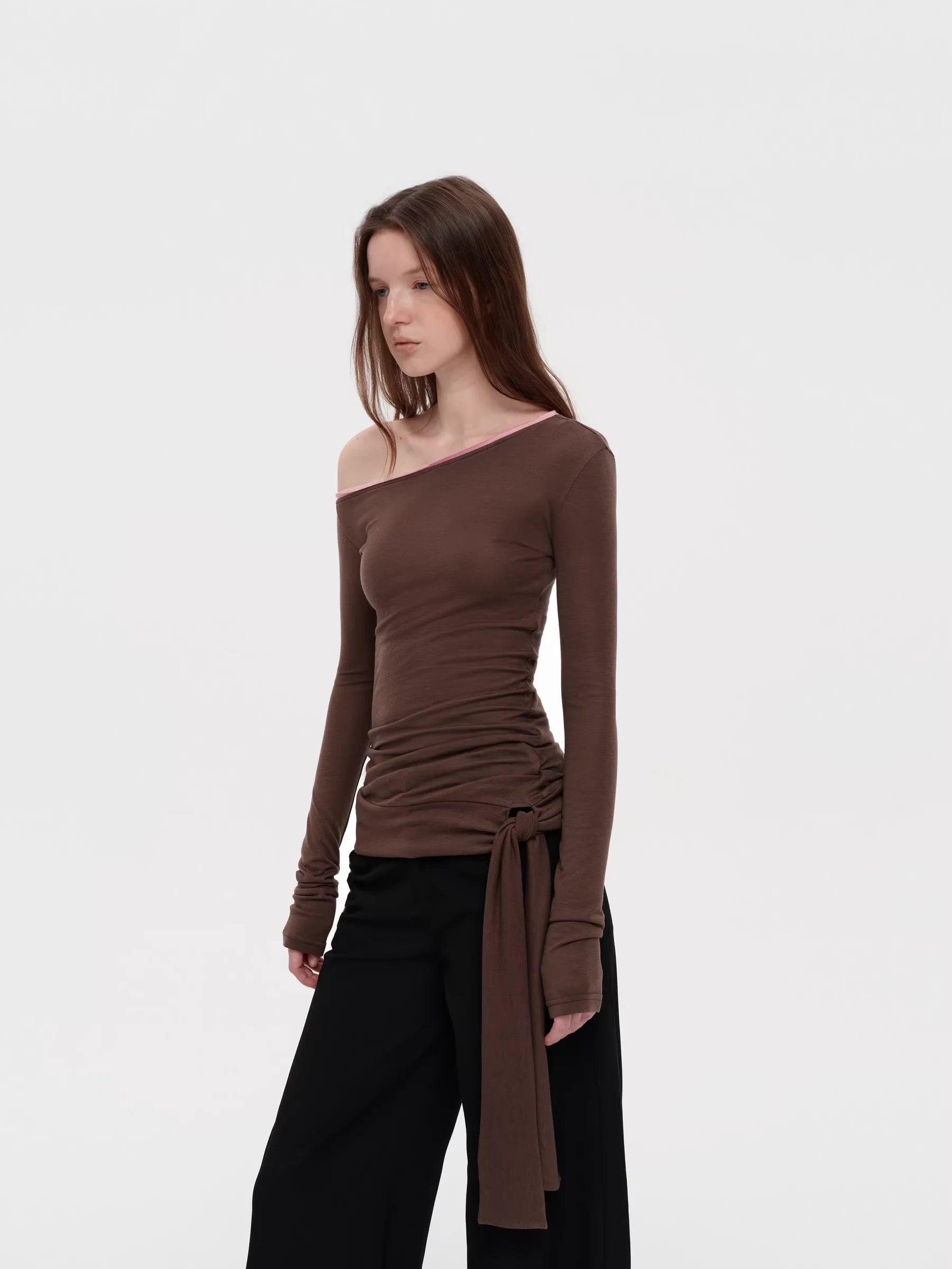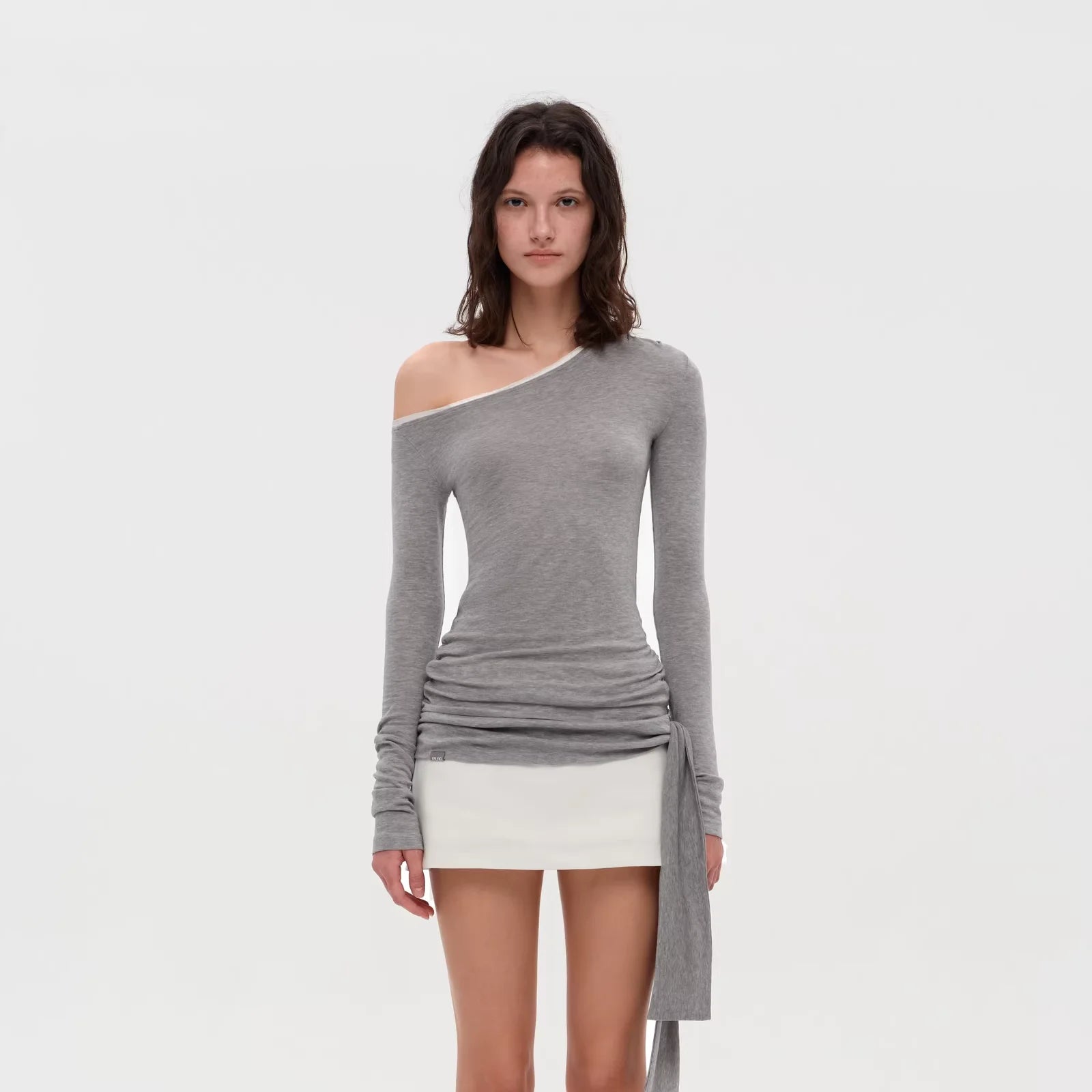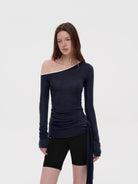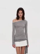 This women's asymmetrical top features a modern one-shoulder design with elegant draping and subtle ruching at the waist for a flattering silhouette. Crafted from a soft blend of imported Merino wool and Lyocell, it includes a distinctive sash-like extension for added flair. Available in light grey, navy blue, and chocolate brown, it effortlessly pairs with skirts, shorts, or trousers for versatile styling.