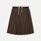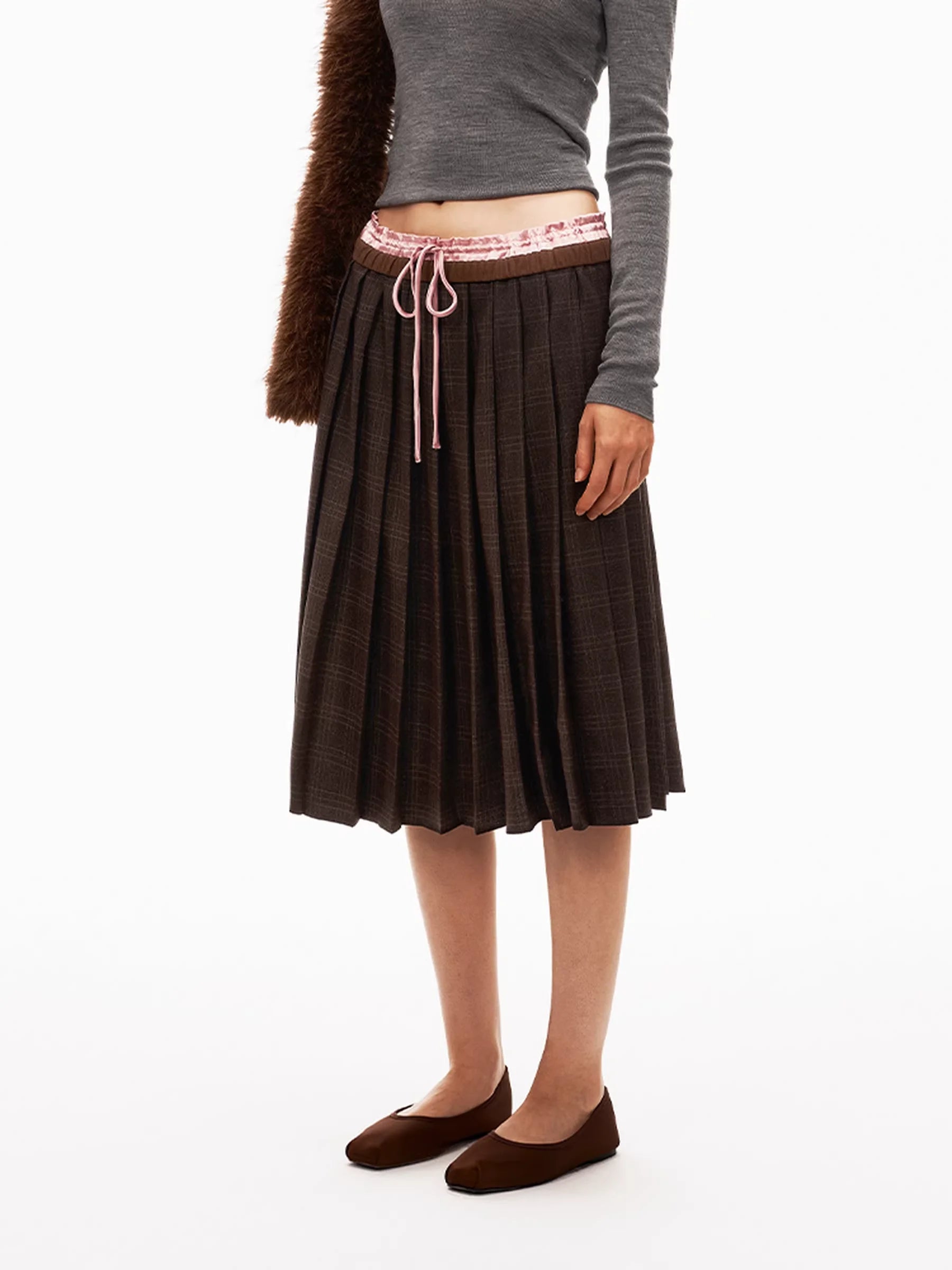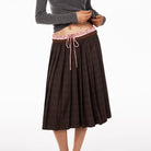 This women's pleated skirt is designed for fall and winter wear, featuring a classic brown and black checkered pattern. The mid-length silhouette is enhanced with deep pleats, creating a voluminous and structured look. A contrasting white waistband with a ruffled edge and front drawstring adds a unique layered touch, combining style and comfort. Perfect for seasonal layering, this skirt pairs effortlessly with sweaters and boots for a cozy, polished outfit.
