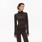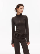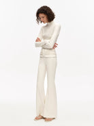Elevate your casual wardrobe with this slim fit athleisure set designed for both comfort and style. Featuring a high-neck, long-sleeve zip-up or pullover top and coordinating flared pants, this set offers a flattering silhouette enhanced by three-dimensional ruched detailing at the waist. Perfect for lounging or light activity, the formfitting design ensures a sleek and comfortable fit. Available in classic solid tones like dark brown or black, off-white, and light grey, this women's ensemble blends functionality with modern style.