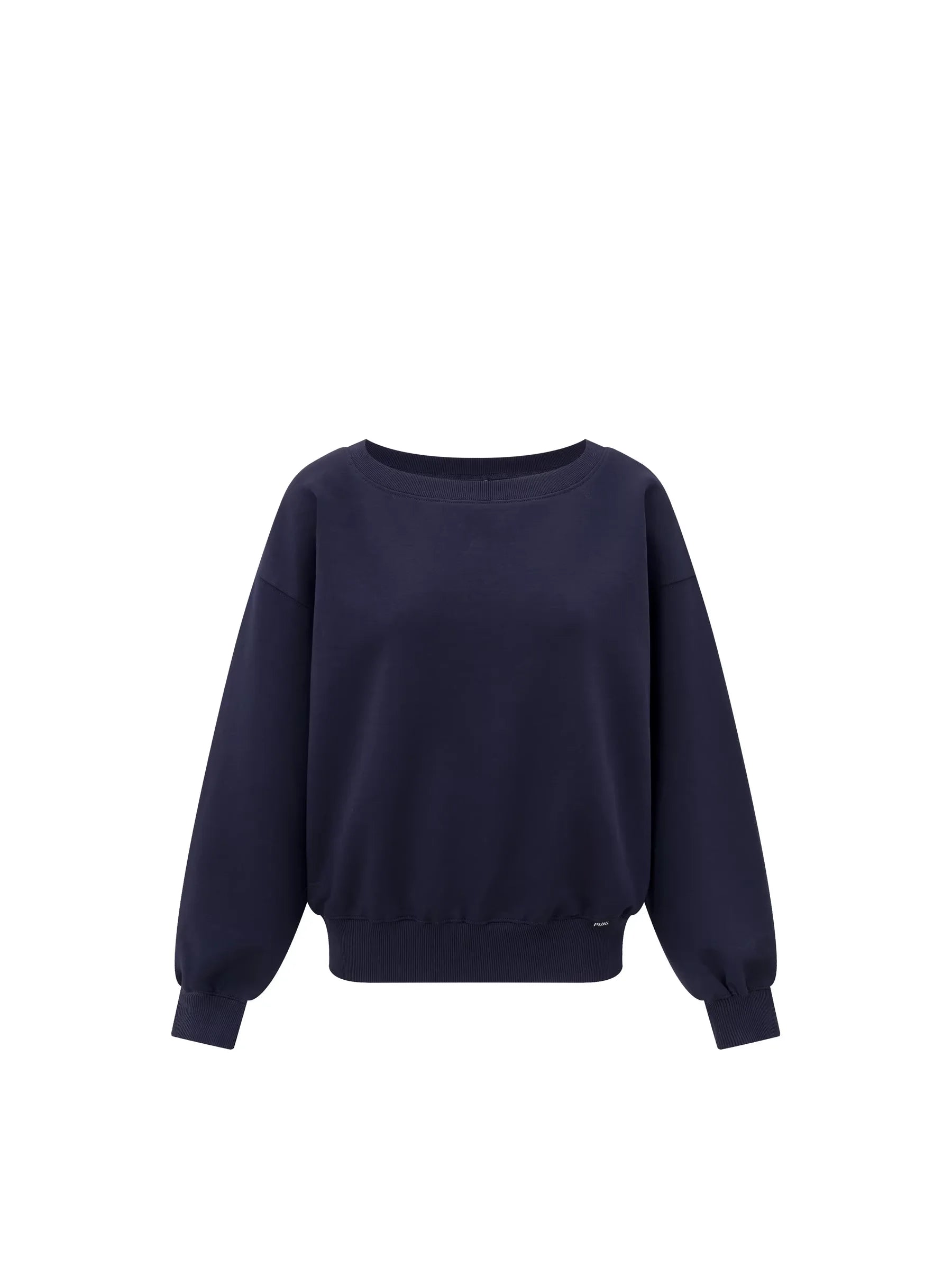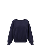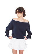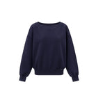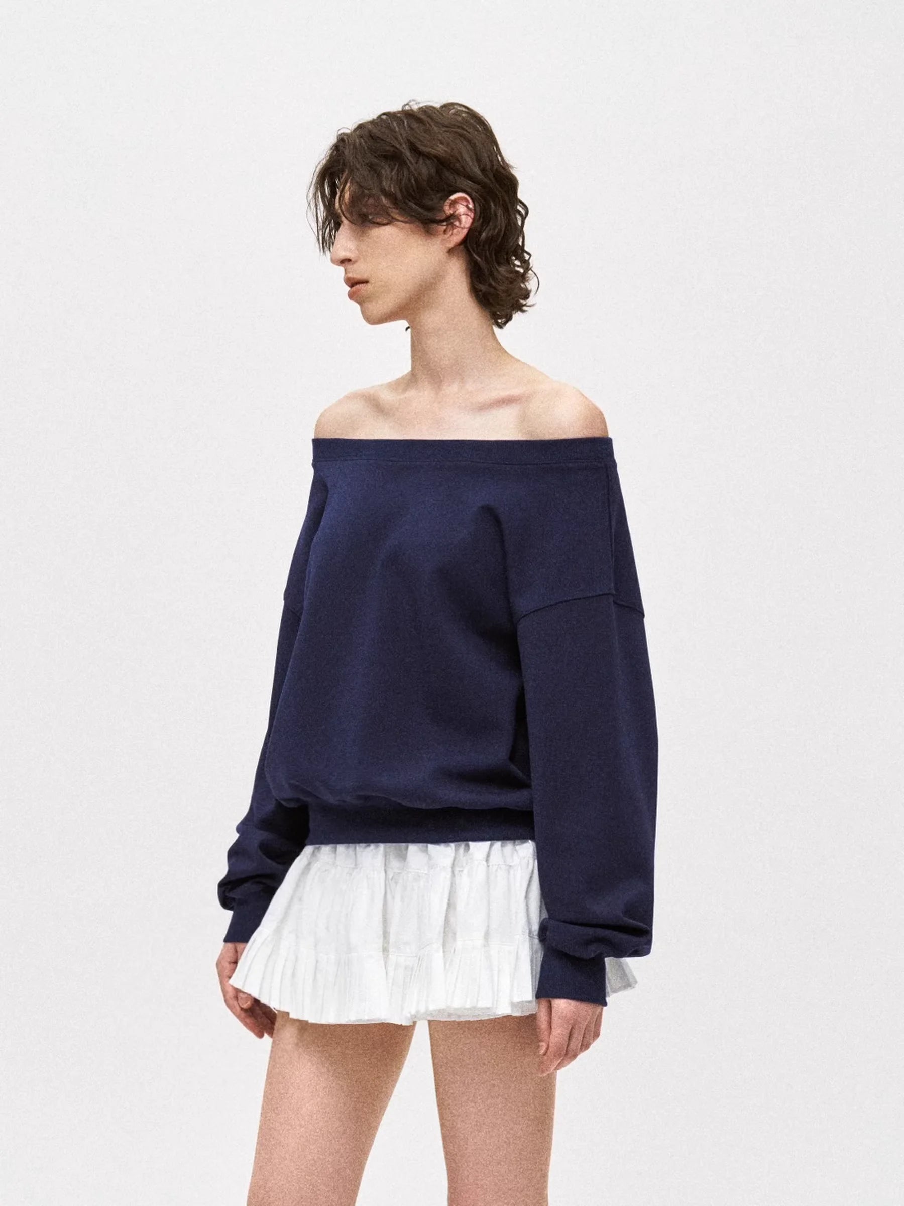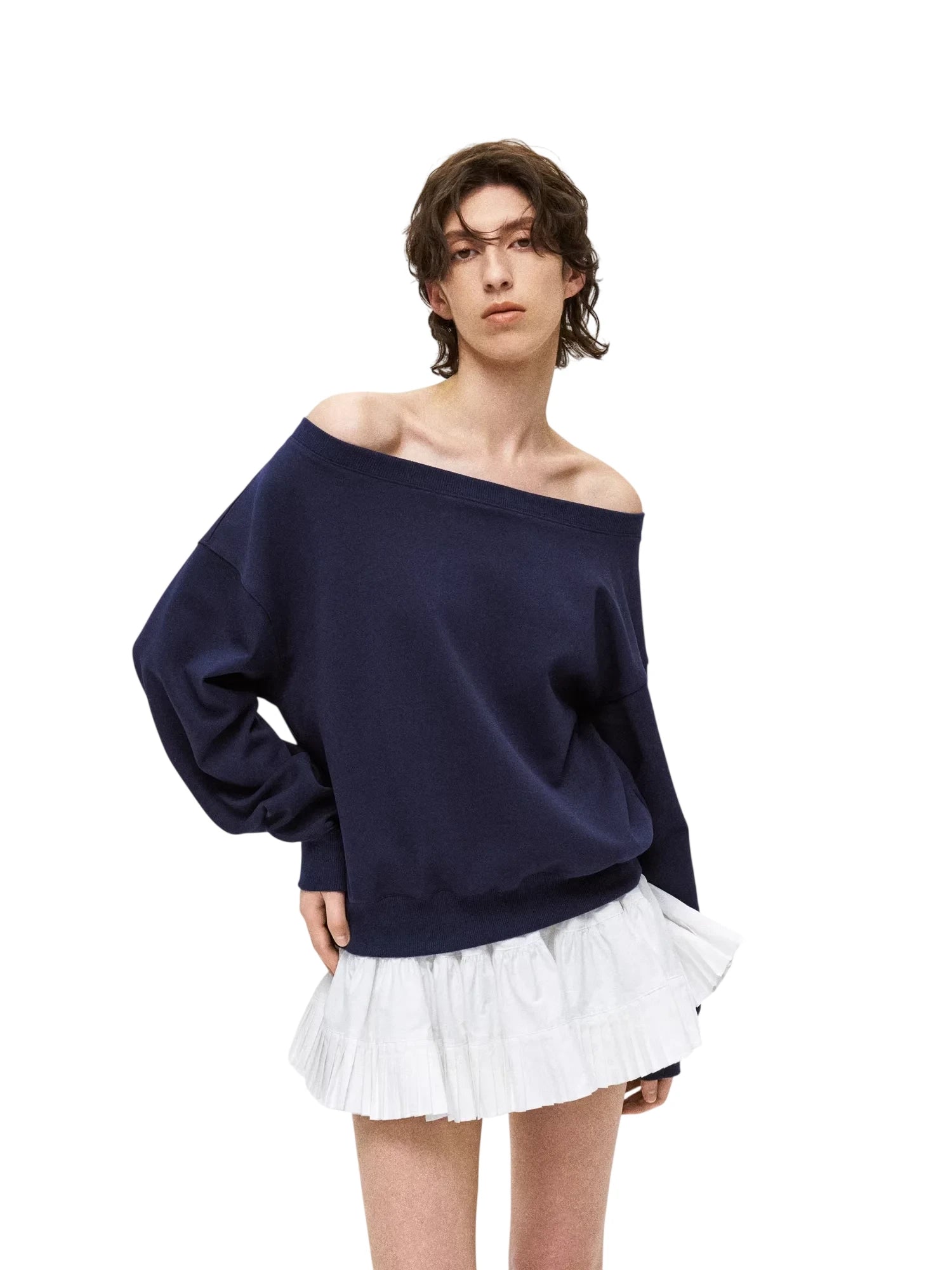 This stylish and versatile off-shoulder sweatshirt features a two-way wear design, allowing for varied styling options. Cut in a relaxed, airy silhouette, the navy blue top pairs effortlessly with casual or dressier pieces for a chic, everyday look. Designed for a feminine-presenting fit, it offers both comfort and a touch of elegance with its simple, irregular lines. Ideal for layering or wearing as a statement piece across seasons.