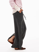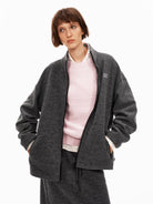 Stay warm and stylish with this women's fleece outfit set, perfect for casual winter days. The set includes a dark grey zip-up hoodie jacket with side pockets and a relaxed fit, paired with a matching wide-leg midi skirt. A light pink textured sweater and white undershirt add cozy layering options, while brown slip-on shoes complete the look. Designed for comfort and versatility, this ensemble combines practicality with effortless style.