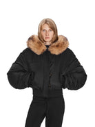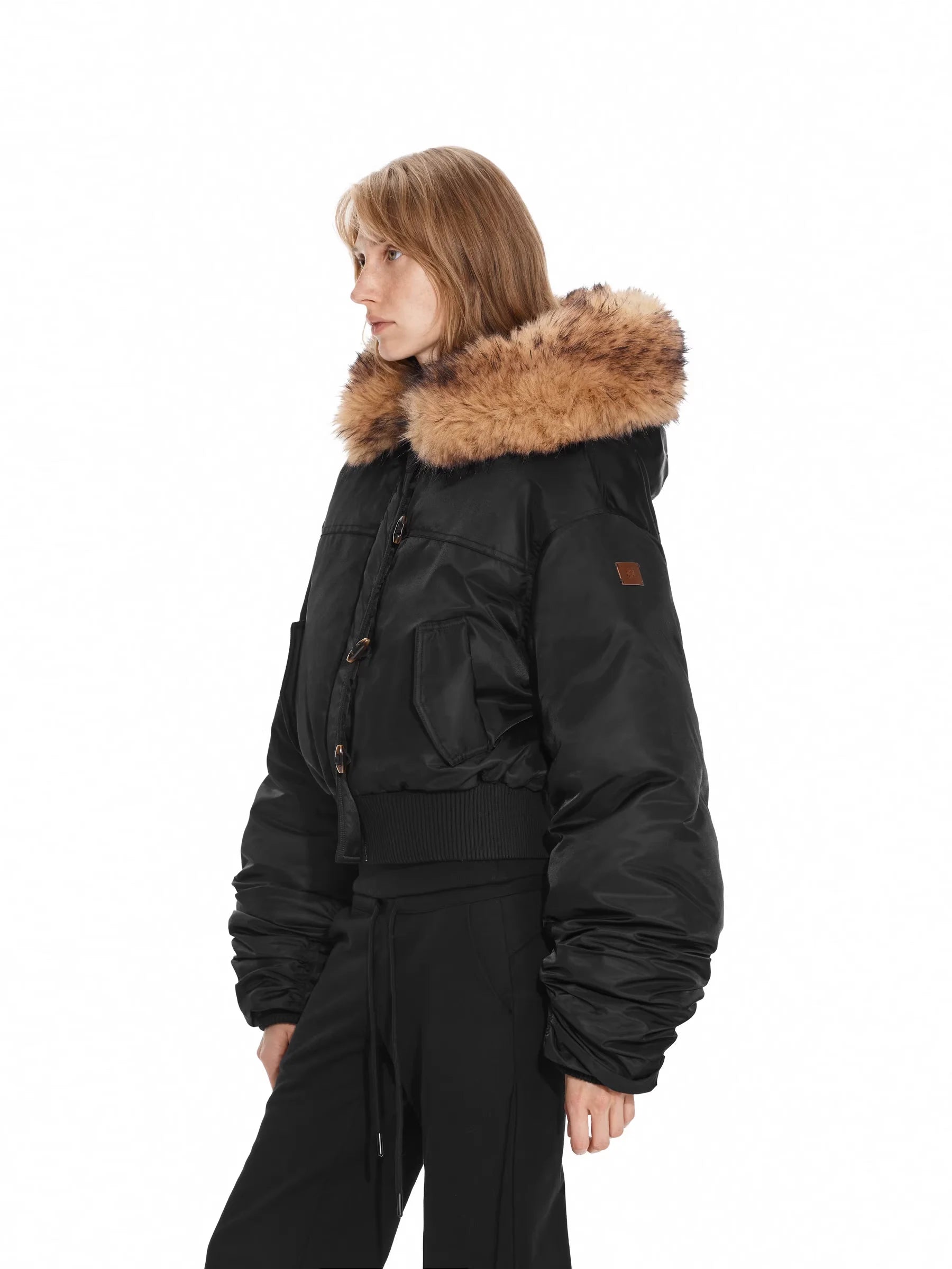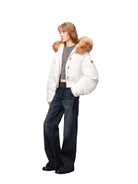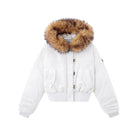 Stay warm and stylish with this women's oversized short bomber jacket, filled with 90% white duck down for superior insulation. Designed with a cozy fur-trimmed hood and a durable front zipper with button closure, this puffer jacket is ideal for cold weather conditions. Its cropped silhouette adds a modern touch, making it a versatile outerwear choice for both casual and streetwear looks.