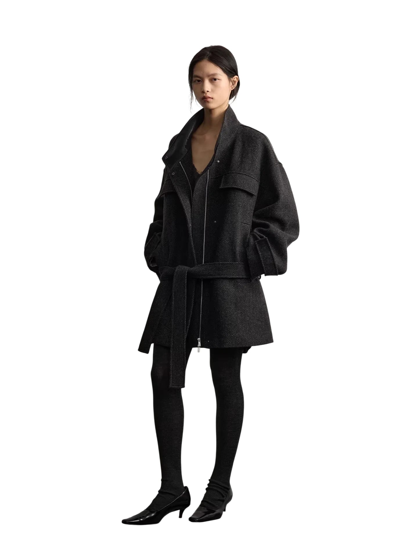RandomPiece Wool Blend Contrast Collar Tweed Short Coat