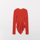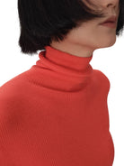 This women's base knit top is crafted from soft and breathable 18-gauge washable Merino wool. Featuring a ribbed texture and an elegant turtleneck, it offers a snug yet flexible fit that flatters the figure. The asymmetrical hem adds a modern, stylish twist to a timeless silhouette, making it perfect for layering or wearing on its own. Ideal for cooler weather, this top combines warmth, comfort, and contemporary design.