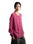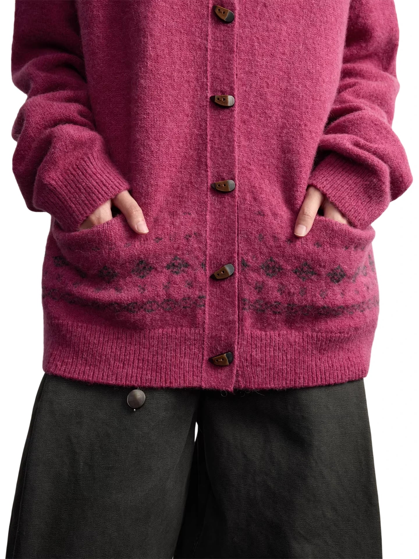 Elevate your cold-weather wardrobe with this women's alpaca wool blend cardigan, designed for cozy comfort and effortless style. Featuring a soft, plush texture and a relaxed, oversized fit, this fuchsia-pink cardigan includes classic toggle buttons and a distinctive geometric jacquard hem for a touch of artisanal detail.