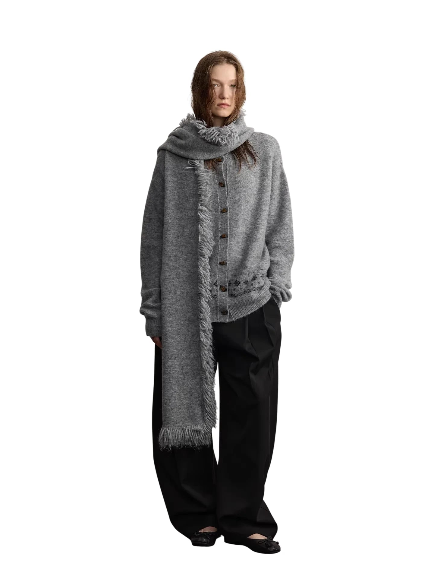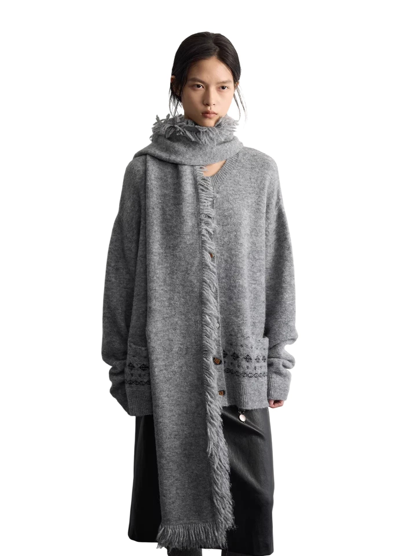 Large front pockets and dropped shoulders contribute to its laid-back silhouette, while the coordinating long scarf with tasseled ends adds extra warmth and visual interest. Perfect for layering, this cardigan pairs beautifully with jeans or wide-leg trousers for a modern, comfortable look.