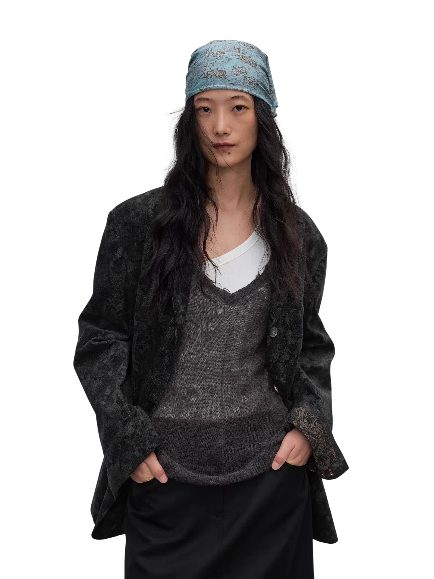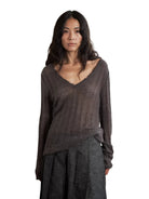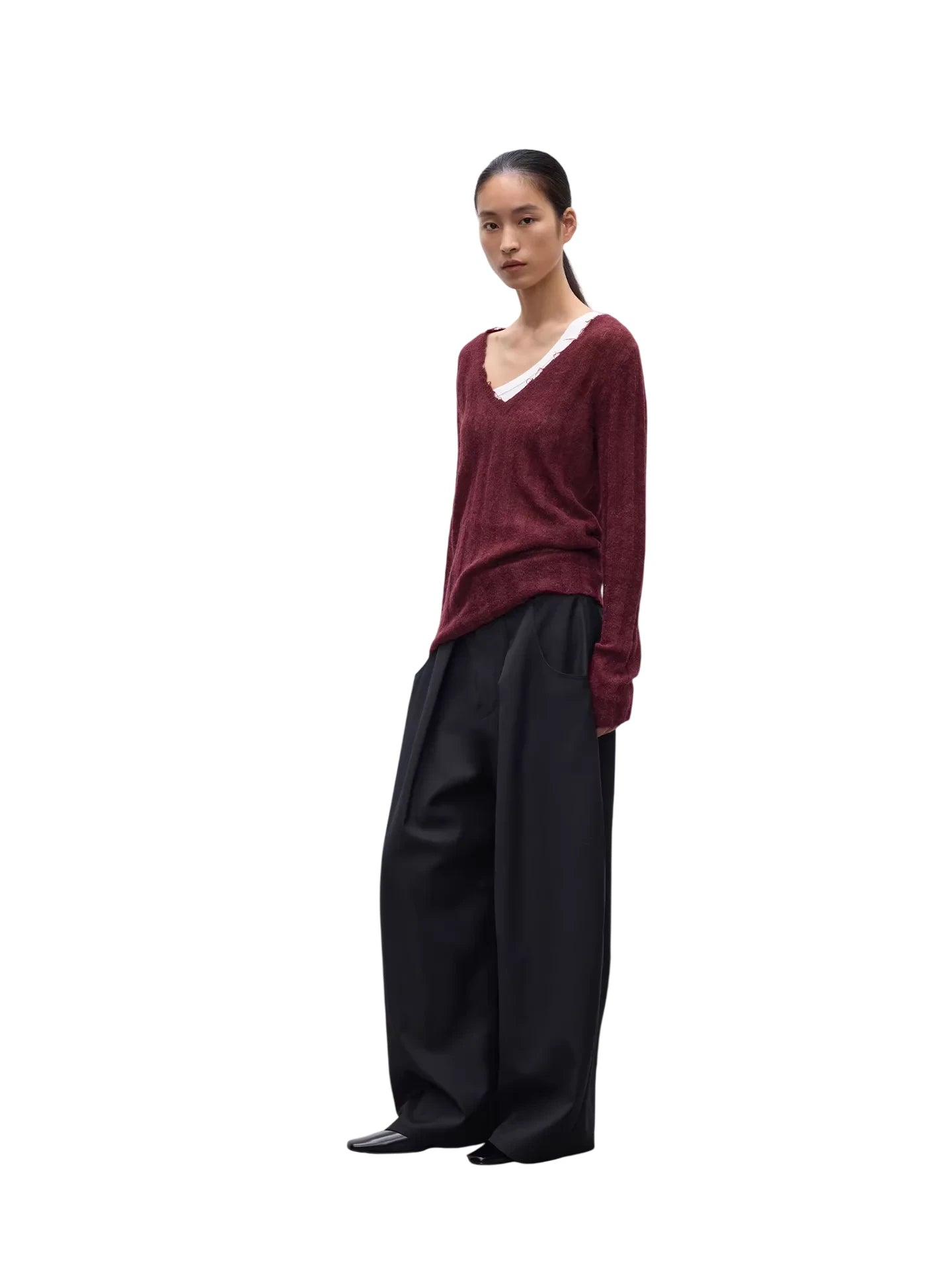 This women's V-neck sweater is crafted from a cozy alpaca wool blend, offering warmth with a lightweight feel. Featuring a relaxed, loose fit and full-length sleeves, it showcases ribbed detailing and raw edge accents for a modern, deconstructed style. The semi-sheer maroon knit is effortlessly layered over a white distressed tank top for an edgy, laid-back aesthetic. Perfect for pairing with high-waisted trousers or skirts, this piece delivers both comfort and style in cooler seasons.