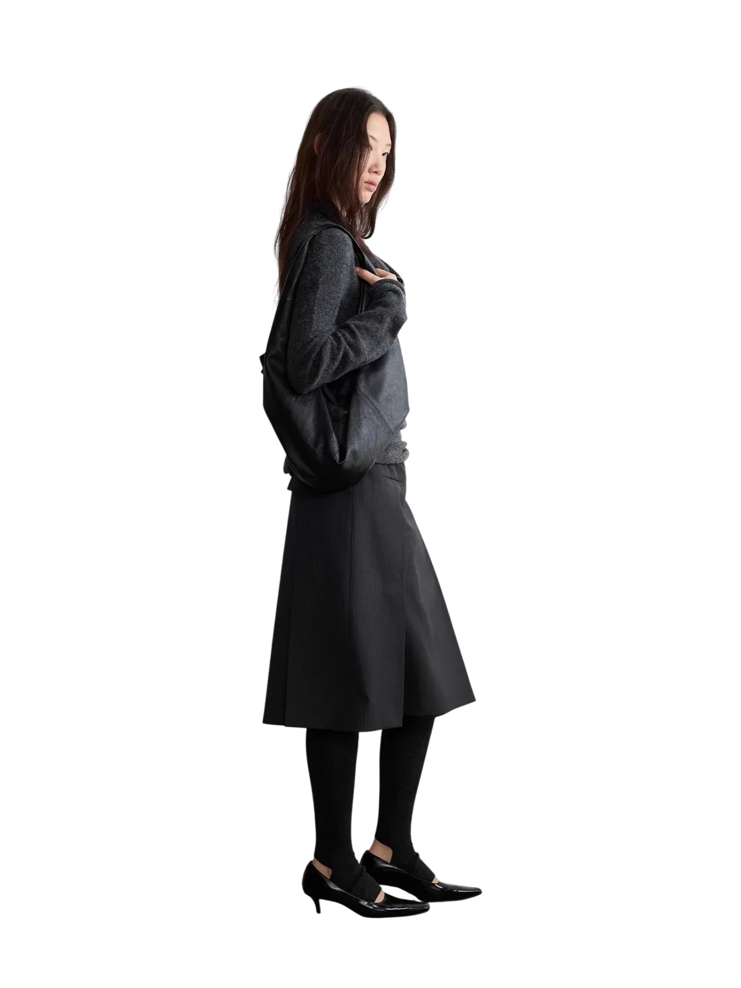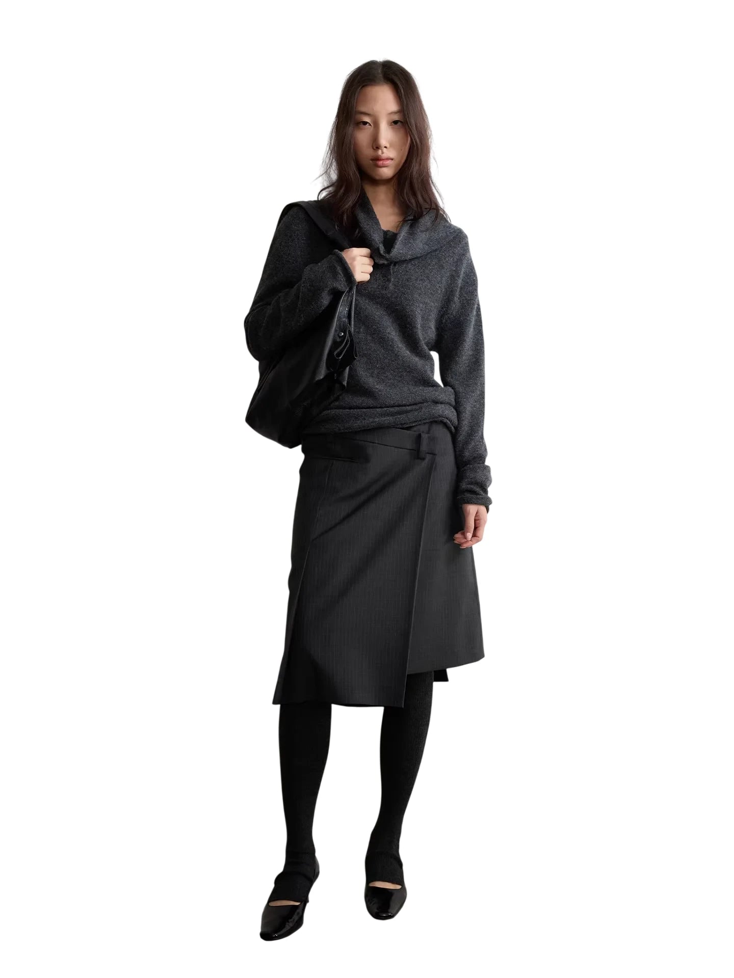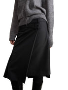 This women's asymmetrical wrap skirt is crafted from a refined wool blend with a subtle pinstripe pattern. Designed with a stylish overlapping front and side buckle detail, it combines minimalism with sophistication. The tailored cut and flowing silhouette fall just below the knees, offering an elegant fit suitable for both professional and casual settings. Pair it with tights and heels for a polished look.