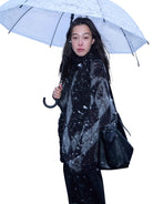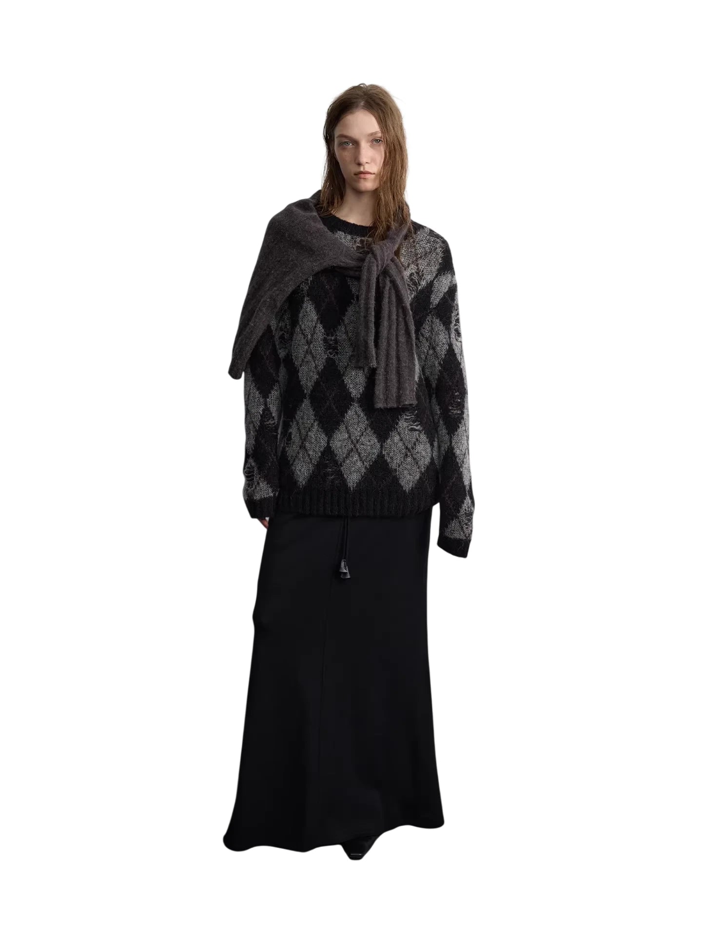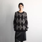 This women's long-sleeve sweater features a bold black and grey argyle jacquard pattern crafted from a cozy alpaca wool blend. Designed with a relaxed, oversized fit, it showcases a distressed texture with frayed detailing for a vintage-inspired look. The round neckline, ribbed cuffs, and hem provide subtle structure, balancing the grunge aesthetic with classic knitwear elements. Perfect for layering in cooler seasons.