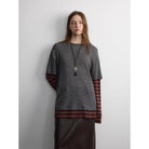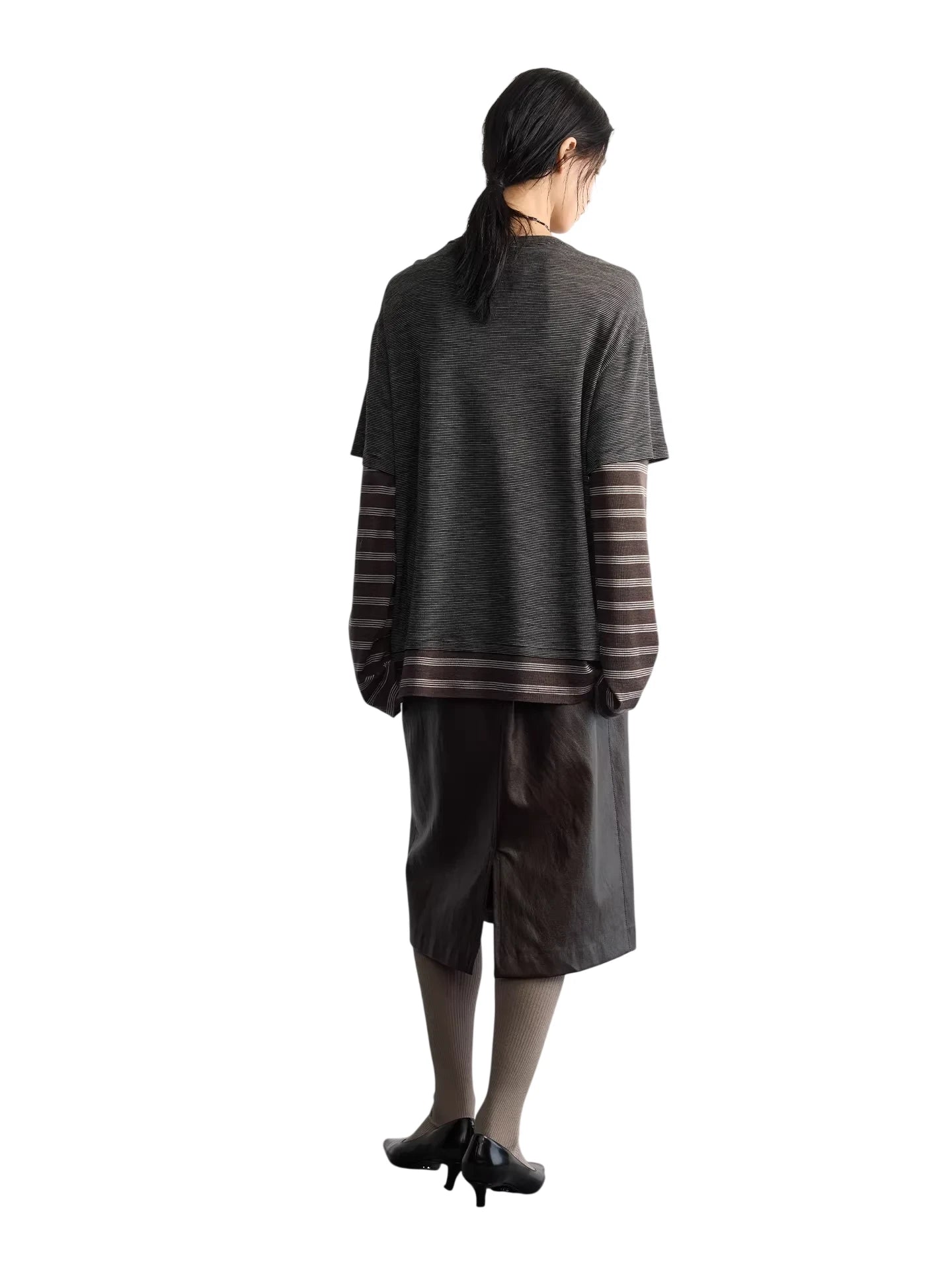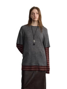 This women's long sleeve top features a stylish layered look with a relaxed, loose fit. Crafted from 100% Merino wool, the design pairs a dark grey short-sleeve overlay with brown and white striped underlayers extending through the sleeves and hem, creating a modern patchwork effect. The soft knit texture adds comfort and casual appeal, while the layered styling provides visual interest, making it a versatile choice for cool-weather dressing.