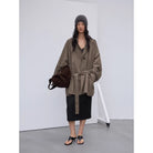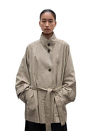 This oversized khaki trench coat offers a modern take on a classic silhouette, featuring a stand collar, dropped shoulders, wide cuffs, and large front pockets. Crafted from combed cotton and enzyme washed for a soft, lived-in feel, it includes a loosely tied waist belt for a relaxed yet stylish fit. Designed for women, it pairs effortlessly with skirts or trousers for a versatile, contemporary look.