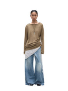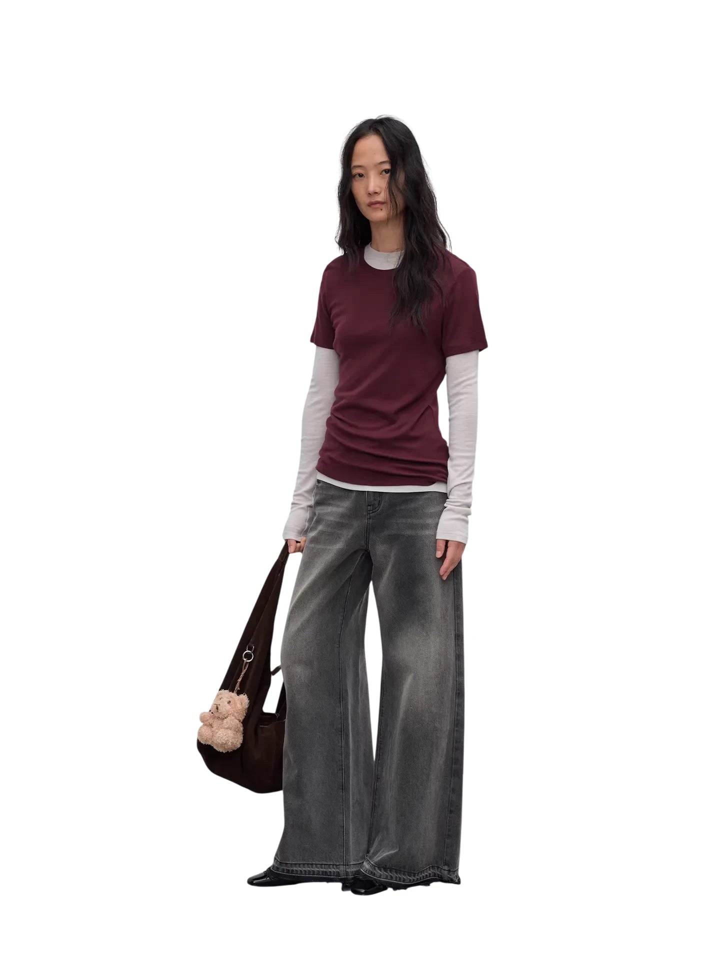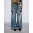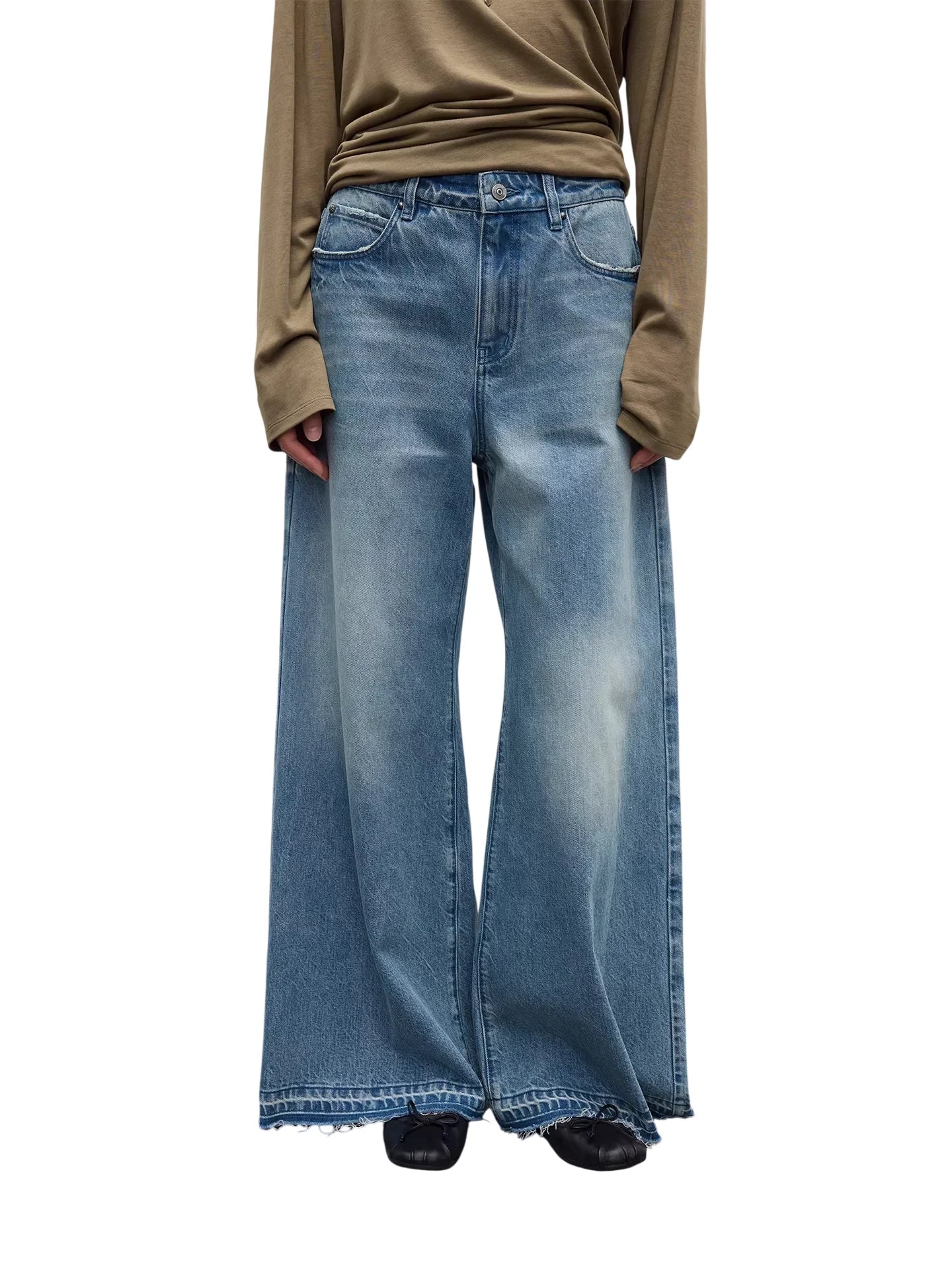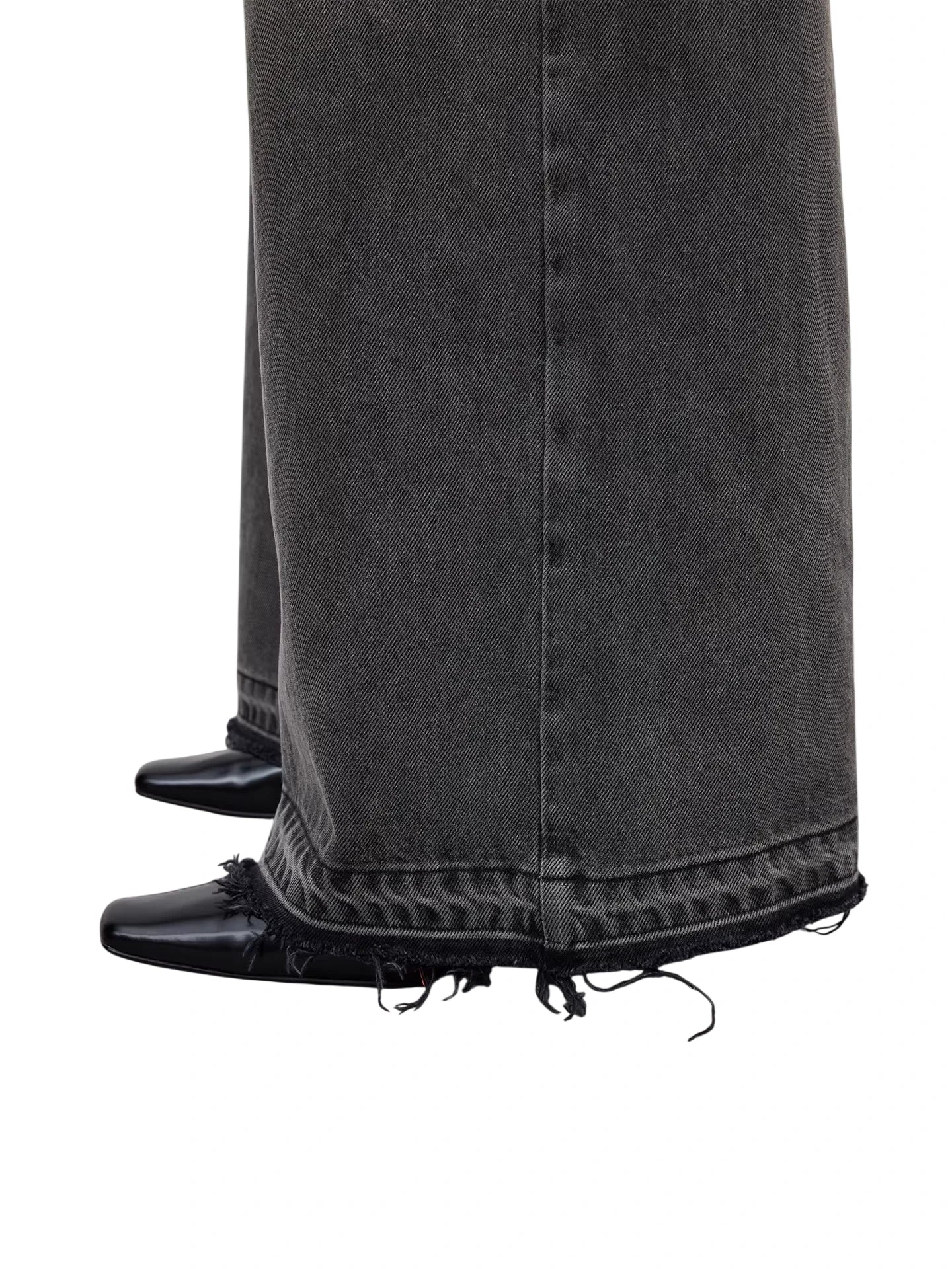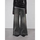Elevate your autumn wardrobe with these women's high-waisted wide-leg jeans, crafted from long-staple cotton for comfort and durability. Featuring a dramatic flared silhouette and a raw, distressed hemline, these jeans offer a vintage-inspired grunge aesthetic. The faded charcoal wash adds to the edgy appeal, making them a bold staple for any stylish outfit.