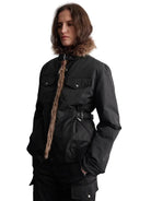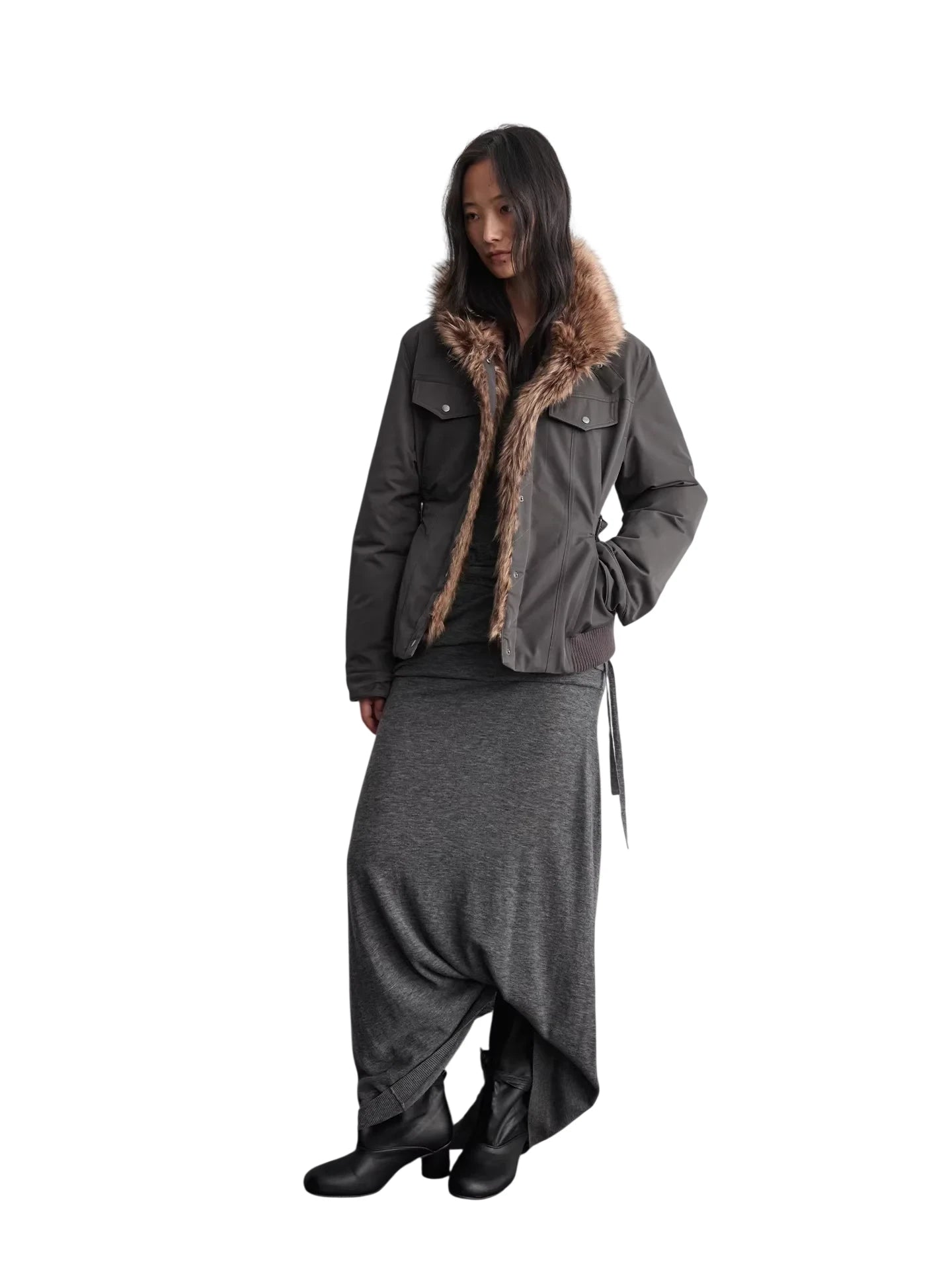 Stay warm and stylish with this women's short down jacket featuring a cinched waist for a flattering silhouette. Designed with eco-friendly fabric and filled with 90% down, this winter essential offers superior insulation. The detachable faux fur-trimmed hood adds a luxurious touch, while functional chest flap pockets with metallic snap buttons provide practical storage. Long sleeves and side pockets deliver added warmth and comfort, making it perfect for cold-weather outings.