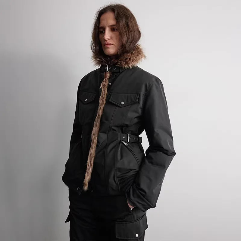 RandomPiece Women's Cinched-Waist Down Jacket with Faux Fur Hood