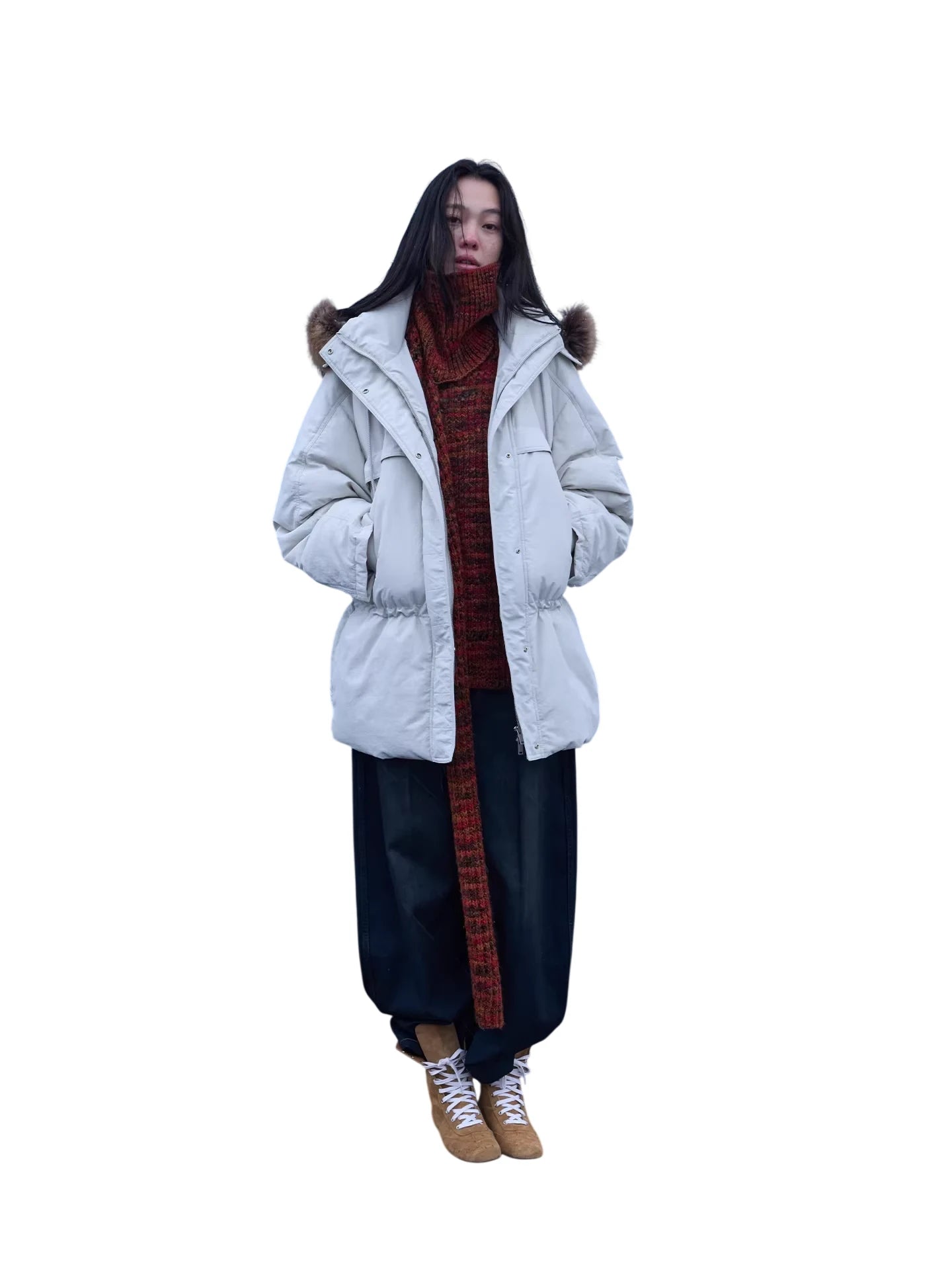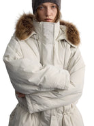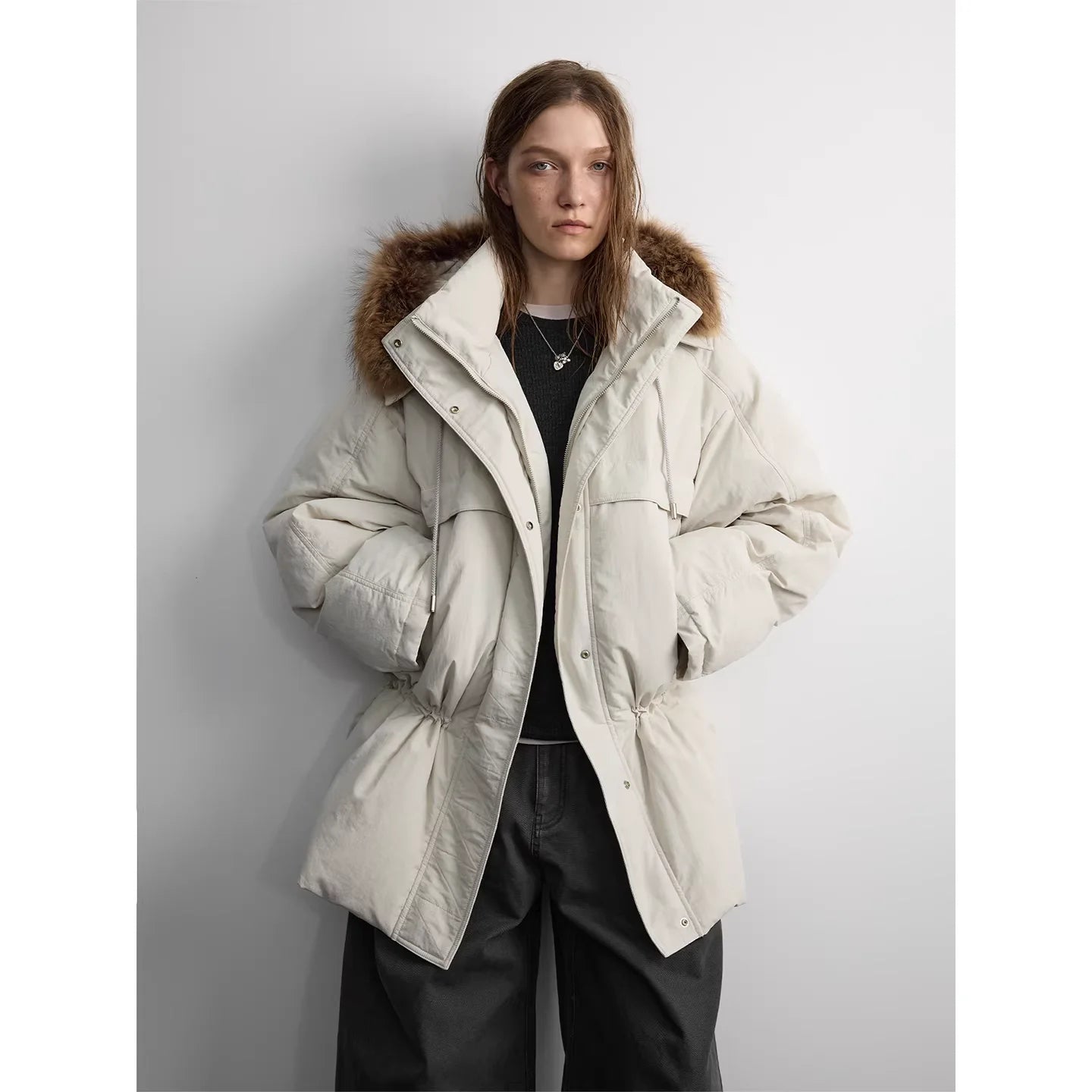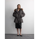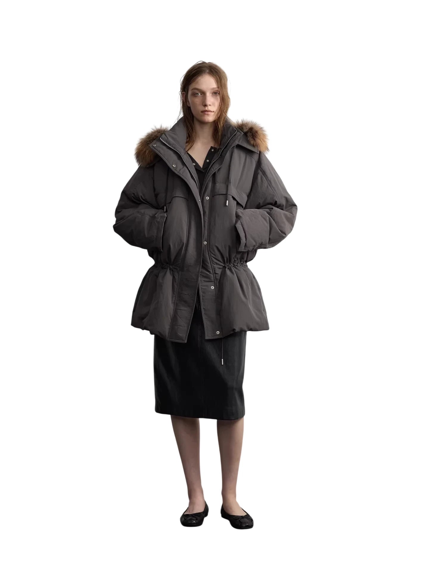 Stay warm and stylish this winter with this women's oversized down jacket, featuring a detachable faux fur-trimmed hood for added flair and warmth. The jacket is designed with a low-waist drawstring detail to create a flattering silhouette, while the full-length sleeves and snap button closures offer practicality and comfort. Made with white duck down insulation, this parka combines cozy functionality with urban-inspired style. Side pockets provide convenience, and the taupe color adds a modern touch, making it an ideal outerwear choice for cold-weather layering.