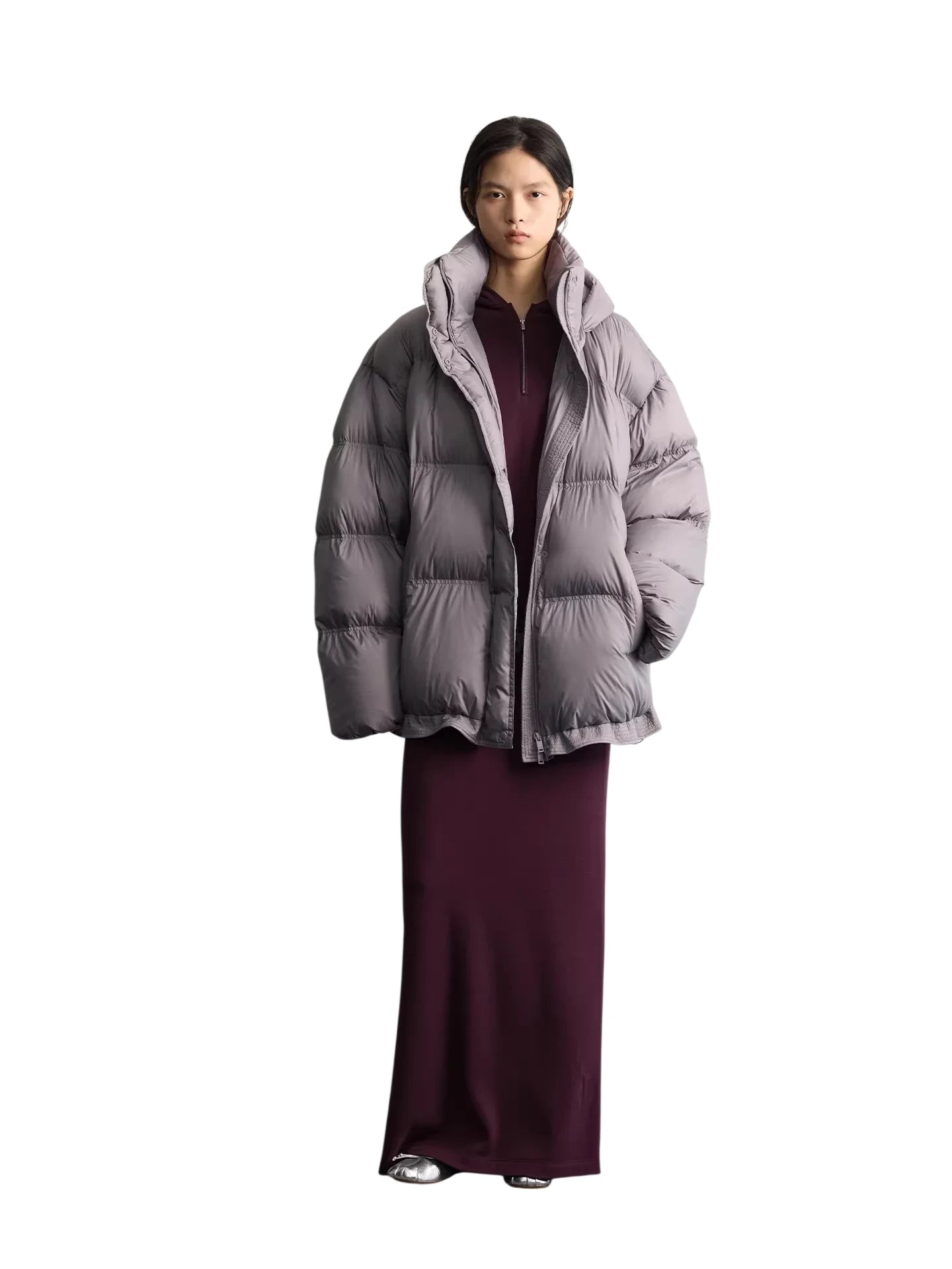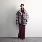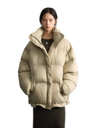 Stay warm and stylish during the colder months with this women's oversized puffer jacket, filled with 90% white goose down for premium insulation. Designed with a high collar and adjustable hood, it offers extra protection against the wind and cold. The horizontal quilting and padded construction provide a cozy, voluminous silhouette, while the drawstring hem allows for a customizable fit. Full-length sleeves and just-below-waist coverage make it a practical and fashionable choice for winter wear.