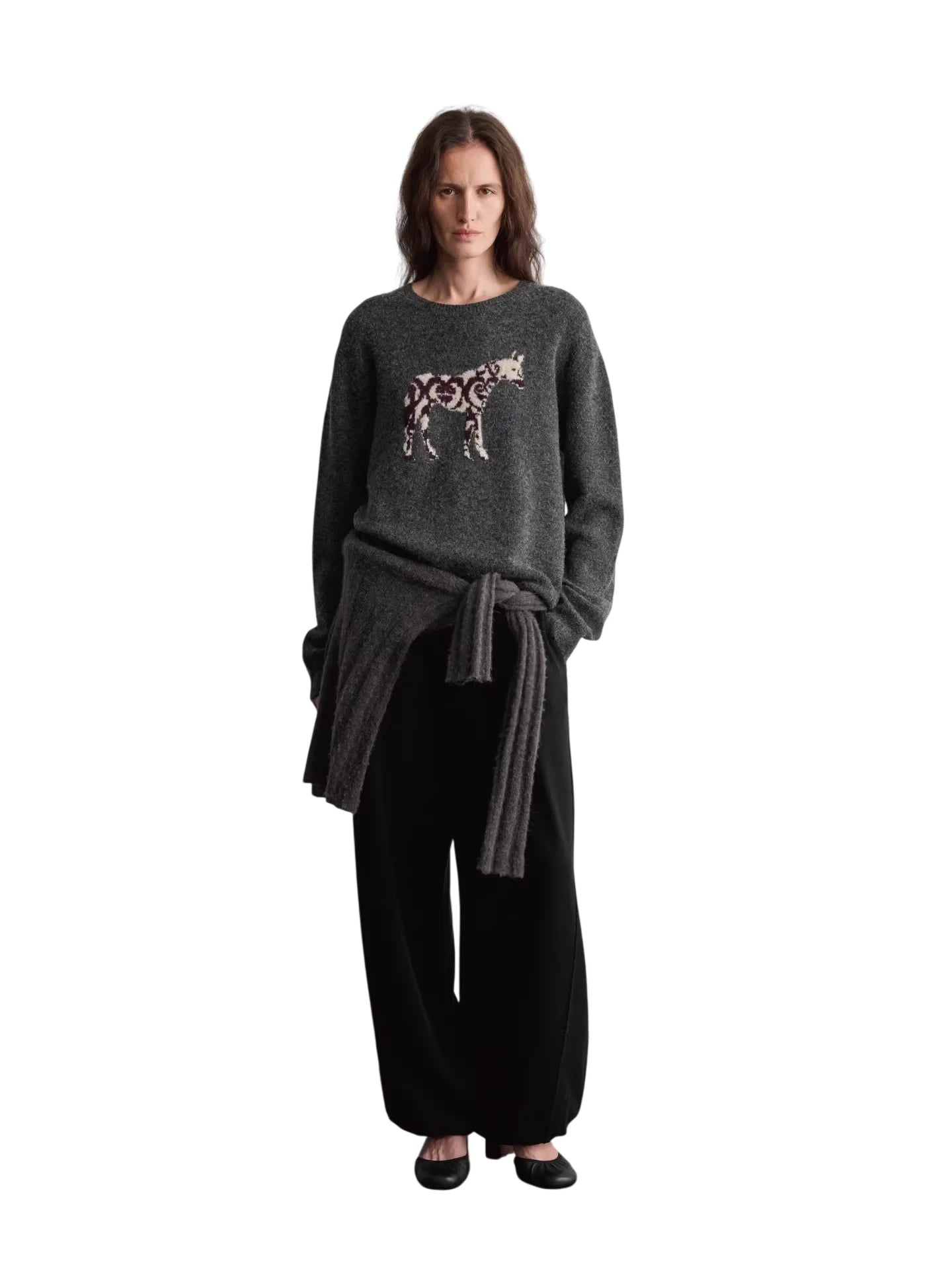 Elevate your cozywear with this women's long-sleeved sweater crafted from a luxurious wool and silk blend. Designed in a dark grey fuzzy knit, it offers both warmth and softness. A standout artistic horse pattern in cream and maroon swirls adorns the front, lending a whimsical and creative flair. The sweater features a relaxed fit and a round neckline, perfect for a casual yet stylish look.