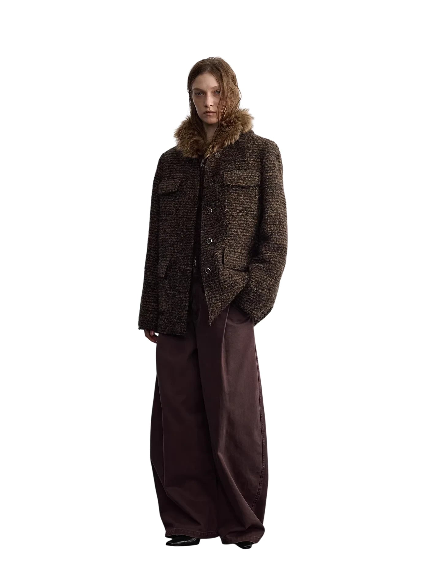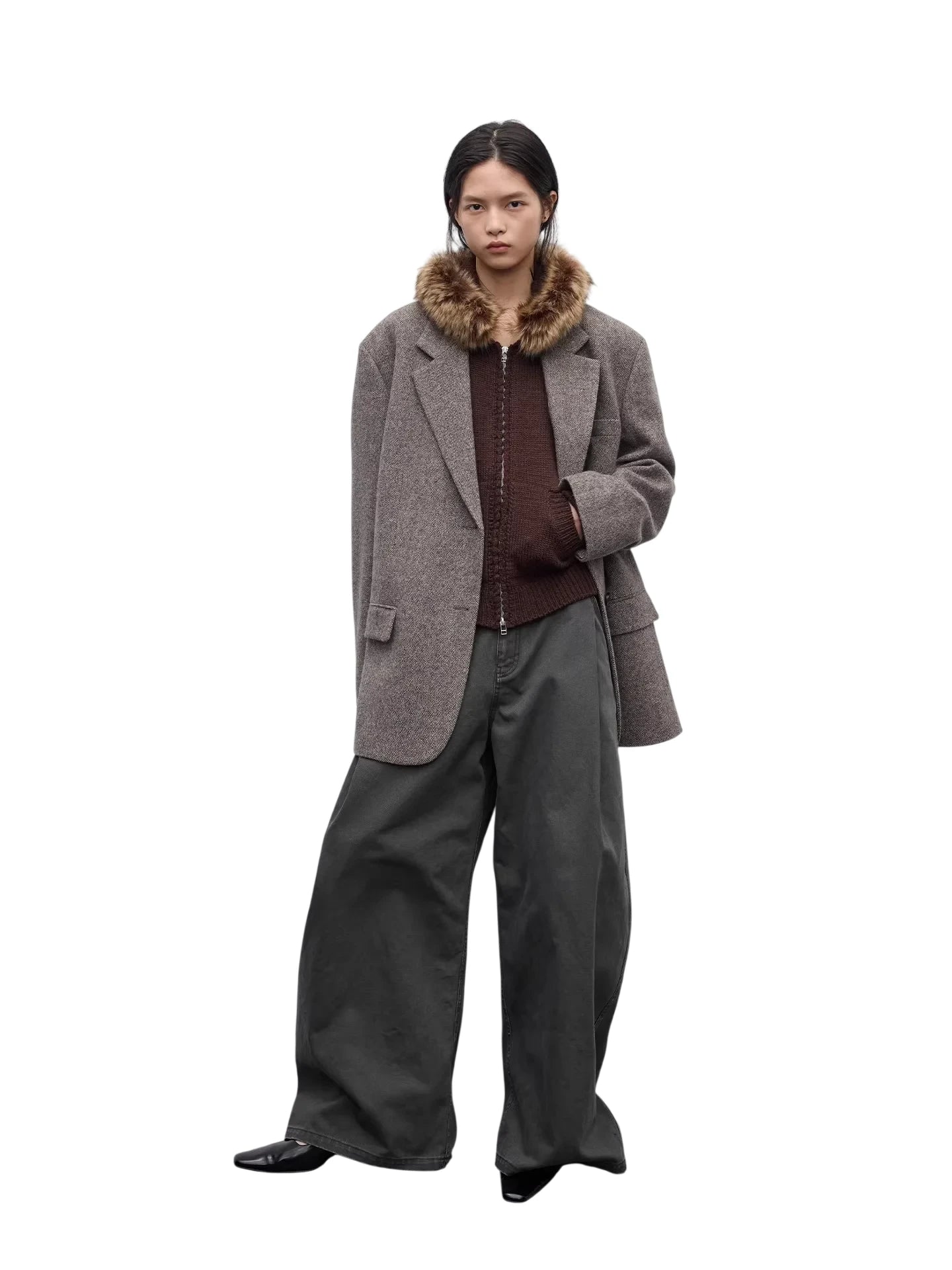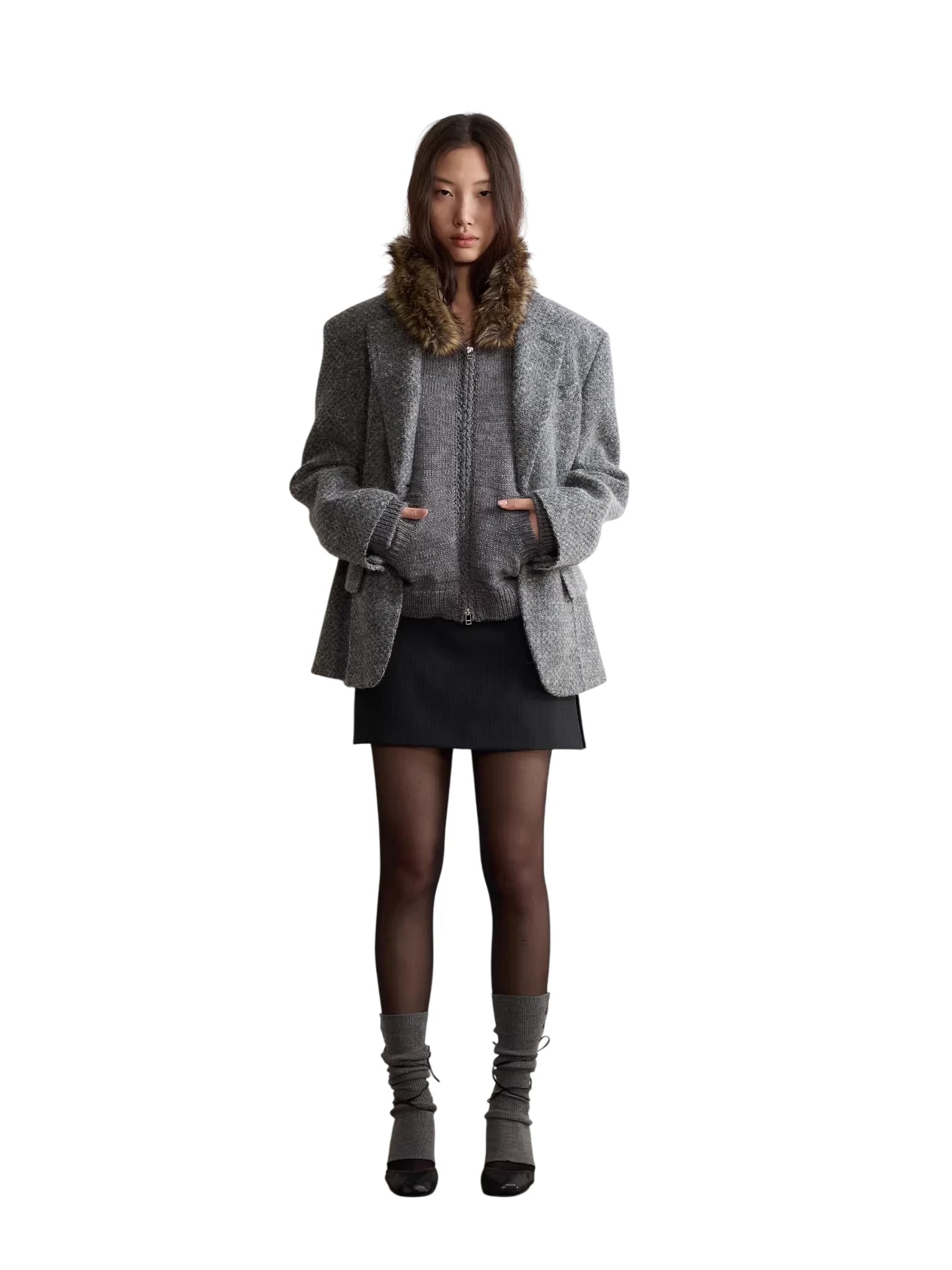 RandomPiece Women's Textured Wool Blend Blazer with Faux Fur Collar