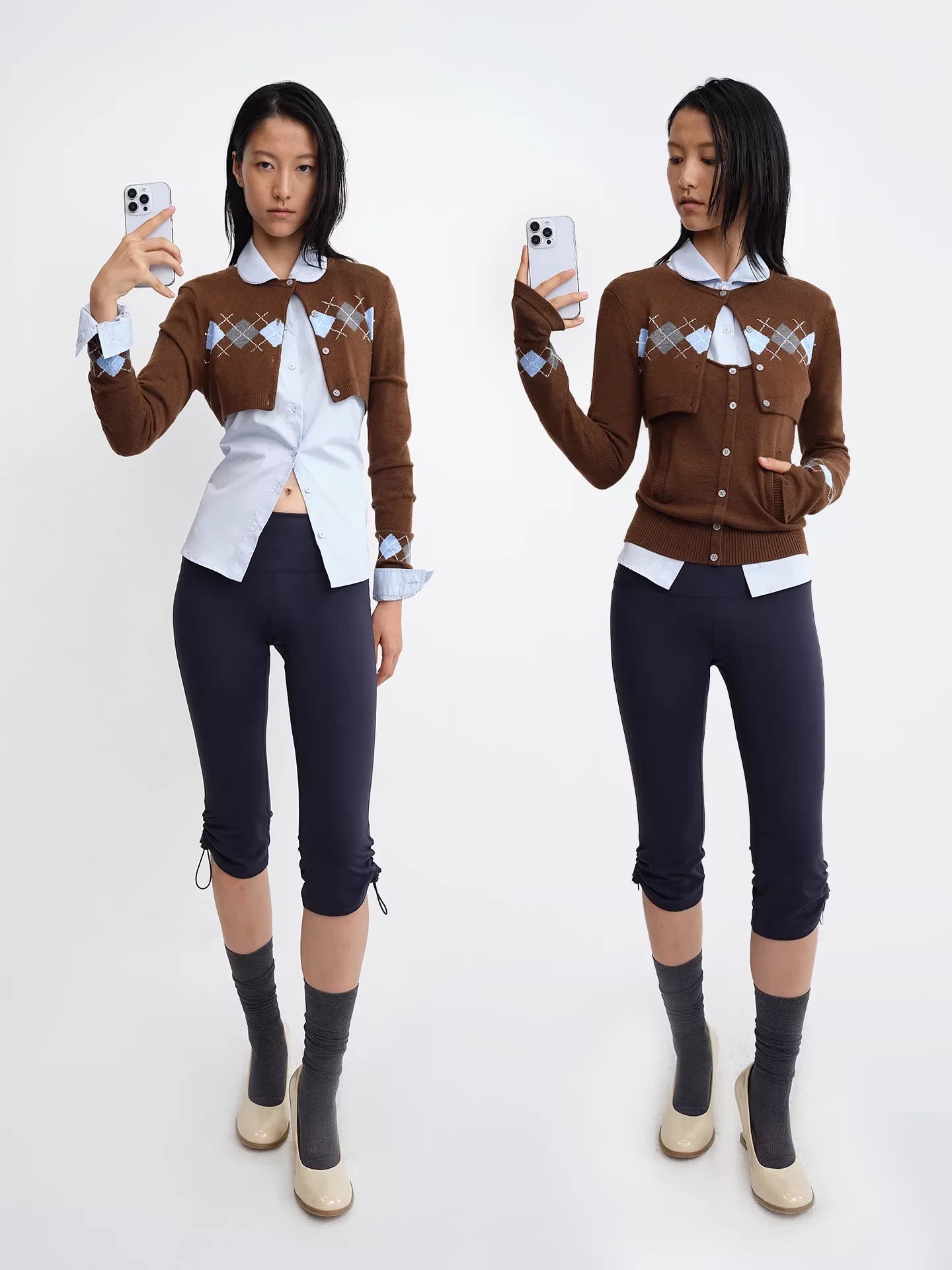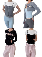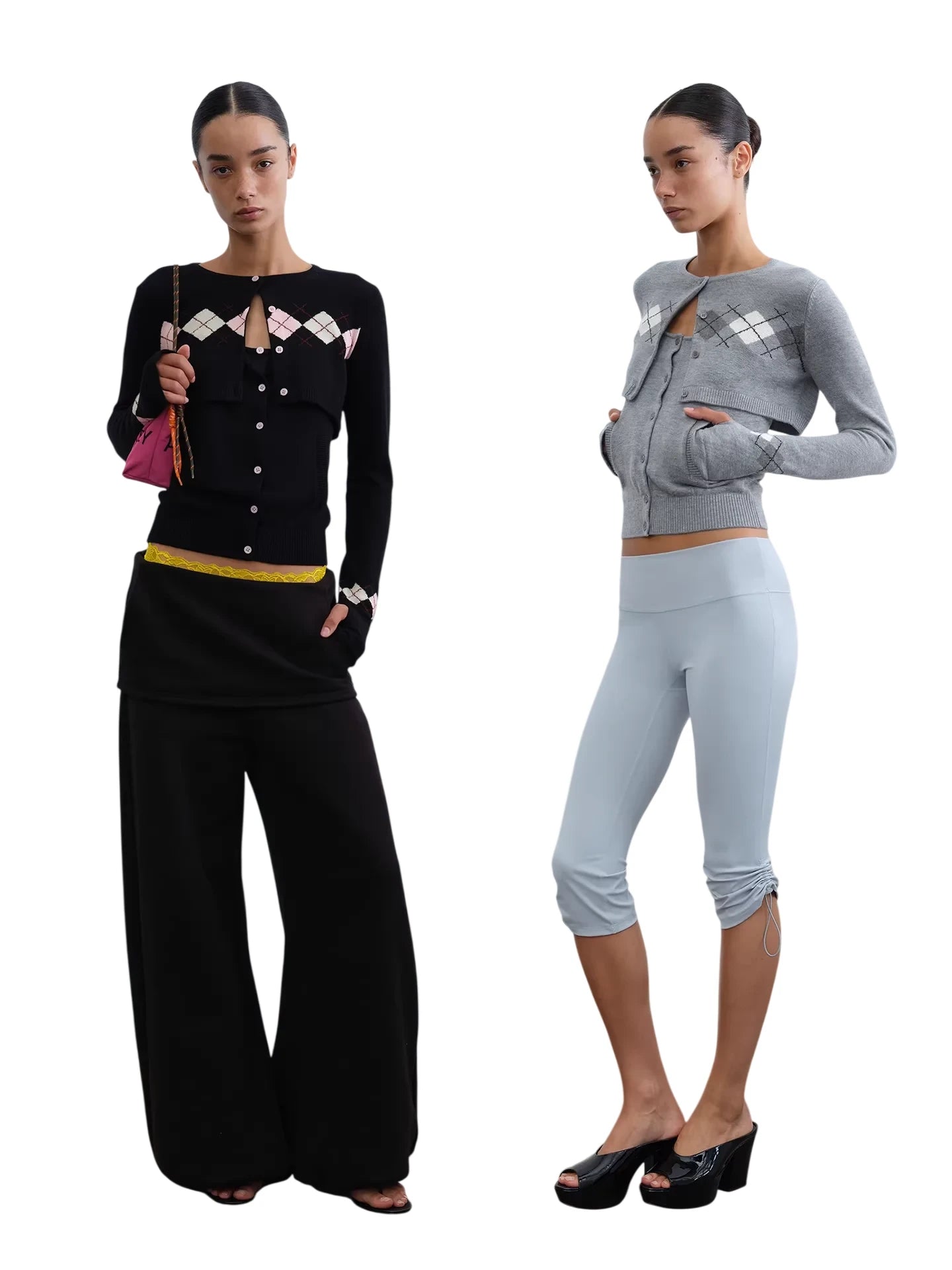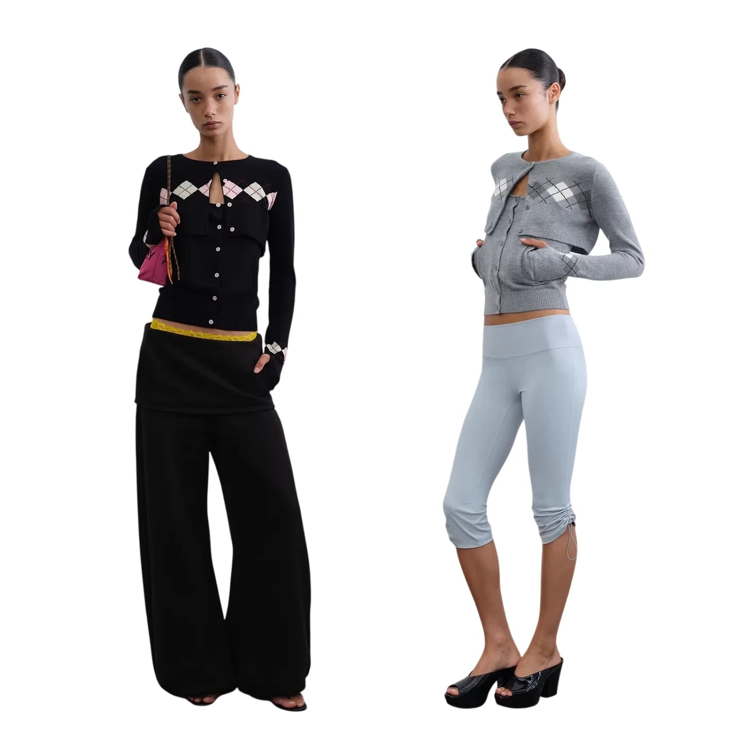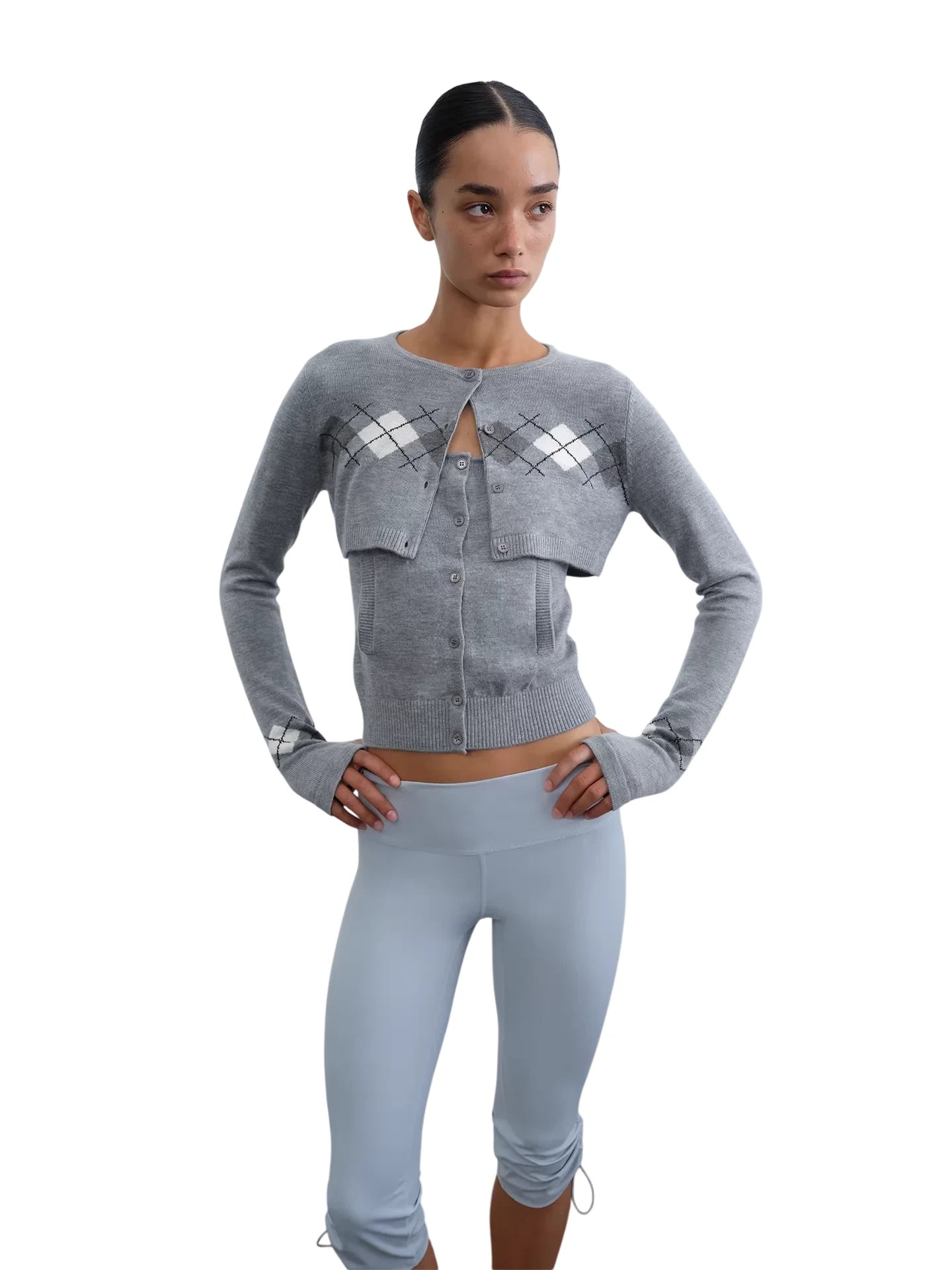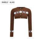 This women's two-piece set includes a cropped cardigan and matching camisole featuring a classic argyle pattern. With a fitted silhouette and button closures, the cardigan layers stylishly over the coordinating top, creating a cohesive, modern look. Perfect for casual-chic styling, this versatile set elevates everyday wear with retro-inspired charm.
