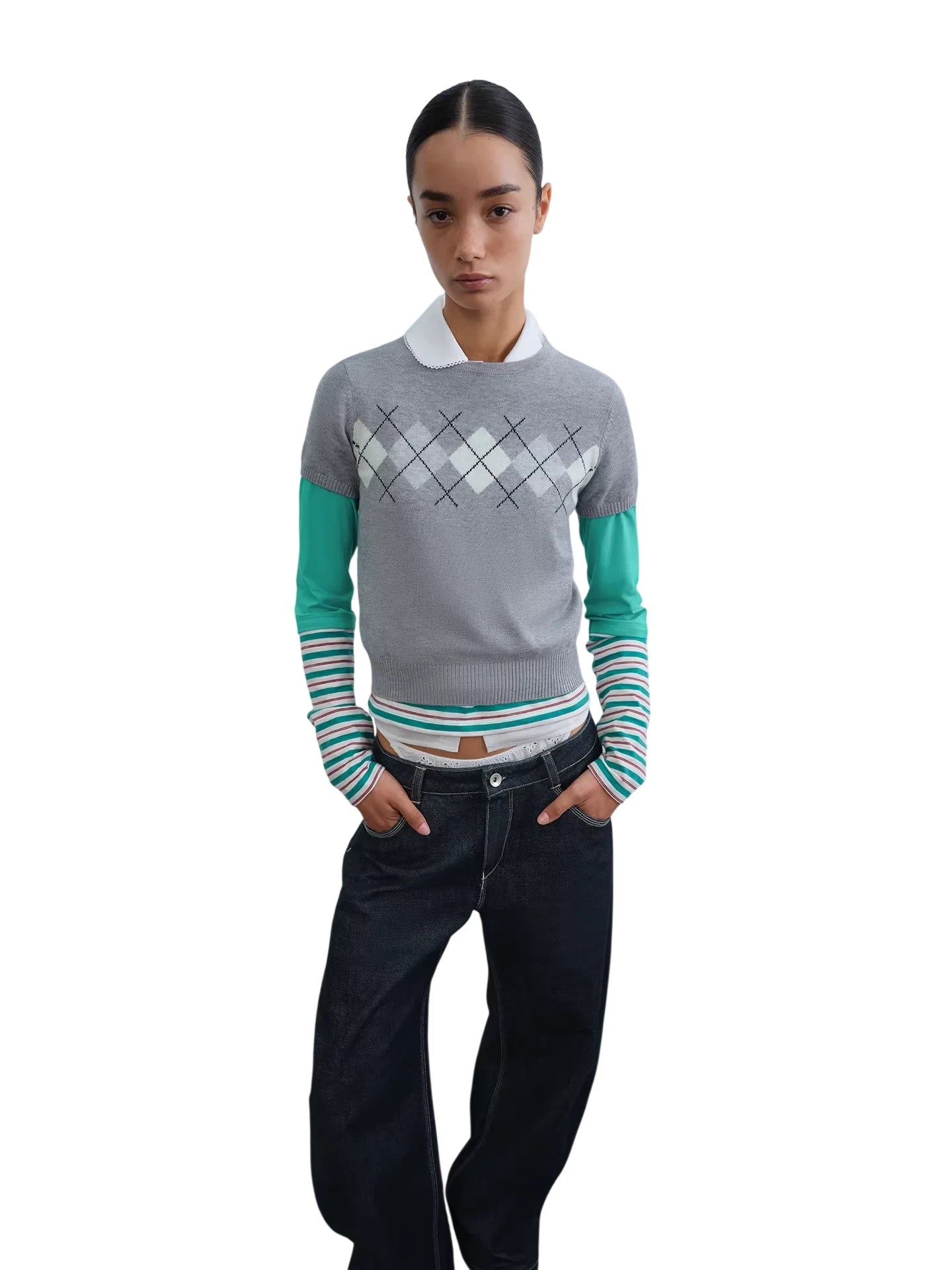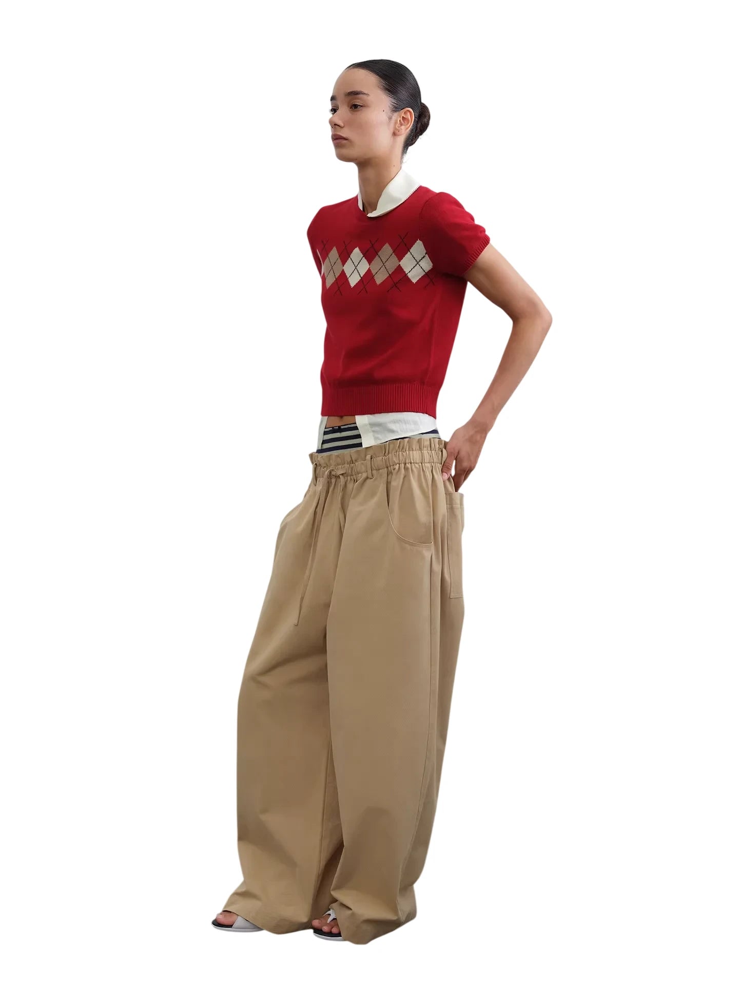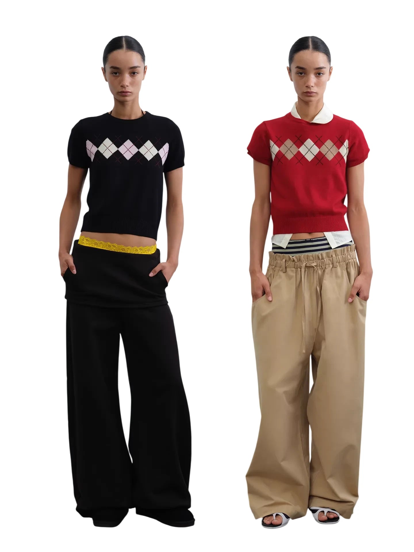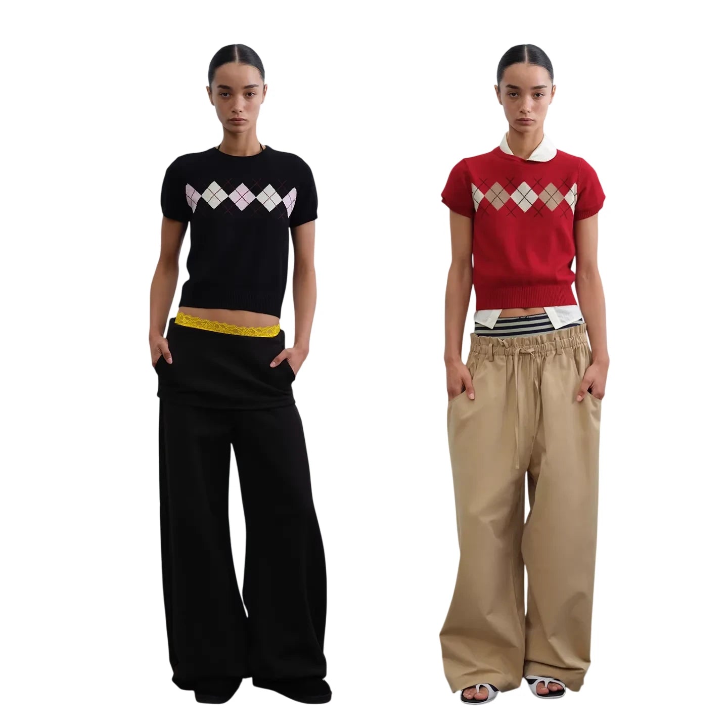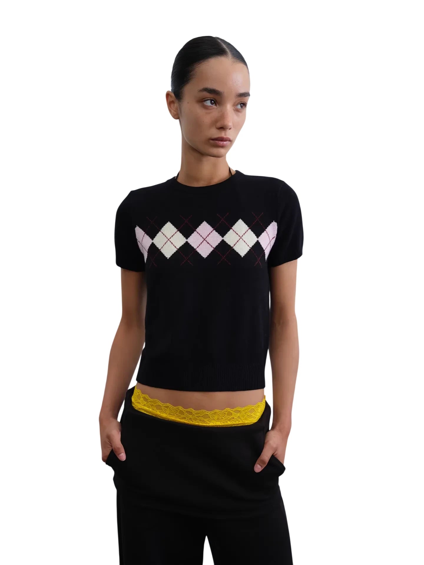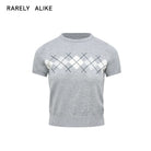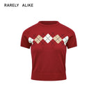 This stylish short-sleeve knit top features a bold argyle pattern across the chest, adding a touch of retro charm to a modern silhouette. Its cropped design pairs effortlessly with high-waisted trousers, making it a versatile addition to any casual wardrobe. Available in variations such as black with pink and white accents or red layered over a white collared shirt. Perfect for women seeking a contemporary yet comfortable everyday look.