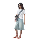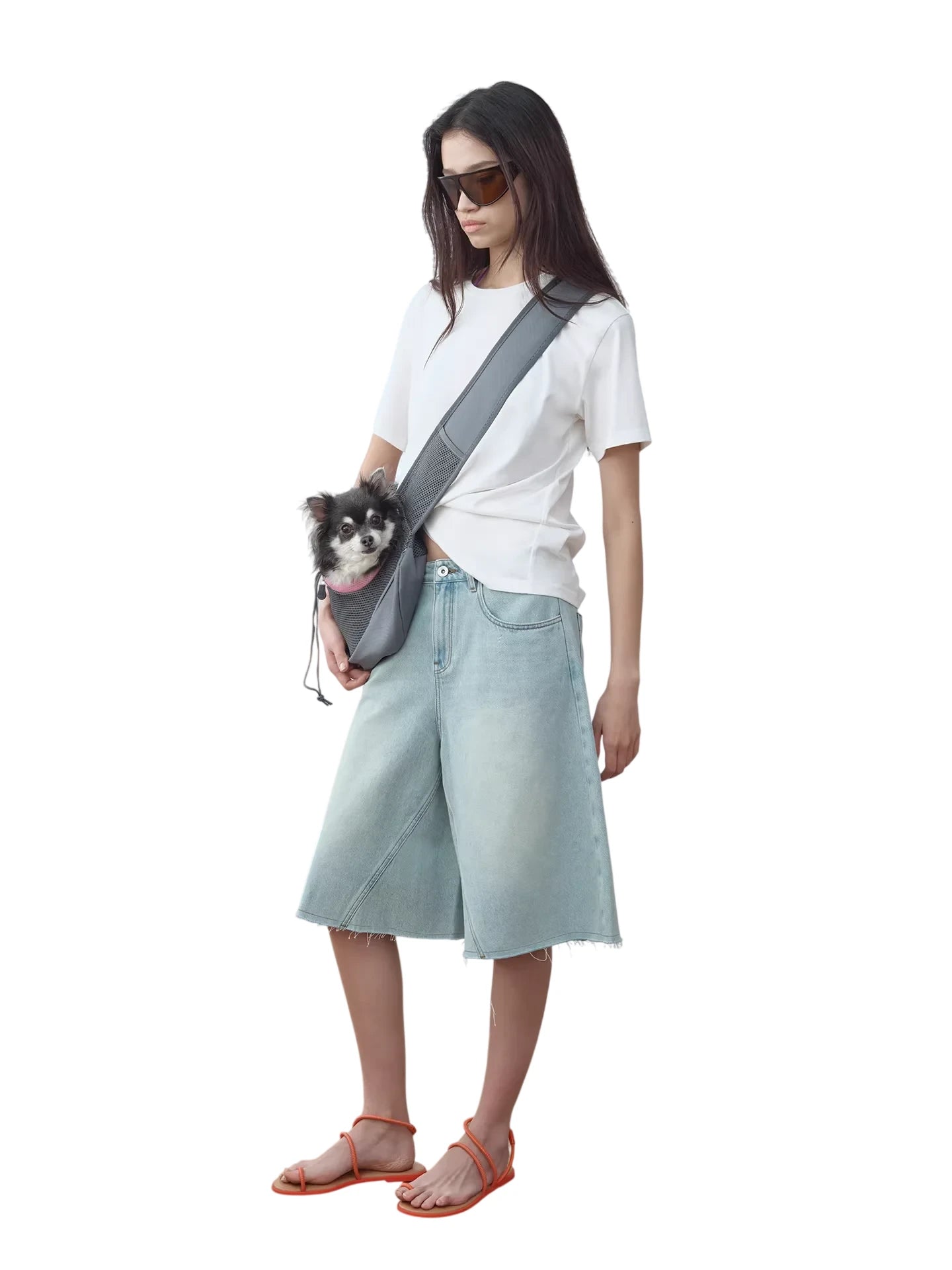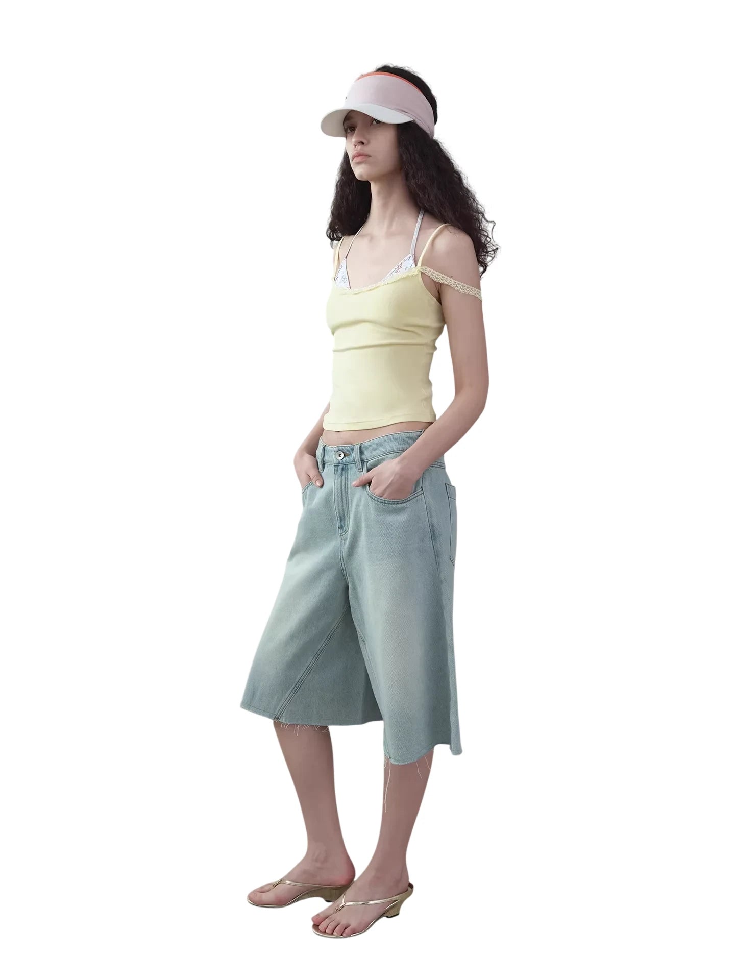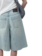 These light blue A-line denim capri shorts offer a relaxed and casual look, ideal for warm-weather wear. Designed with a flattering wide-leg silhouette, they feature knee-length cuts and raw hems for a touch of laid-back style. Perfect for everyday comfort, they pair easily with your favorite tees and sandals. Modeled by a female model, these shorts are a great addition to any casual wardrobe.