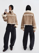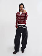 Modeled by a female, the look is elevated with thoughtful styling, including a partially visible pink belt and a relaxed layering of a ribbed cardigan over a white top. Ideal for casual days or styled-up outings, these jeans offer effortless versatility and edge.