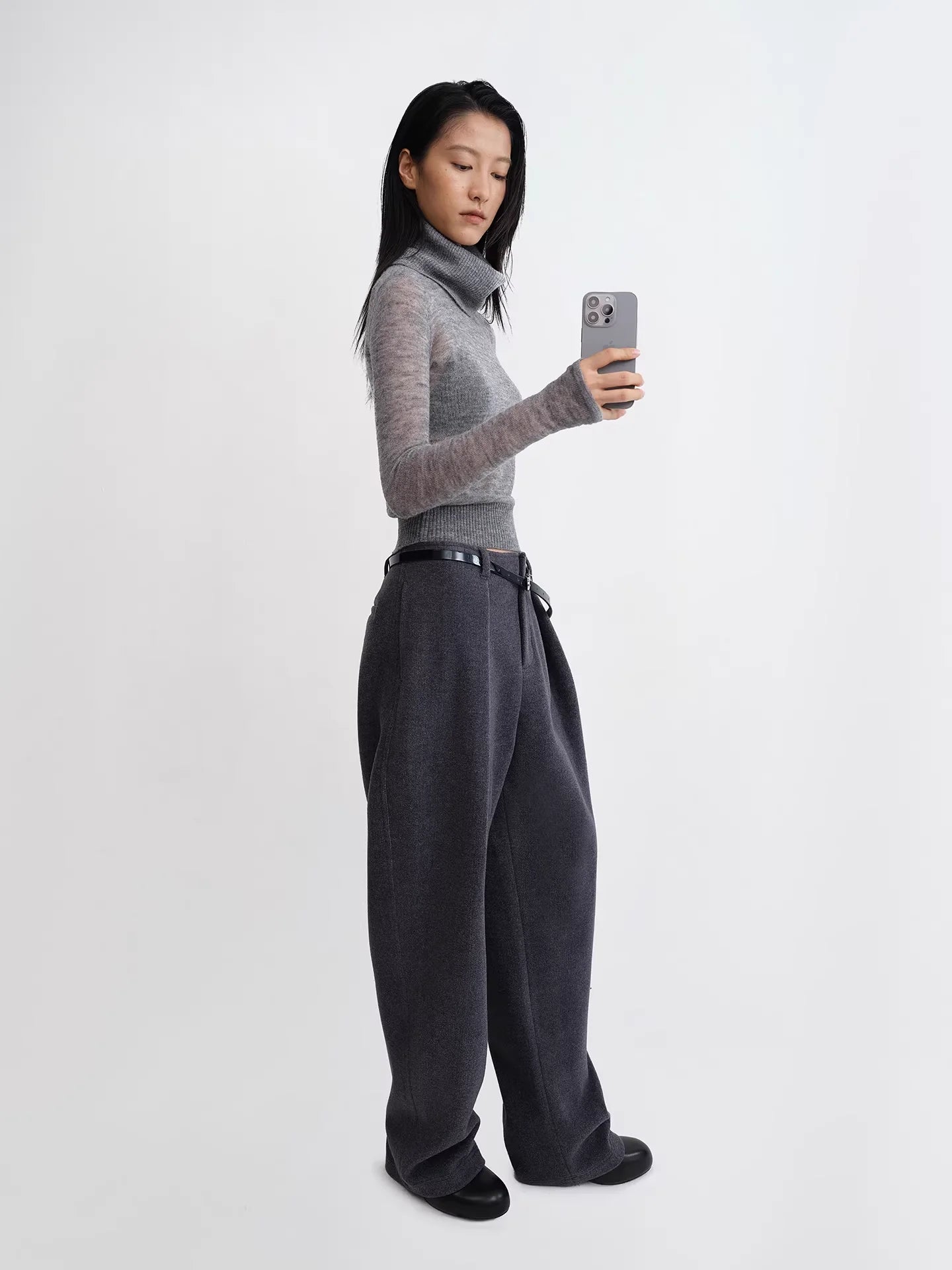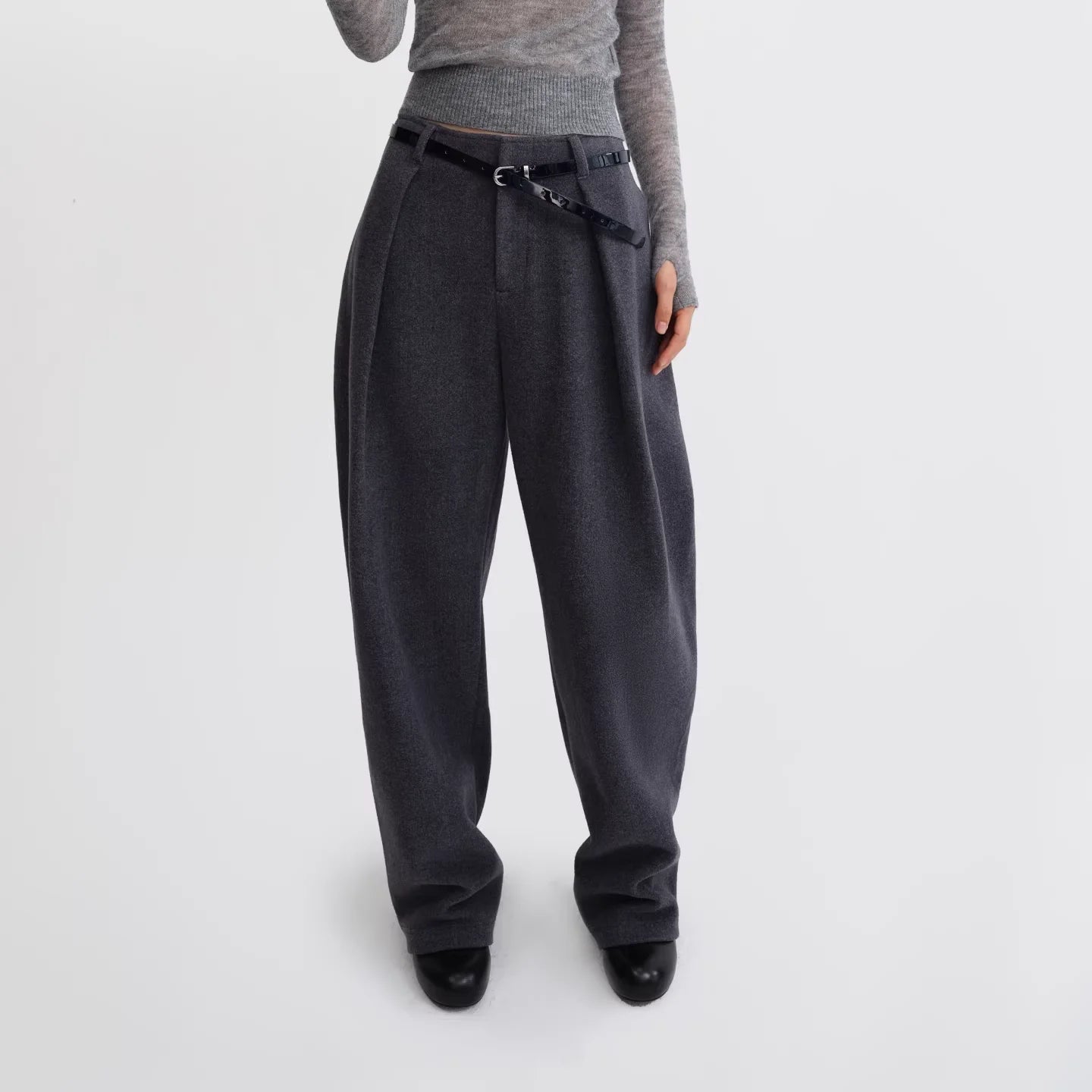 Elevate your wardrobe with these women's mid-rise trousers, crafted from a luxurious wool-blend fabric in a sophisticated dark gray and black palette. Designed with a pleated front and wide-leg silhouette, these trousers offer a relaxed yet structured fit that drapes elegantly to the floor. A high waistline defines the shape, enhanced by a glossy black belt with metallic detailing for a modern edge. Perfect for both elevated casual and refined professional settings.
