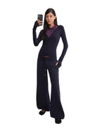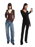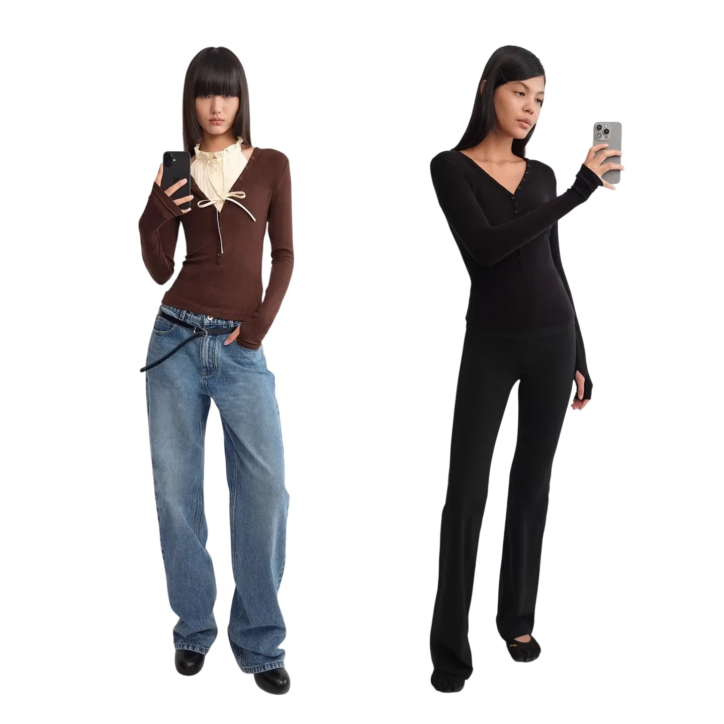 Styled here by female models, one showcases a chic look with a layered cream blouse and straight-leg jeans, while the other presents a monochrome ensemble with flared black pants—highlighting the top's adaptability for casual yet polished outfits.