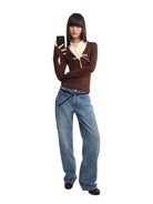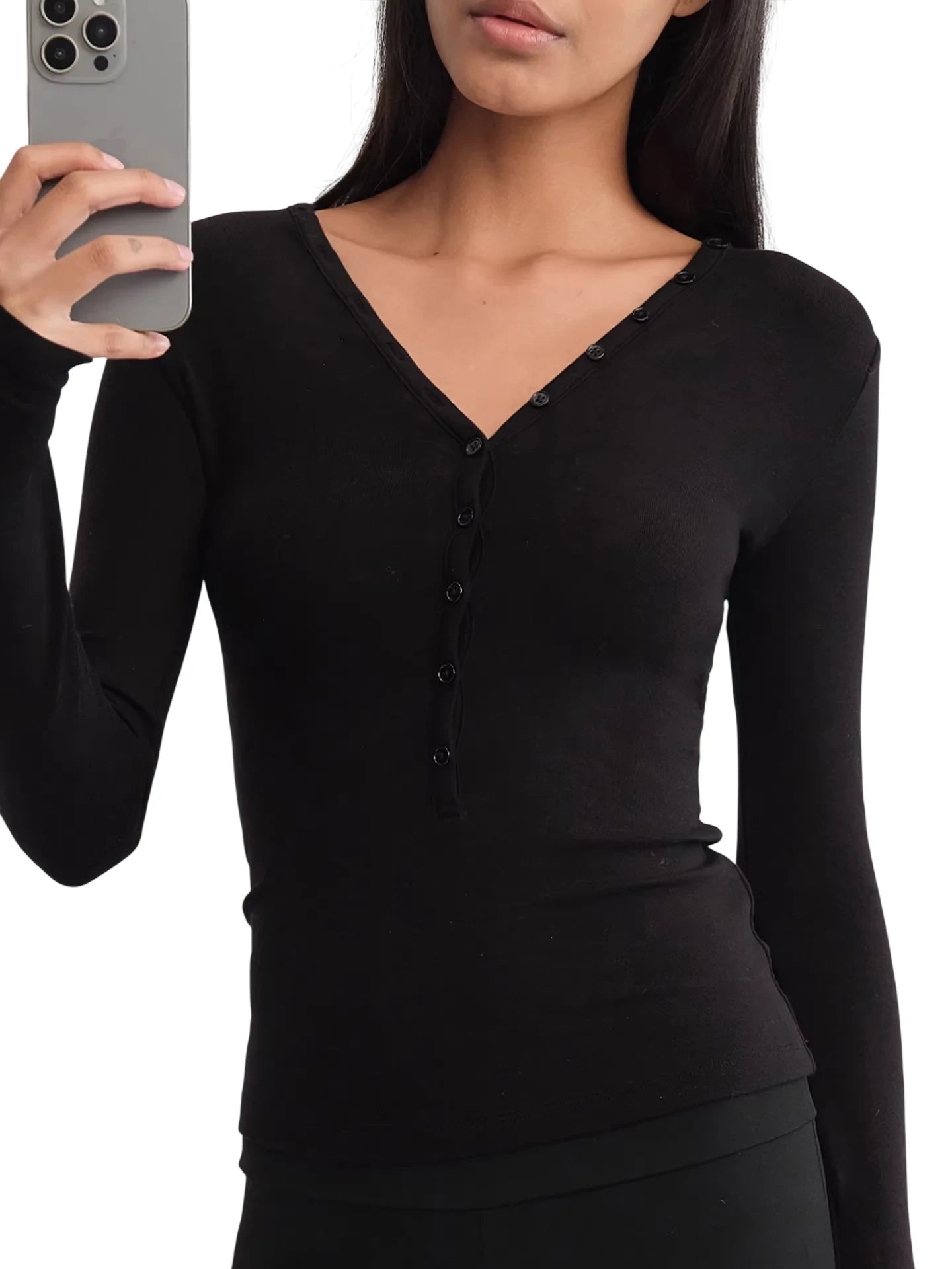 This slim fit V-neck knit top features button detailing and long sleeves with modern thumb holes for added style. Designed for a flattering, contoured fit, it is available in brown, navy, and black color options. Perfect for layering or wearing alone, this versatile top suits contemporary fashion preferences.
