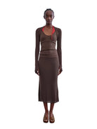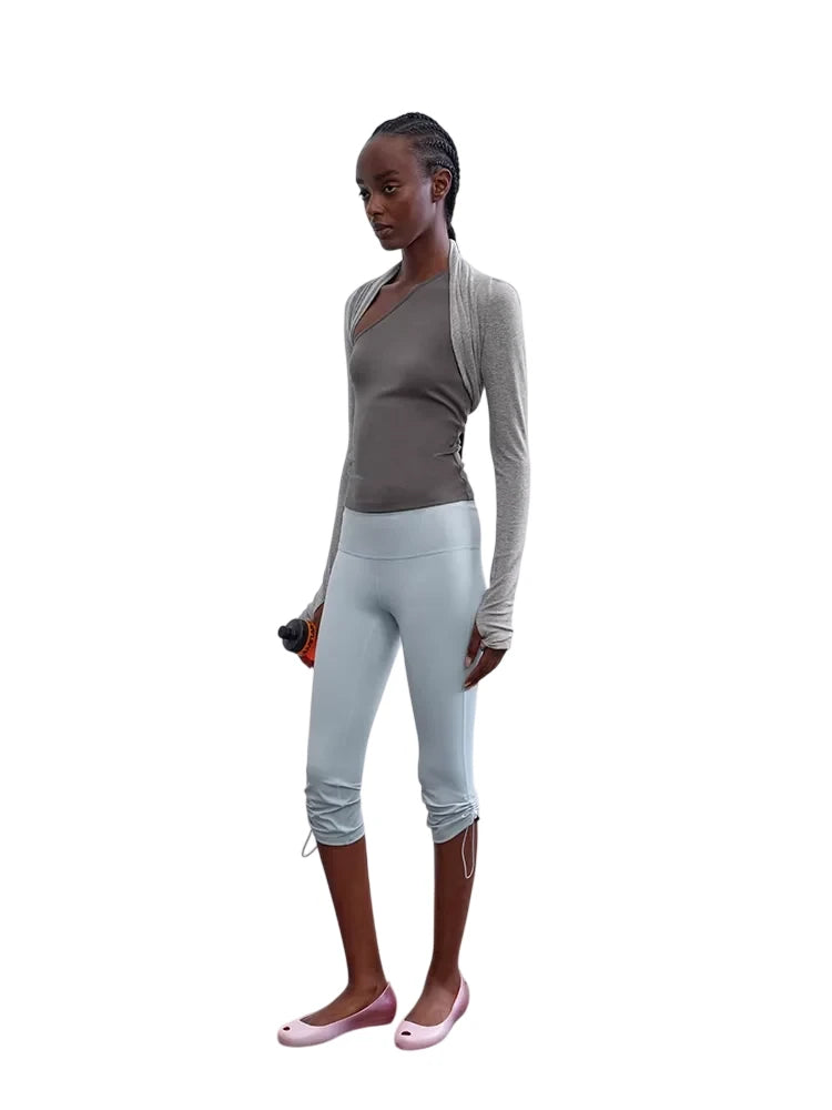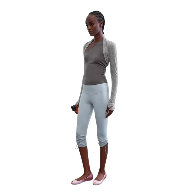 Designed for both comfort and style, these slim fit knitted arm sleeves are crafted from a soft Tencel wool blend, offering a lightweight and breathable layer. The two-tone design in brown and light heather gray adds a subtle contrast, perfect for layering during light workouts or casual outings. Worn here by a female model, these sleeves effortlessly complement a range of activewear looks.