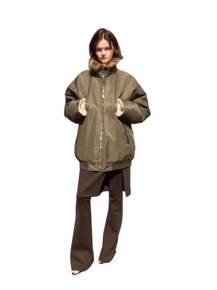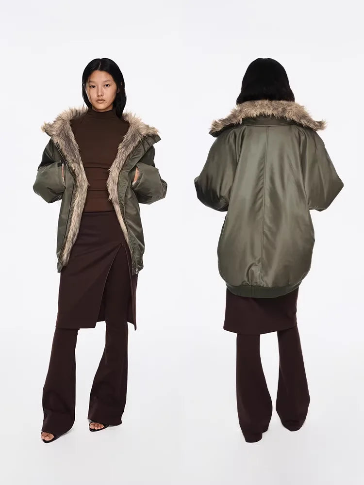 RARELY ALIKE Women's Oversized Fur-Lined Bomber Jacket - Black/Army Green
