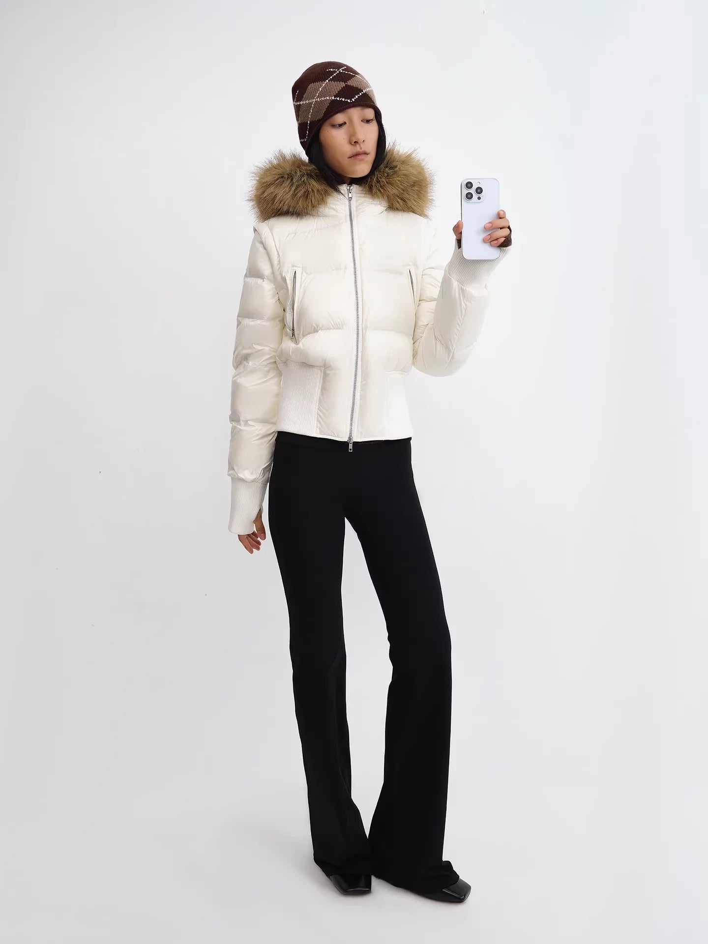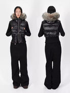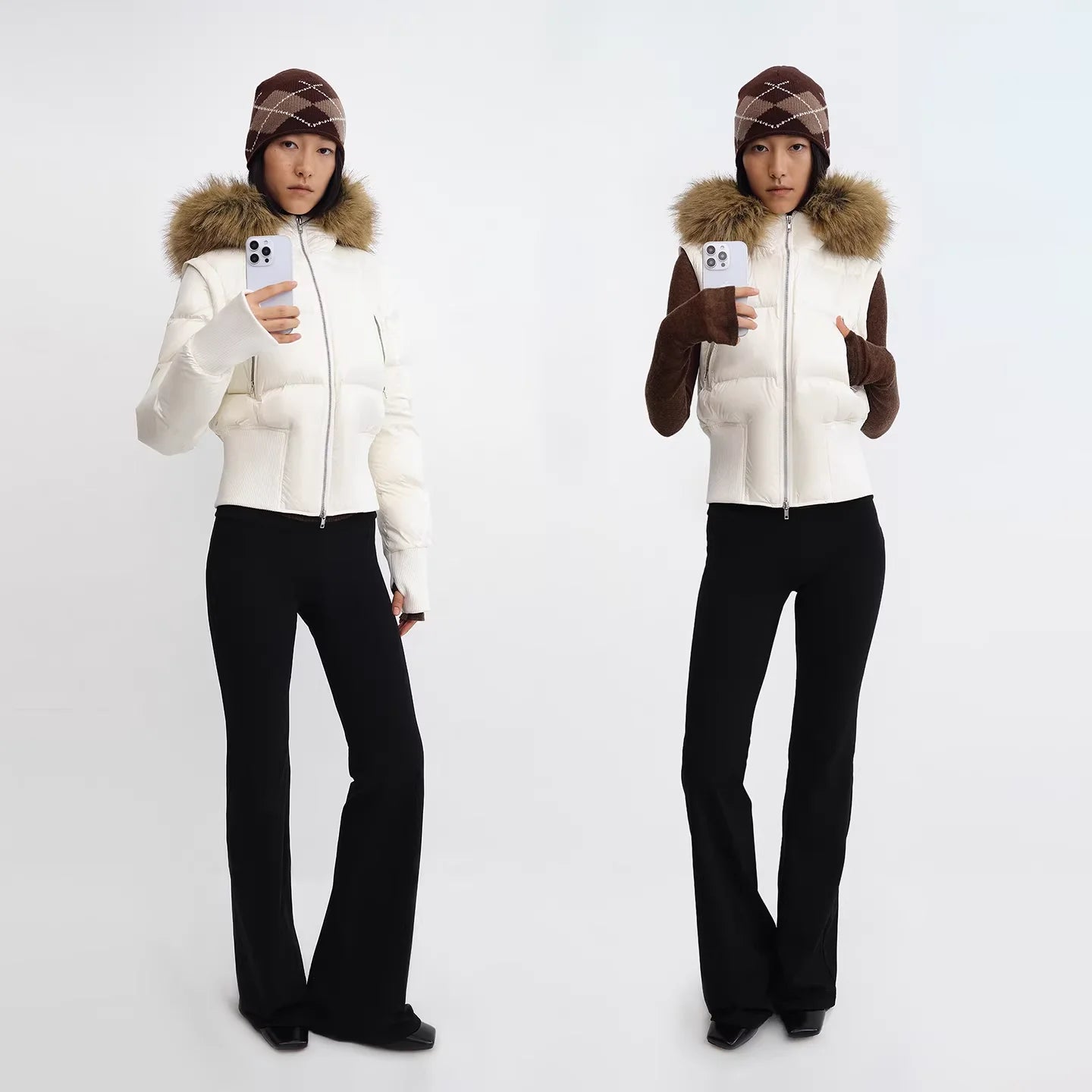 Stay stylish and warm with this women's short down jacket, featuring a luxurious large fur collar and a flattering cinched waist. Designed for versatility, the sleeves are detachable, allowing for multiple styling options. The tailored fit and cropped length create a sleek silhouette, paired perfectly with fitted pants or casual wear.