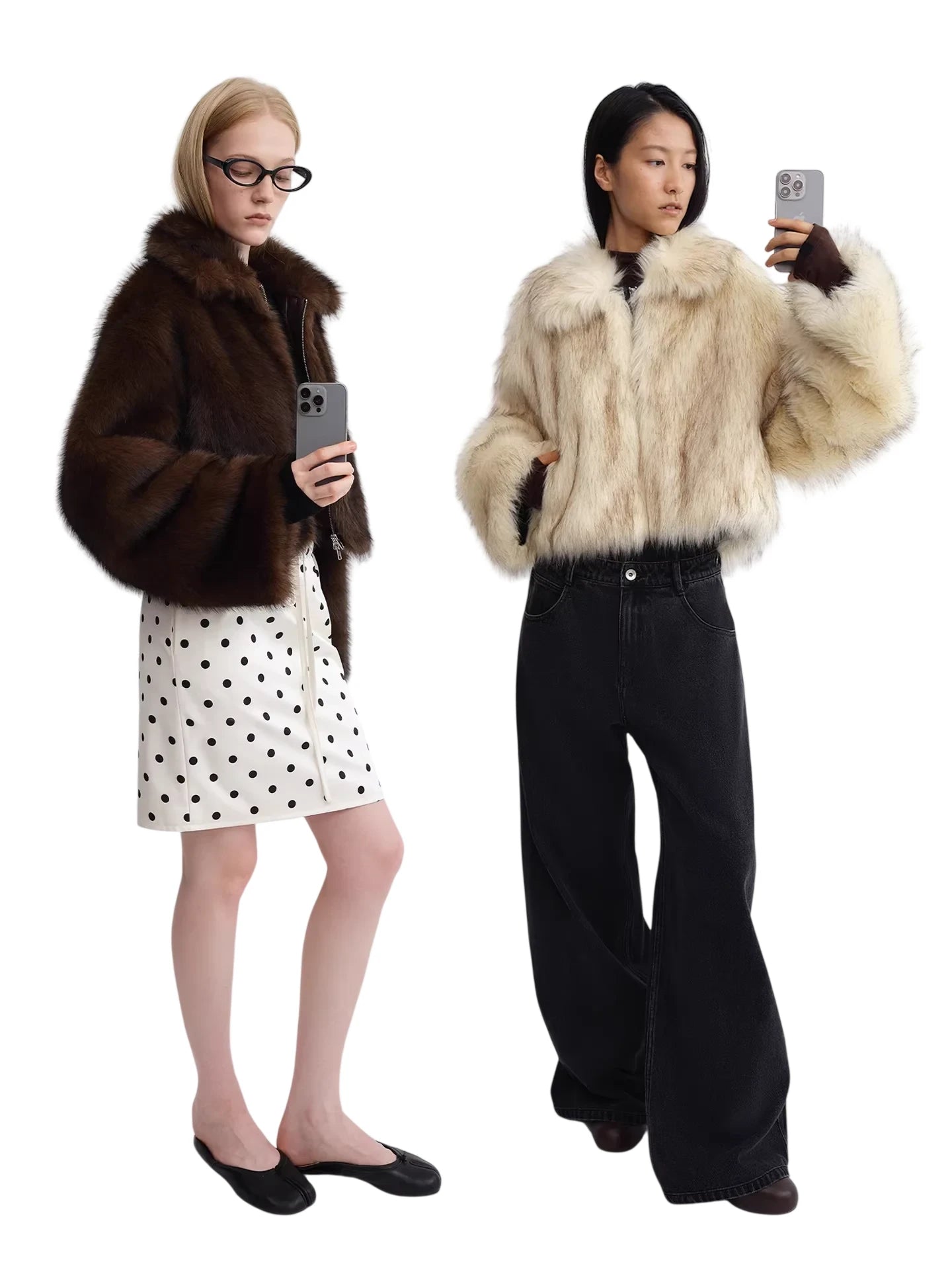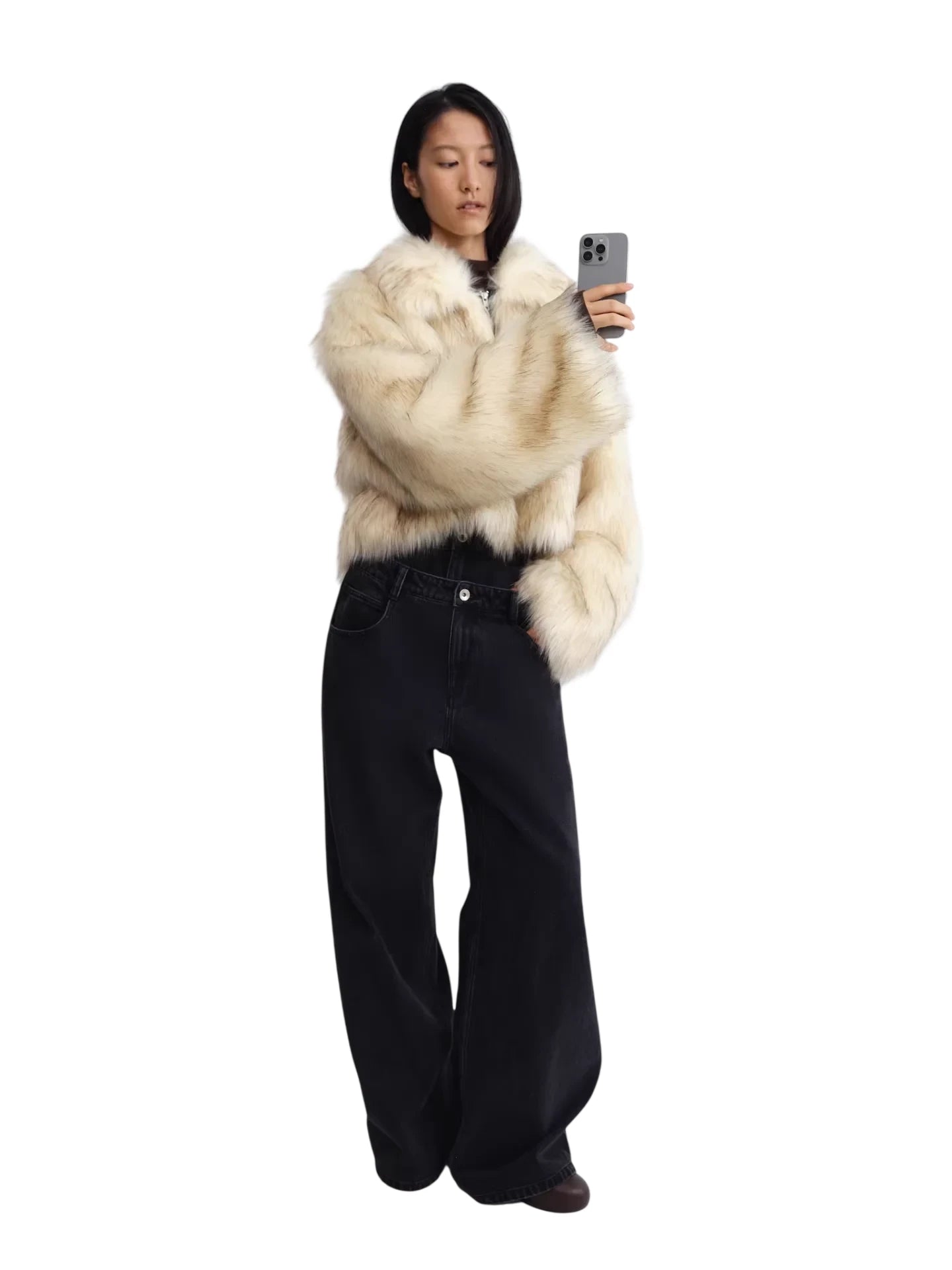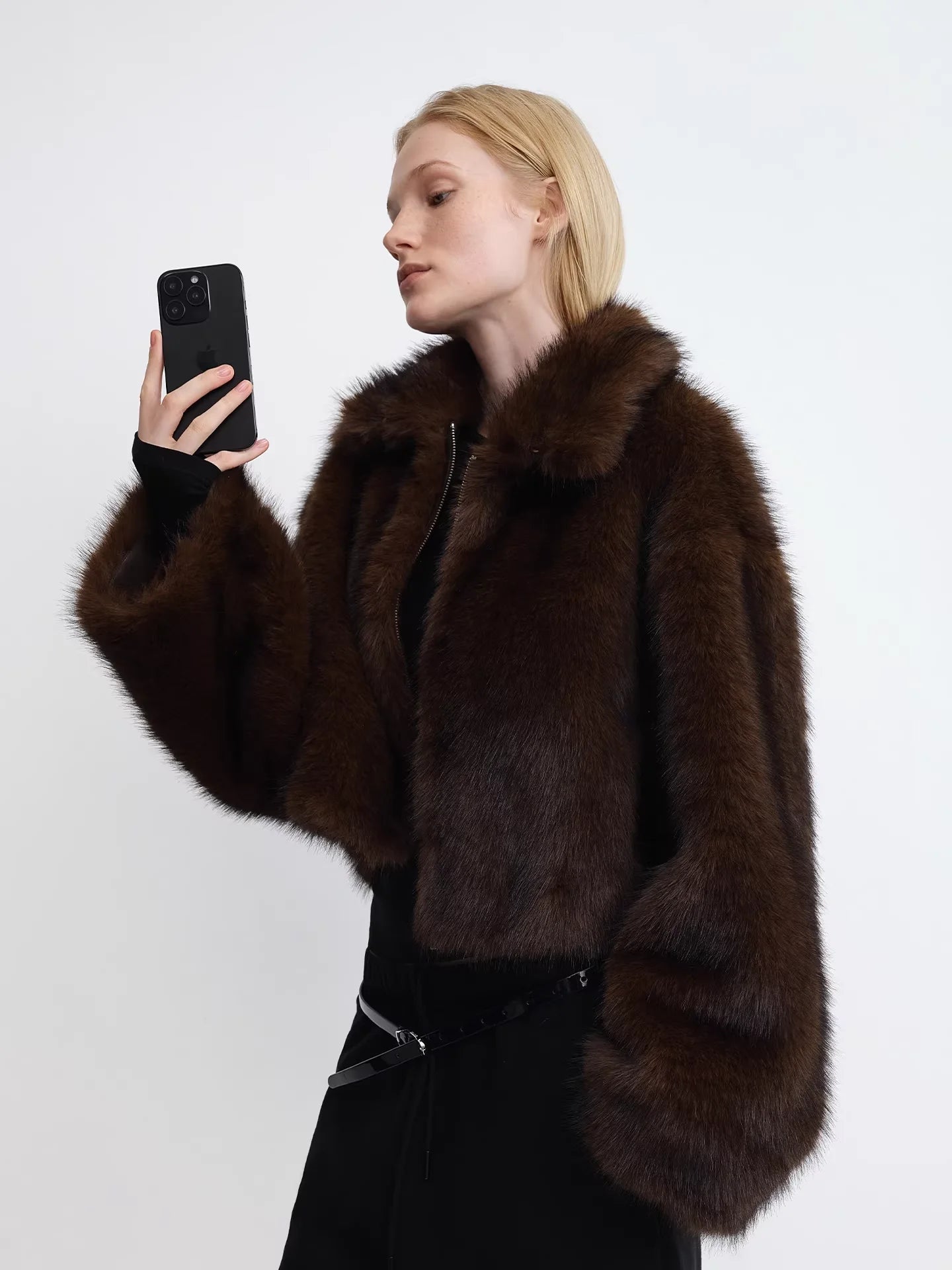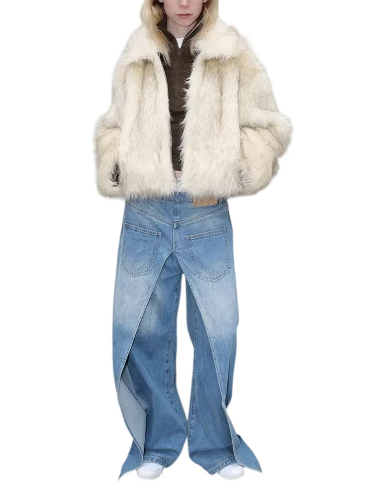 RARELY ALIKE Short Faux Fur Jacket with Suede Lining in Dark Coffee and White