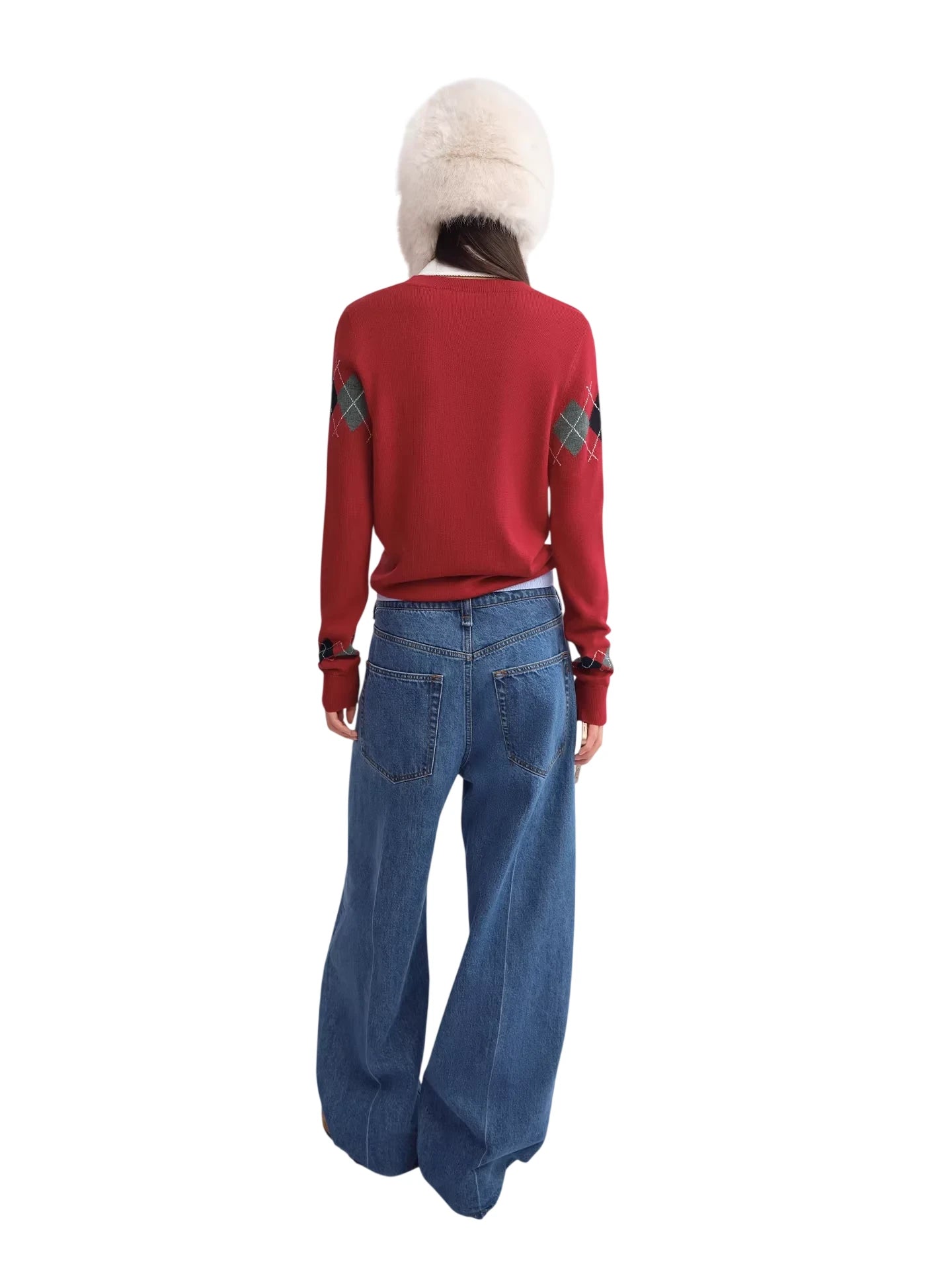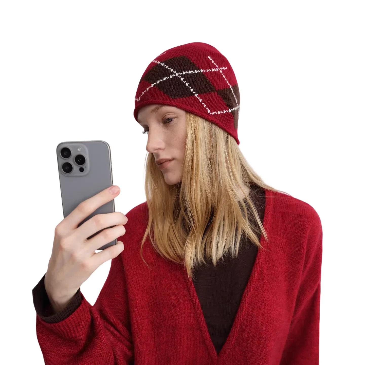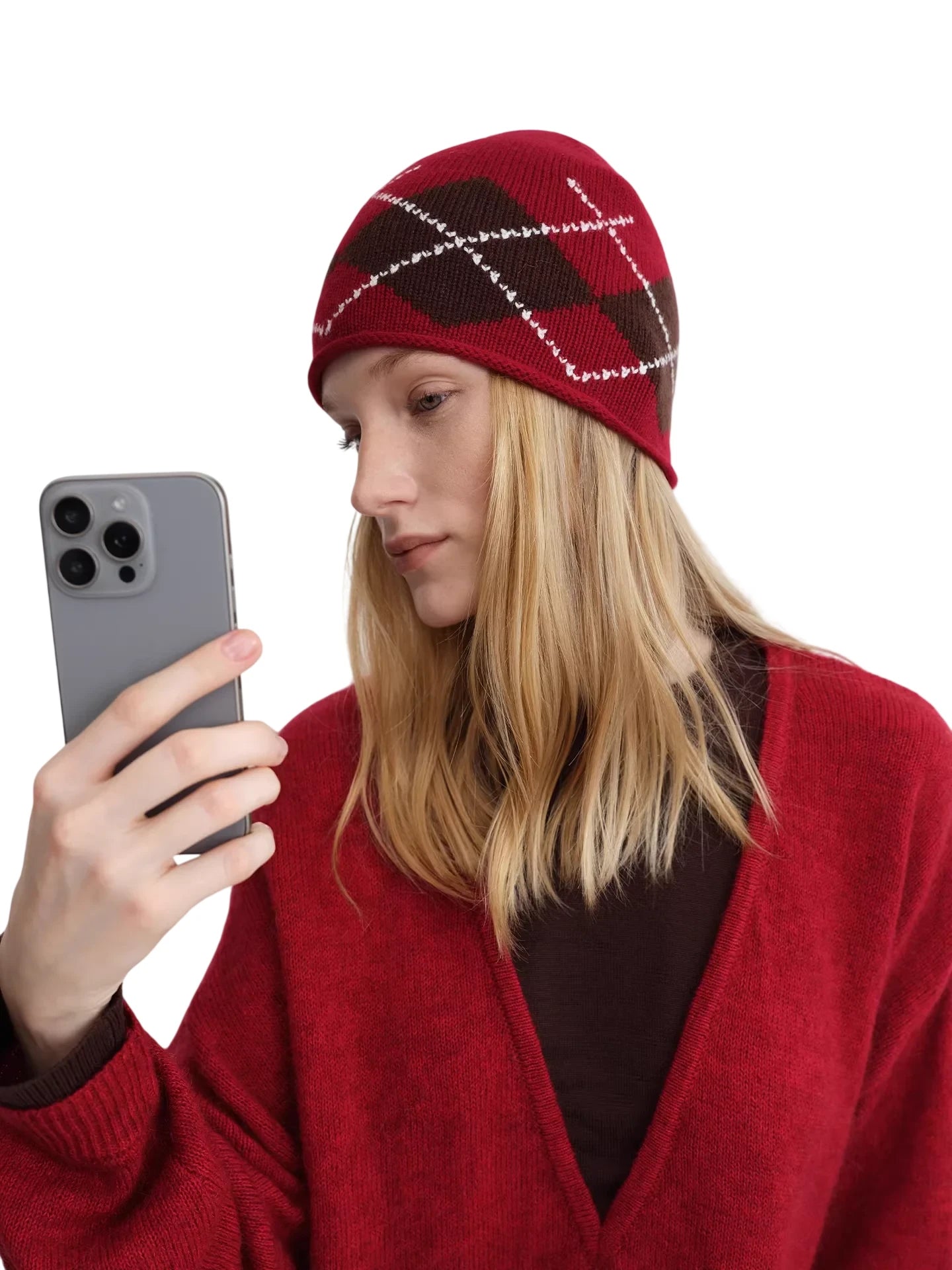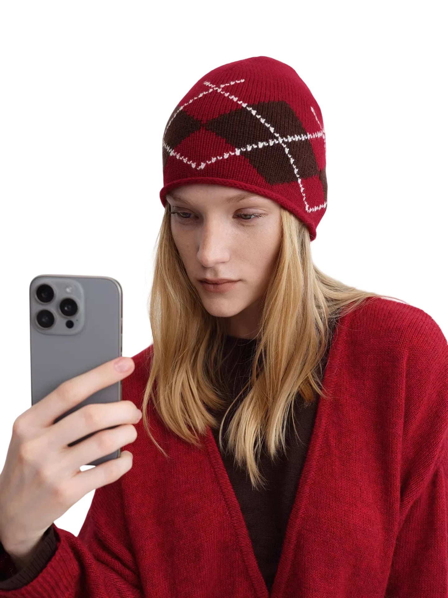 RARELY ALIKE Diamond Pattern Wool Beanie - Red, Brown & Gray