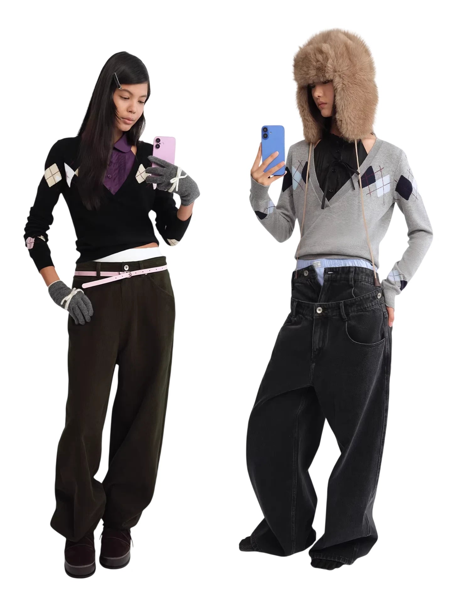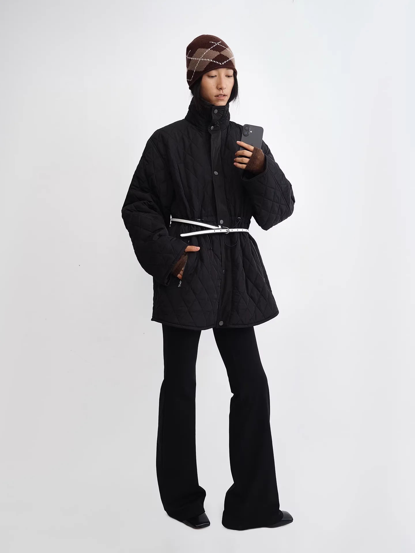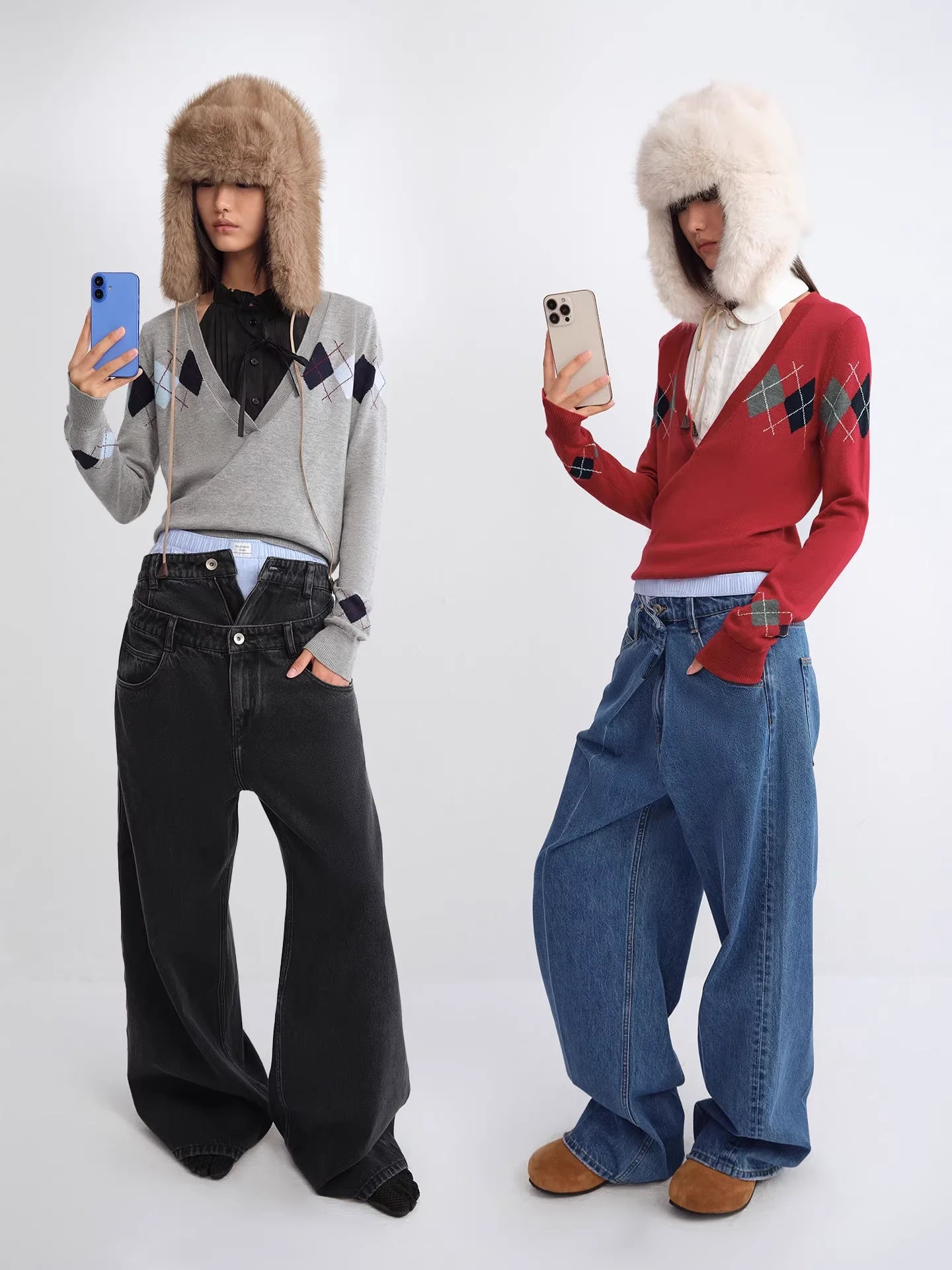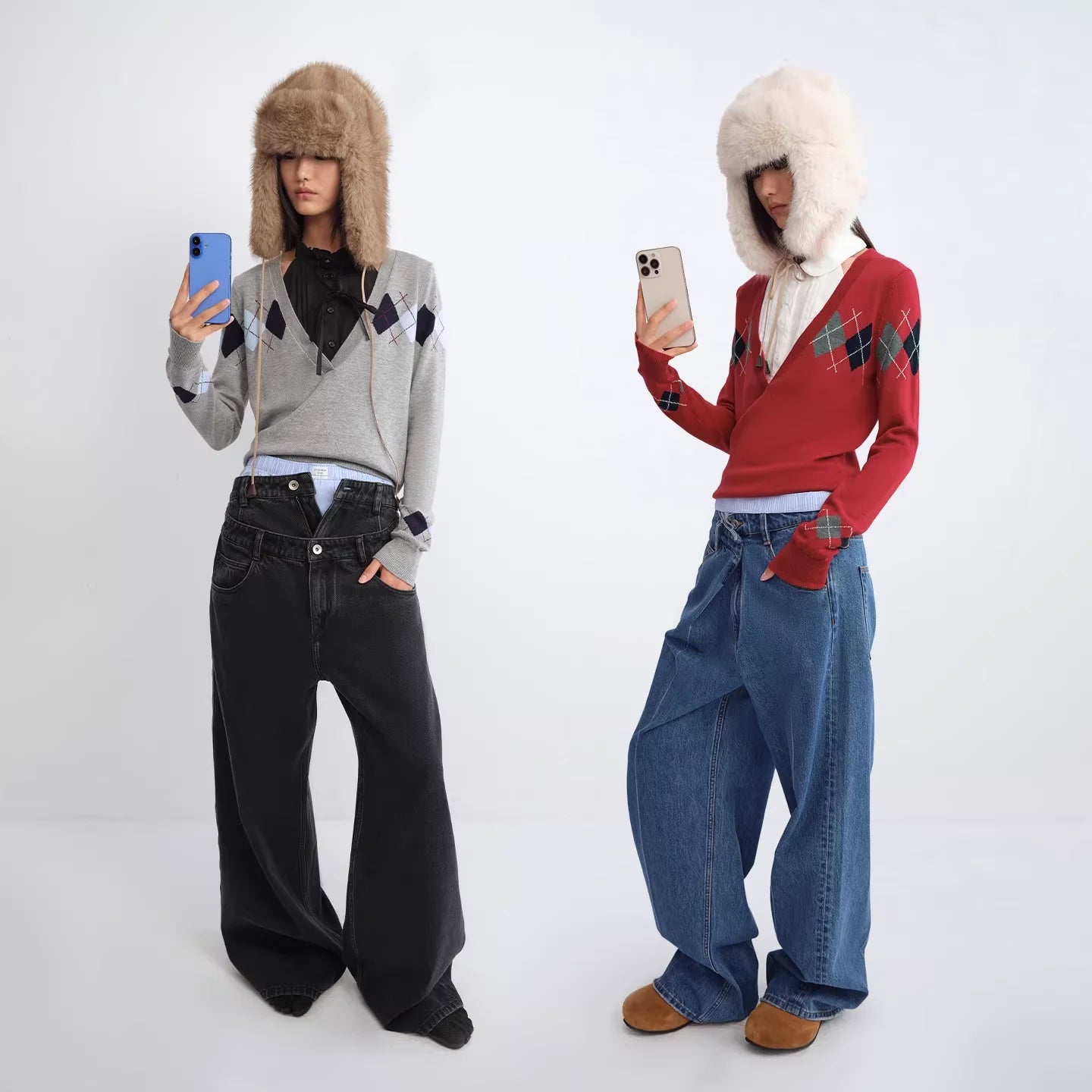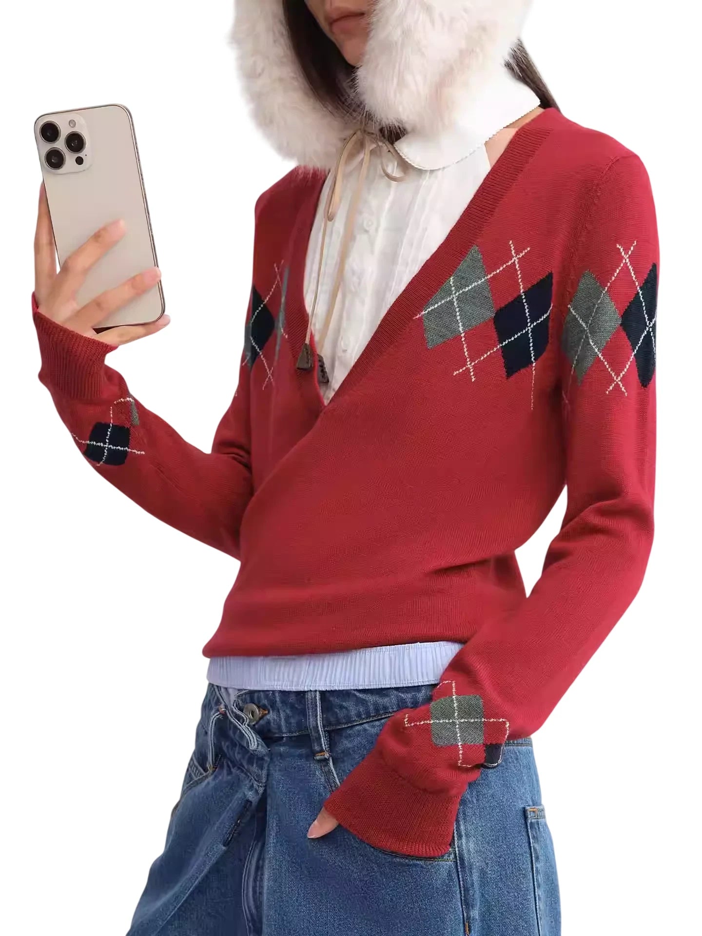 RARELY ALIKE Diamond Pattern Wool Beanie - Red, Brown & Gray