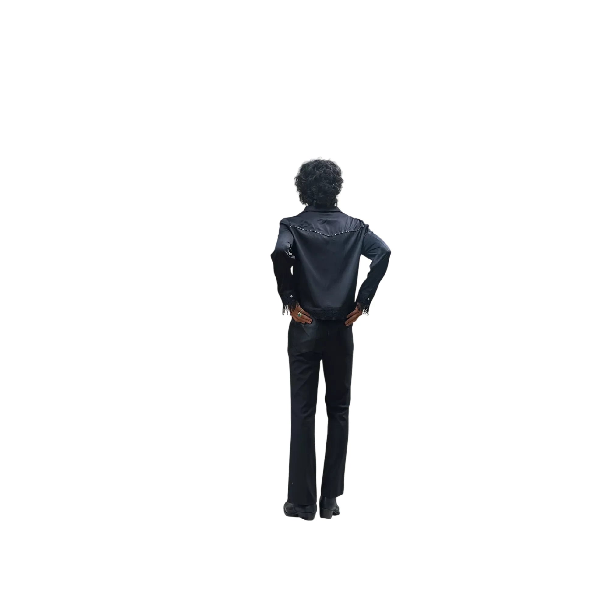 This stylish men's shirt jacket blends classic tailoring with contemporary details. Featuring a sleek all-black design, it is accented with elegant ribbon and tassel embellishments, complemented by metallic studs for a refined edge. The draped silhouette and lightweight construction make it ideal for spring and summer layering.