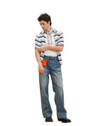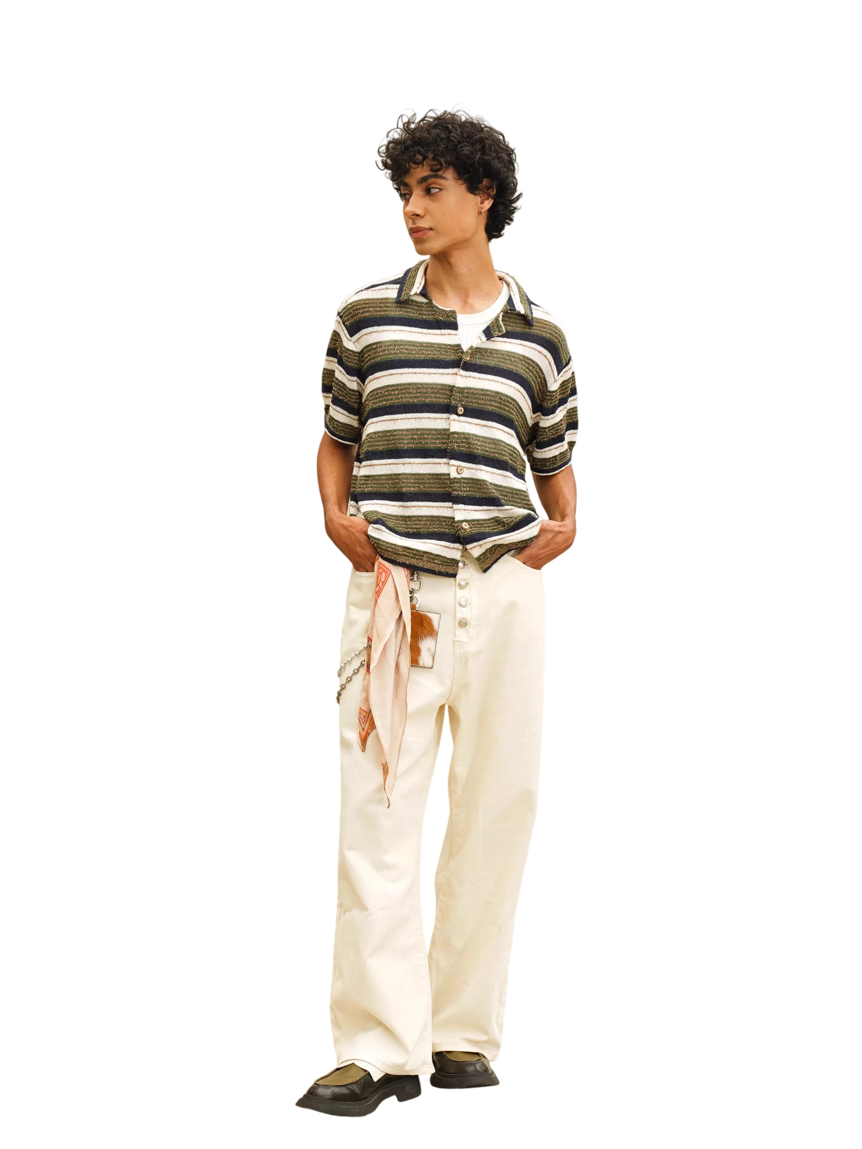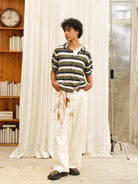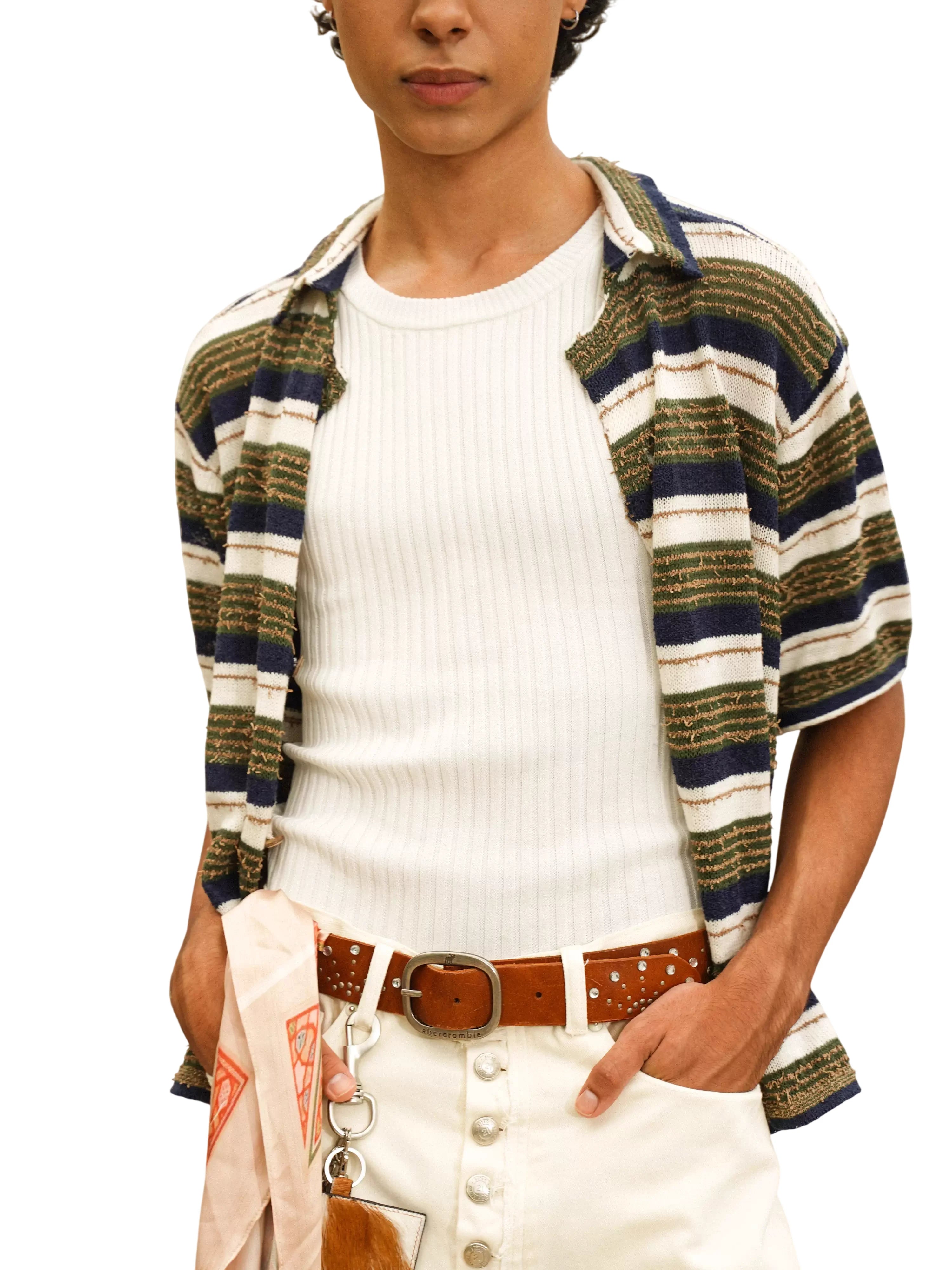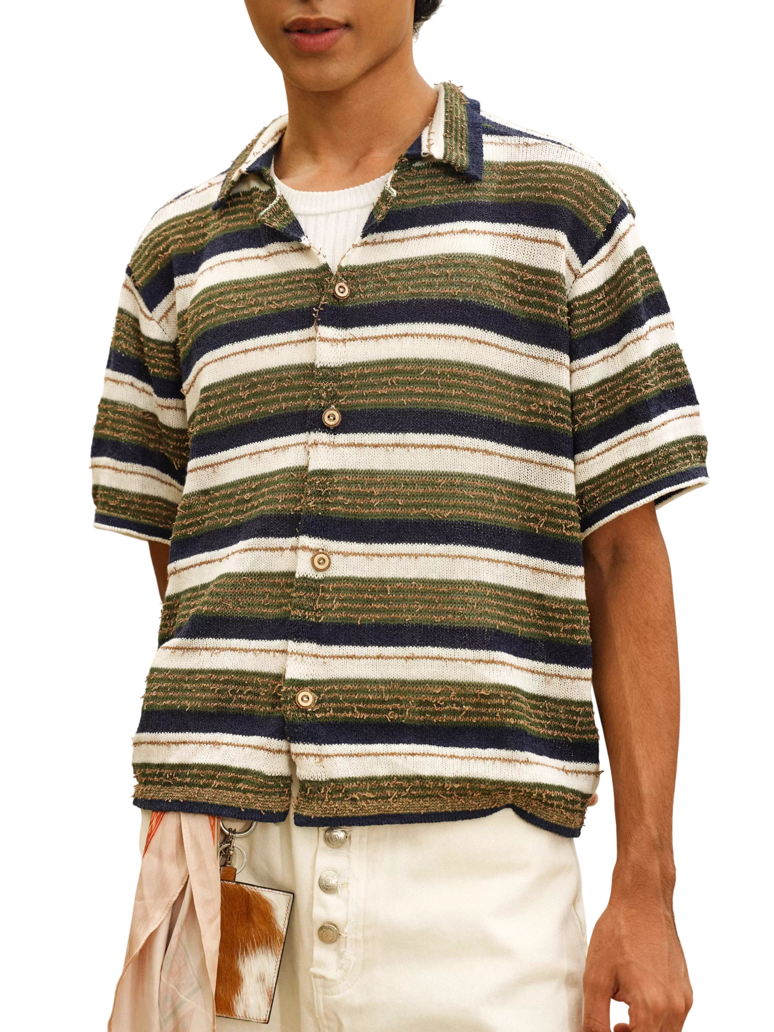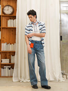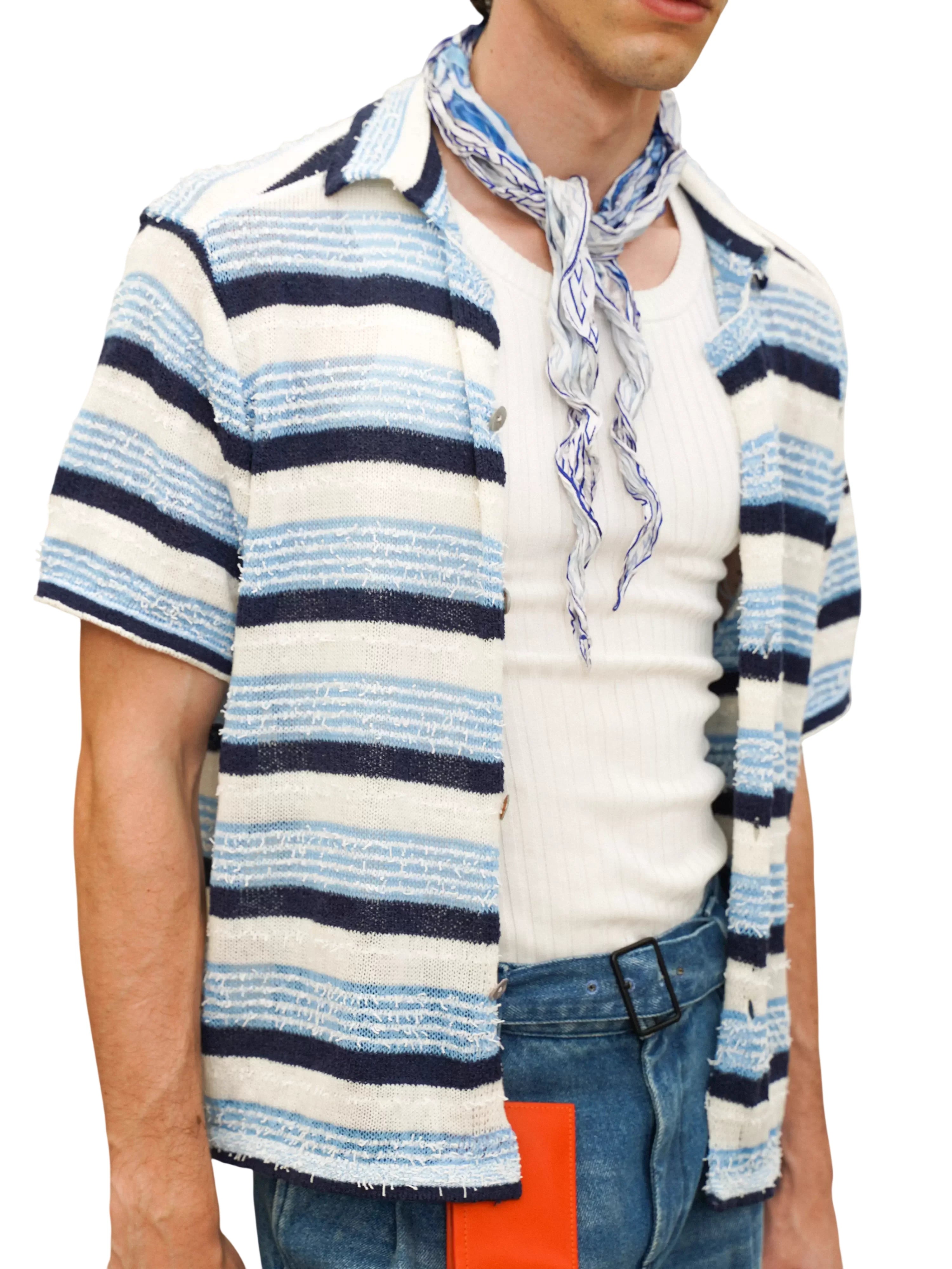 Elevate your summer style with this men's short sleeve knit polo shirt, designed with a bold colorblock and striped pattern in blue, navy, and off-white tones. The textured knit and open-front design offer breathability and comfort, while the polo collar adds a touch of refinement. Perfectly layered over a tank or worn solo, this shirt captures a relaxed yet fashionable look for warm-weather days.