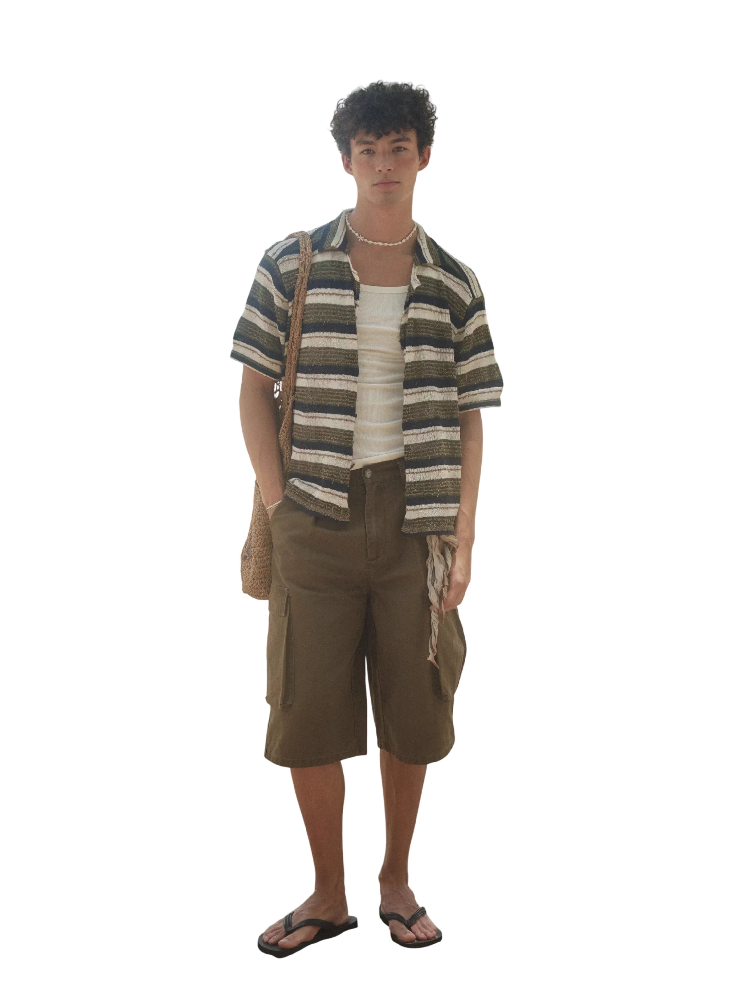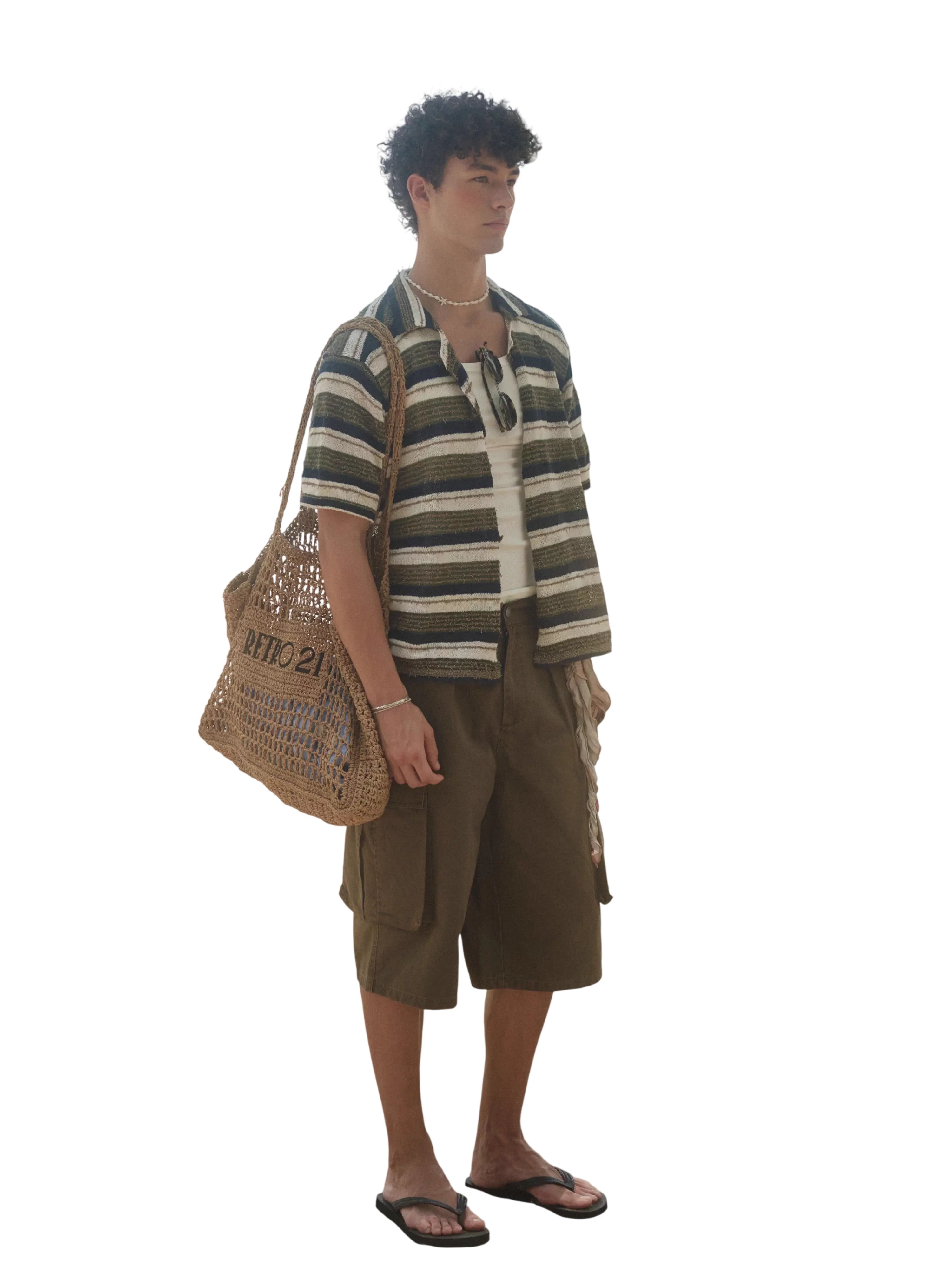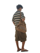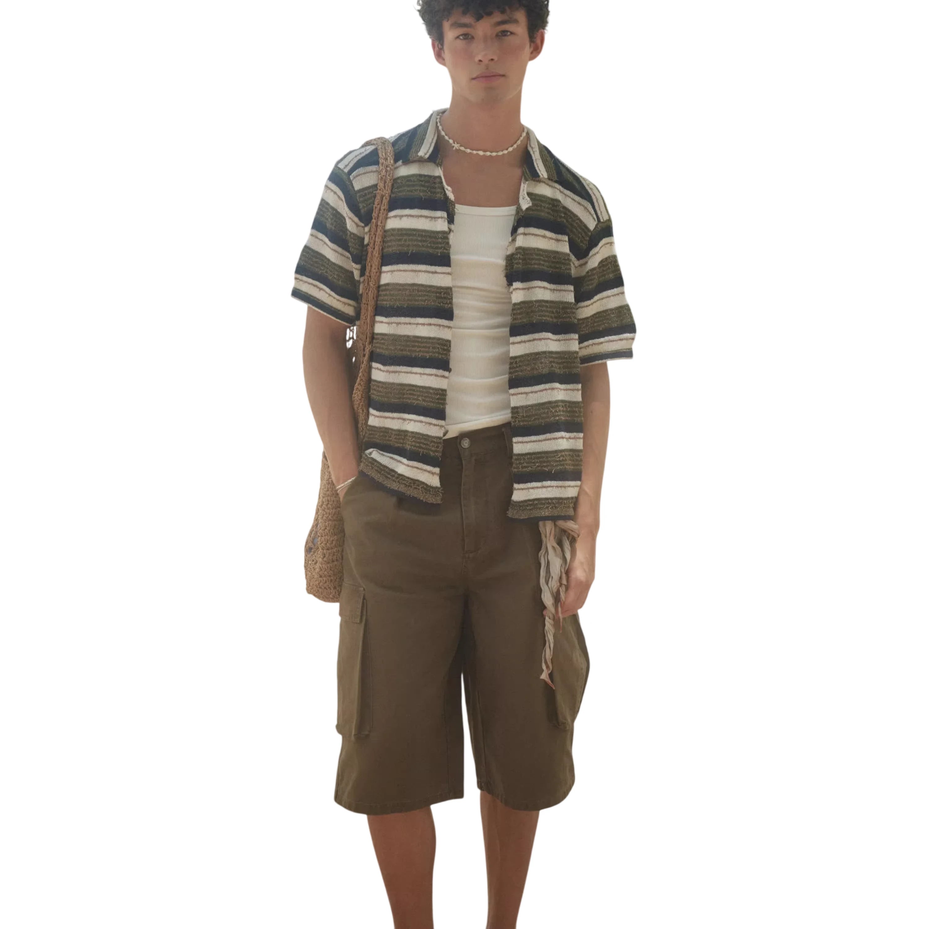 These men's cropped cotton pants feature a wide-leg silhouette and a rich dark brown tone. Crafted from durable cotton, they showcase a washed and distressed finish for a rugged, lived-in appeal. With functional pockets and a cropped length, they pair effortlessly with relaxed summer tops for a versatile, beach-ready look.