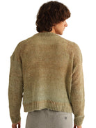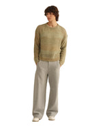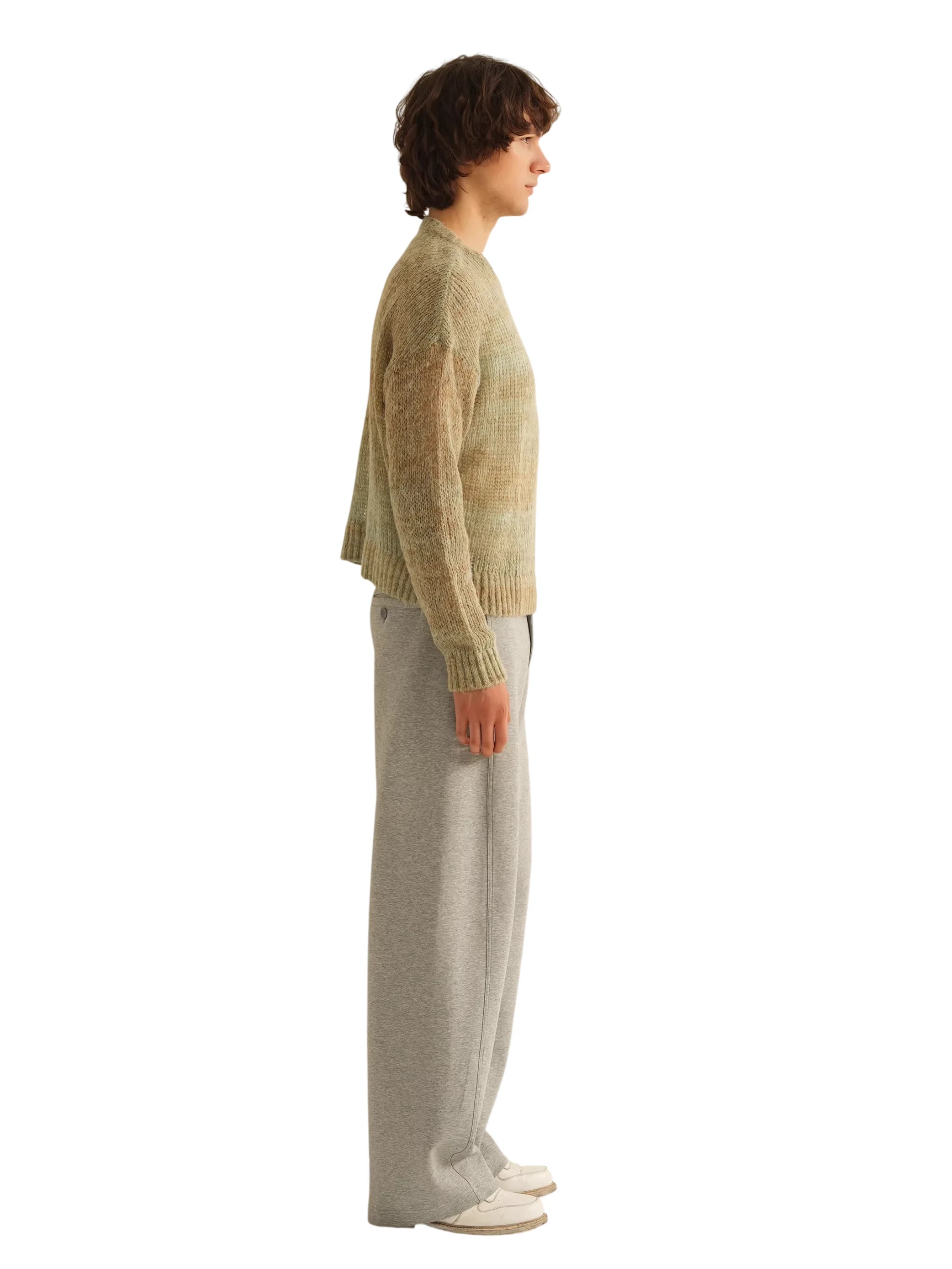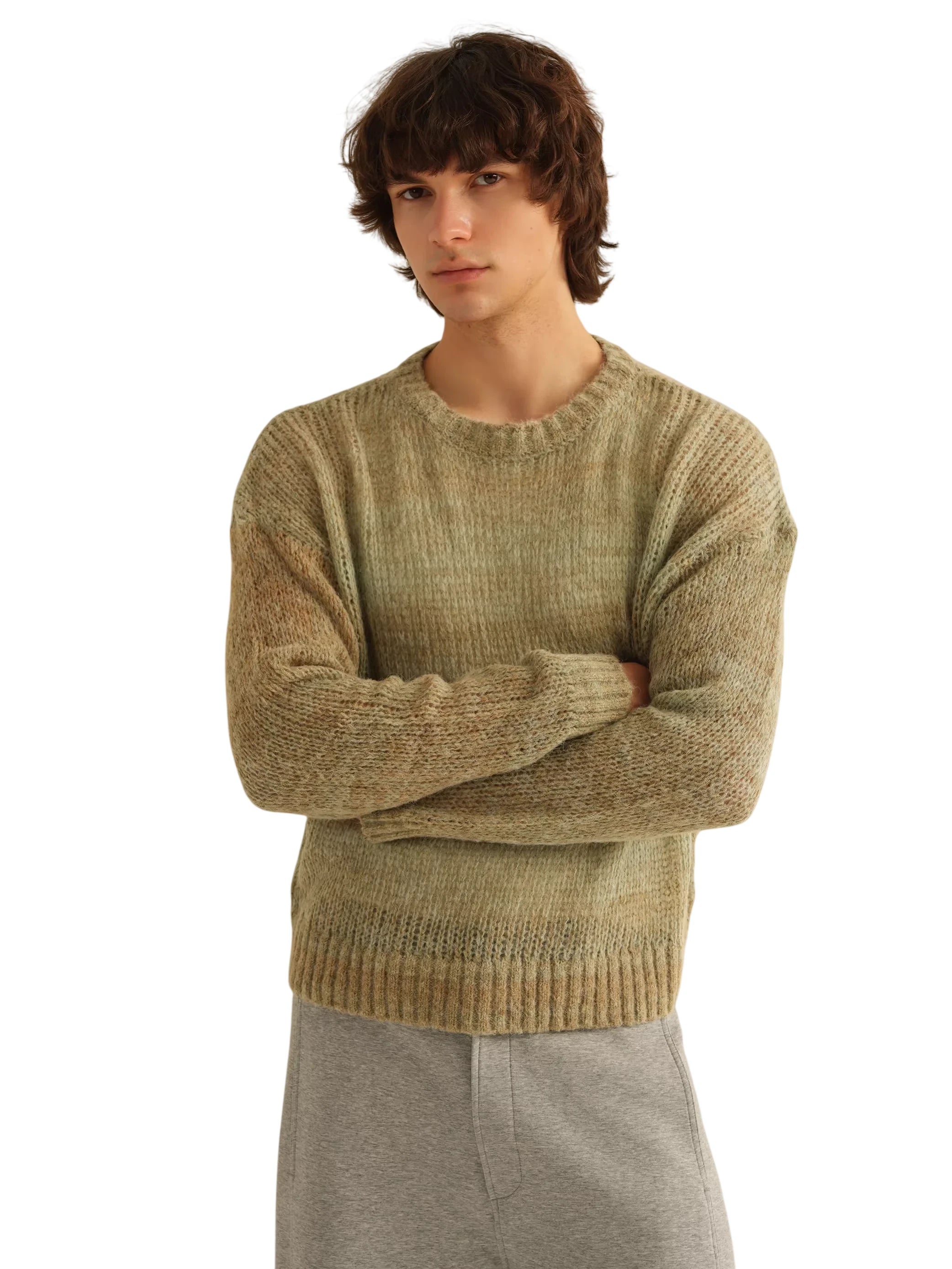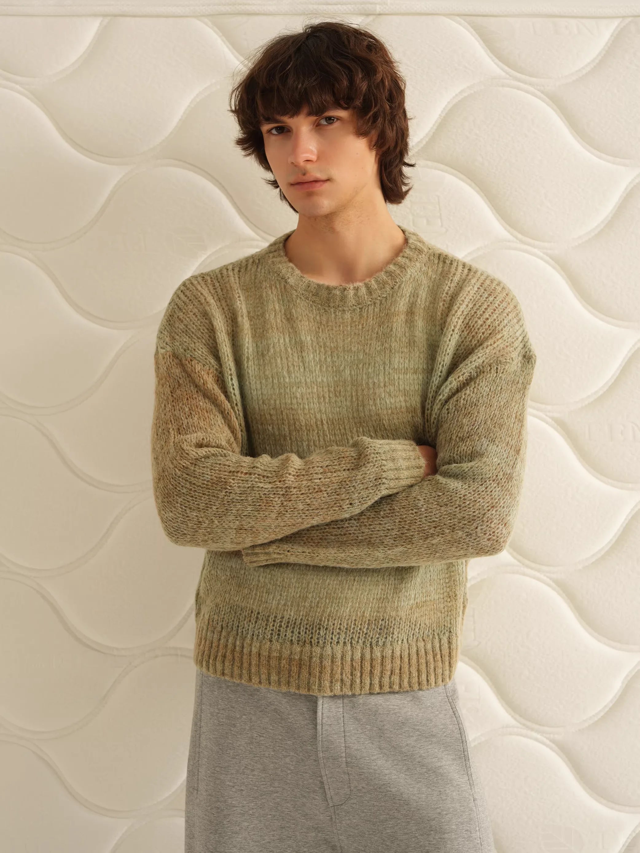 This men's crewneck sweater features a soft wool-blend knit with a distinct gradient design in earthy tones of green and brown. The sweater showcases a relaxed fit and a delicate open-knit texture, combining comfort and style. Perfect for casual wear, it pairs effortlessly with wide-leg pants and sneakers for a laid-back, modern look.